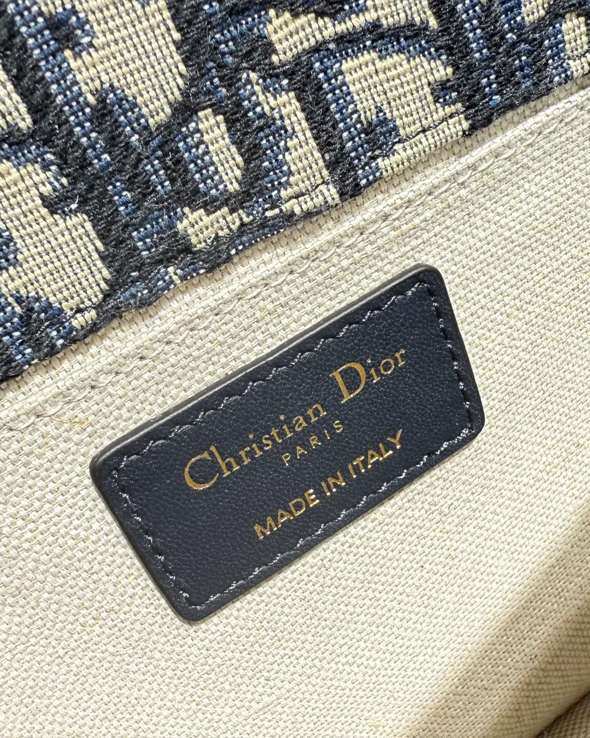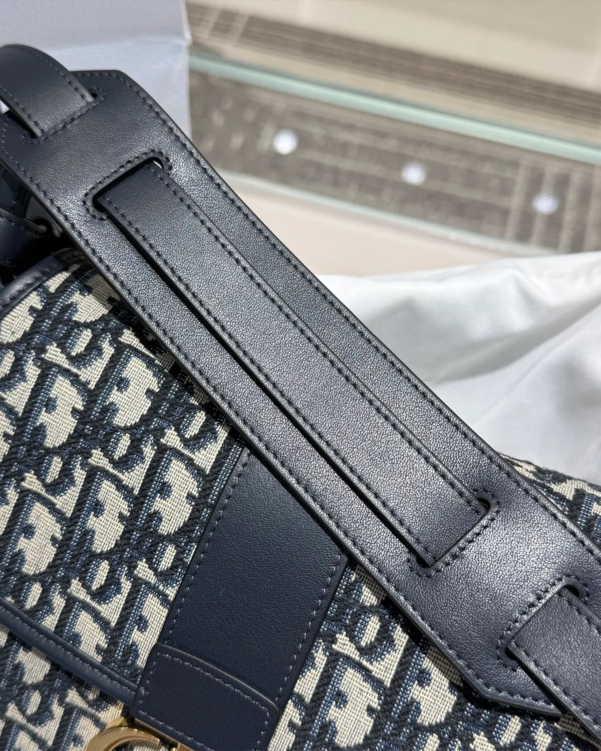 The body is crafted from the celebrated Oblique Jacquard, a pattern designed by Marc Bohan in 1967. The dense, textured embroidery in navy blue and beige offers durability and a rich tactile feel. It is framed by smooth leather trim, ensuring the boxy silhouette retains its crisp edges over time.