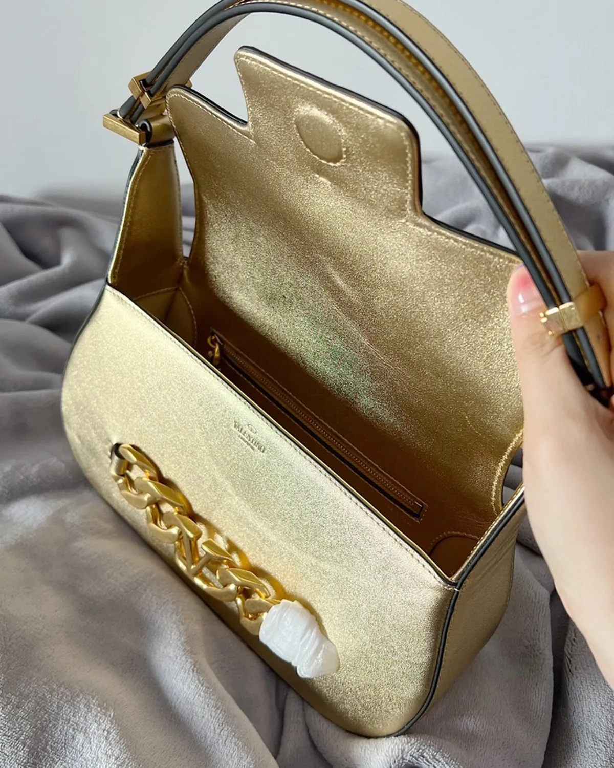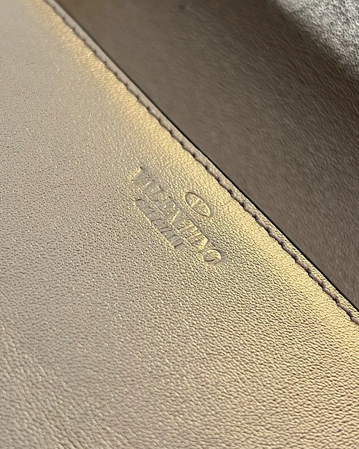 Al centro della patta spicca l’iconico logo V in metallo. Spesso rifinito in una tonalità ottone coordinata o in oro antico, funge da punto focale scultoreo. La chiusura magnetica sottostante garantisce sicurezza e facilità d’uso, mantenendo la silhouette pulita e ininterrotta.