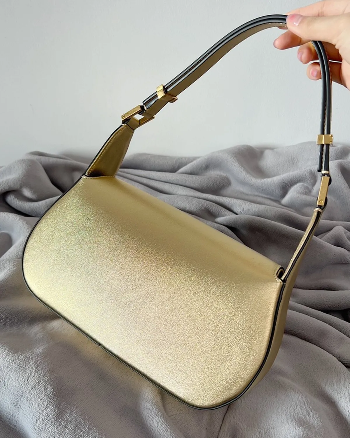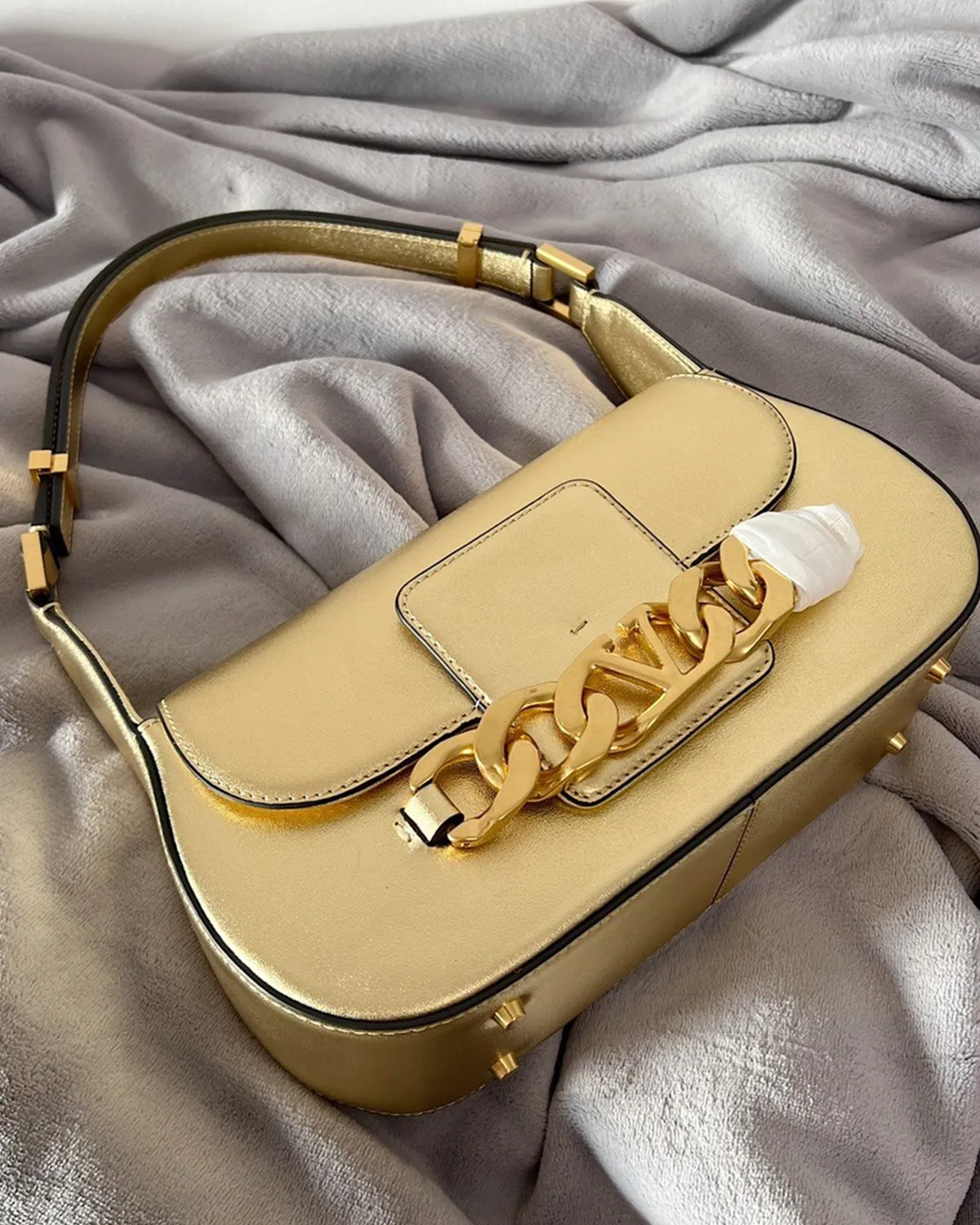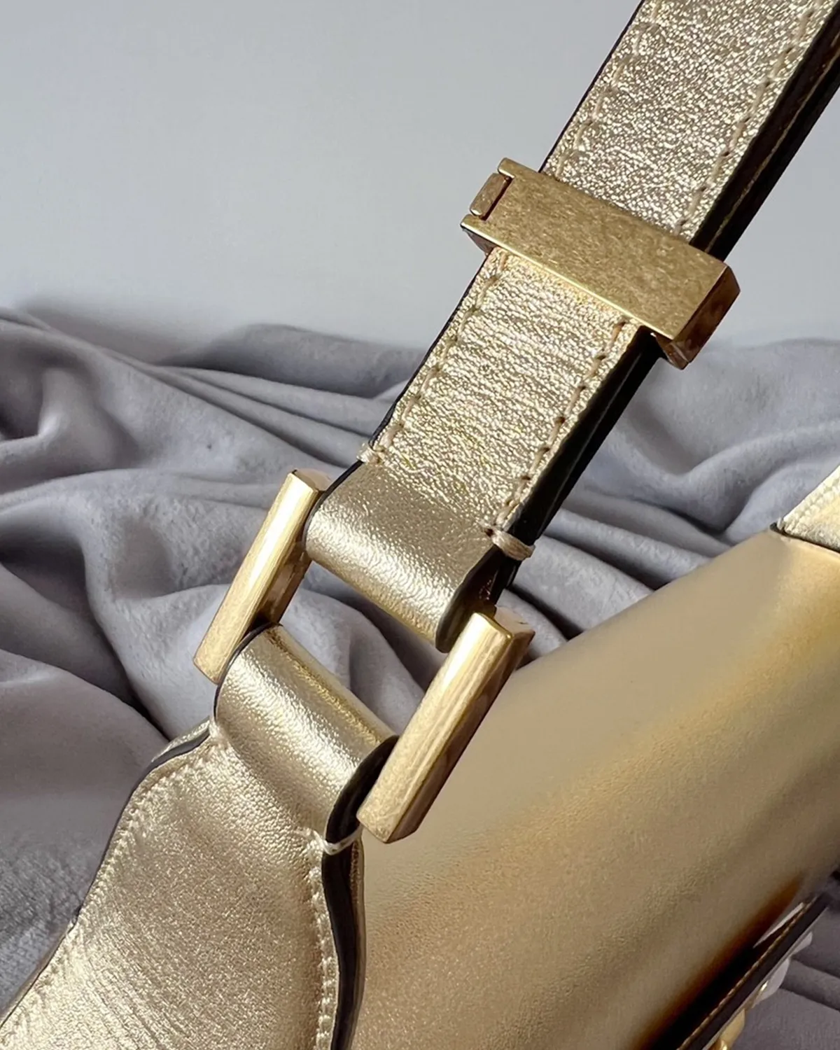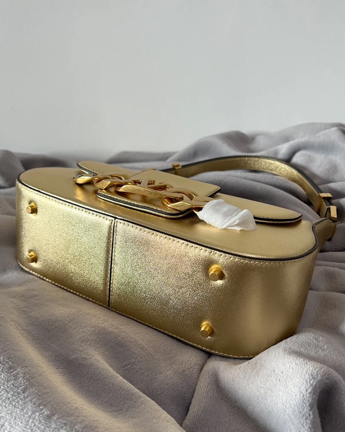 La Borsa a Spalla Signature Metallizzata in color Ottone trasforma un accessorio funzionale in un vero e proprio gioiello da indossare. Catturando la luce da ogni angolazione, la finitura laminata offre una profondità calda e ricca, evocando l’opulenza dell’Art Déco con un tocco di modernità grintosa. È pensata per la donna che vuole brillare, letteralmente.