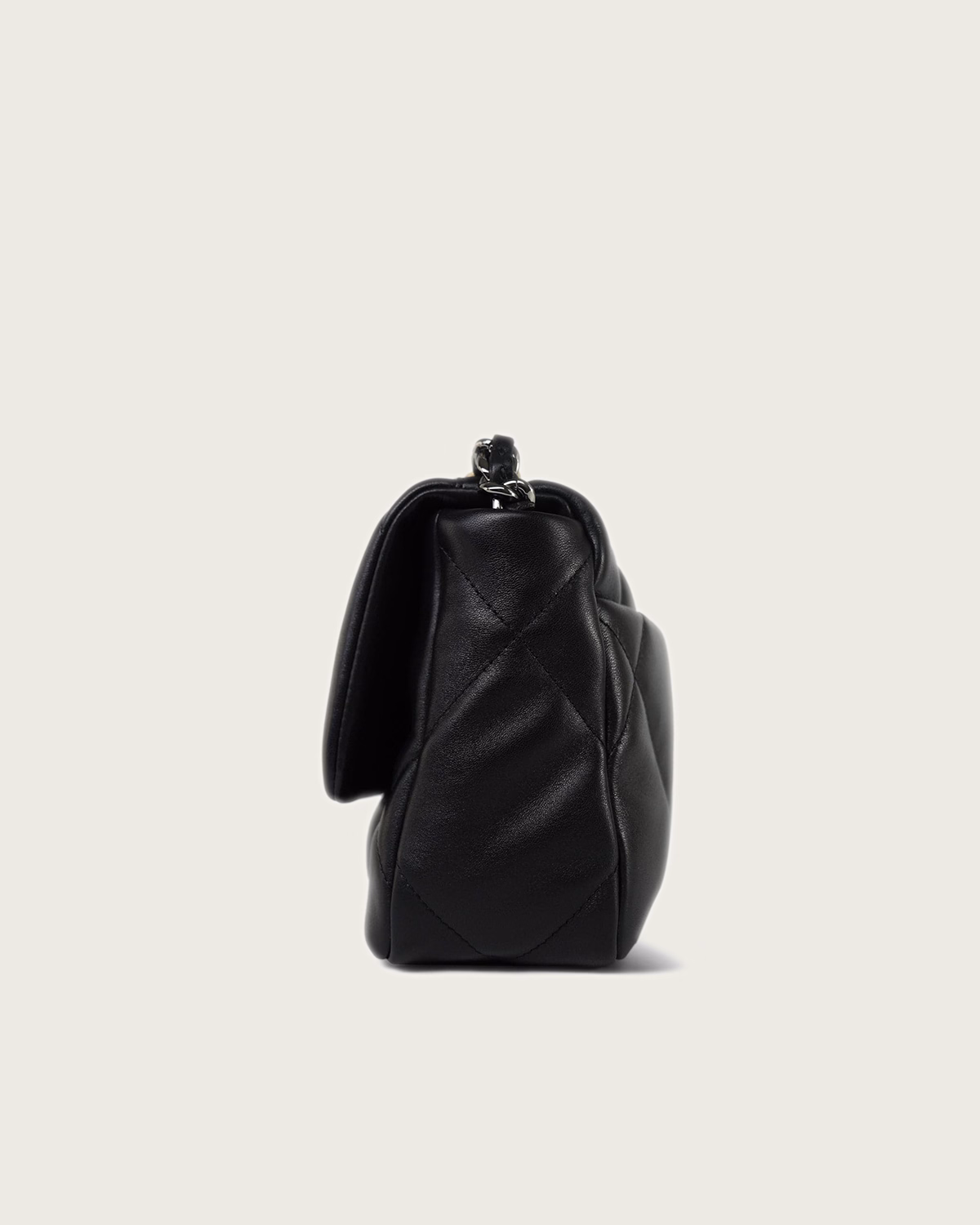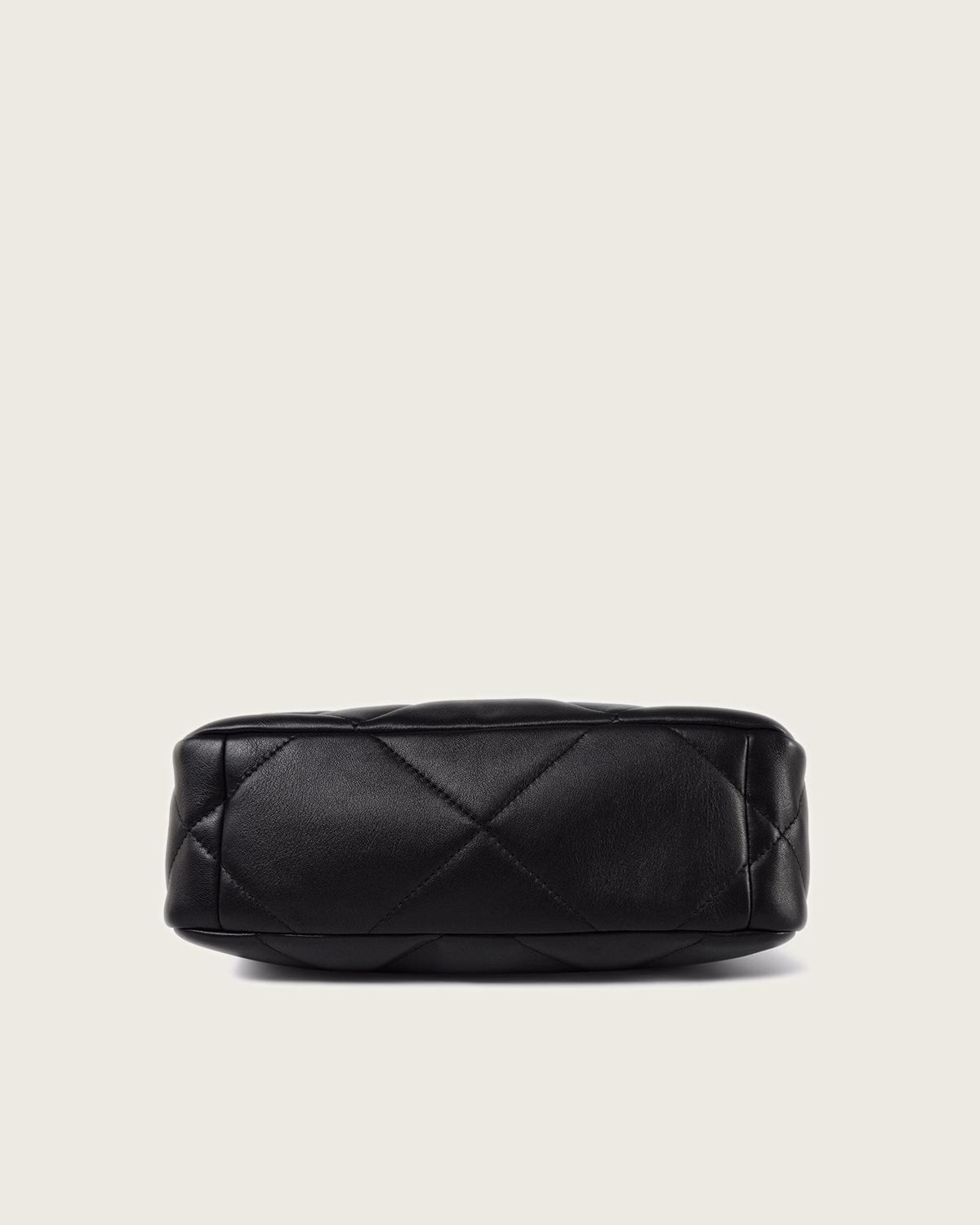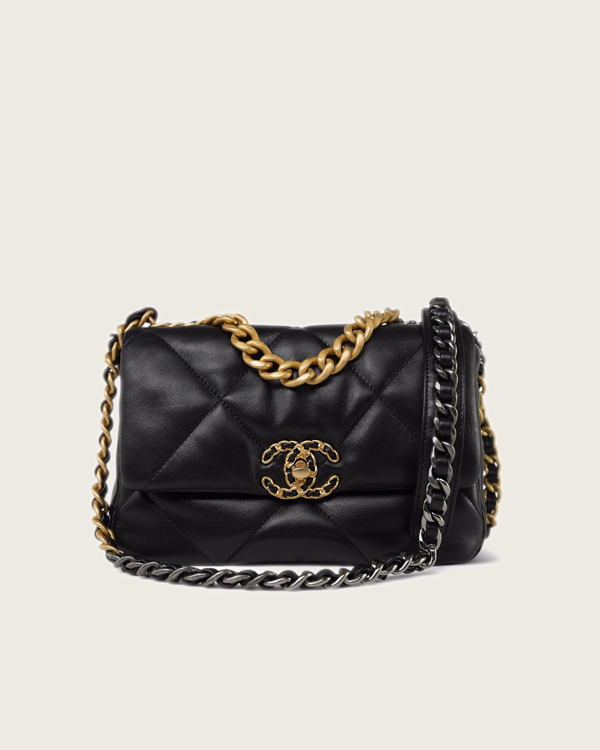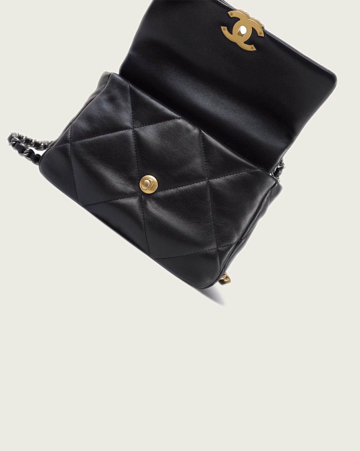 The Chanel 19 Small Flap Bag in black quilted lambskin brings together the elegance of Chanel heritage with a bold, contemporary edge. Designed with oversized diamond quilting, the plush lambskin leather offers a rich, supple feel and luxurious finish.