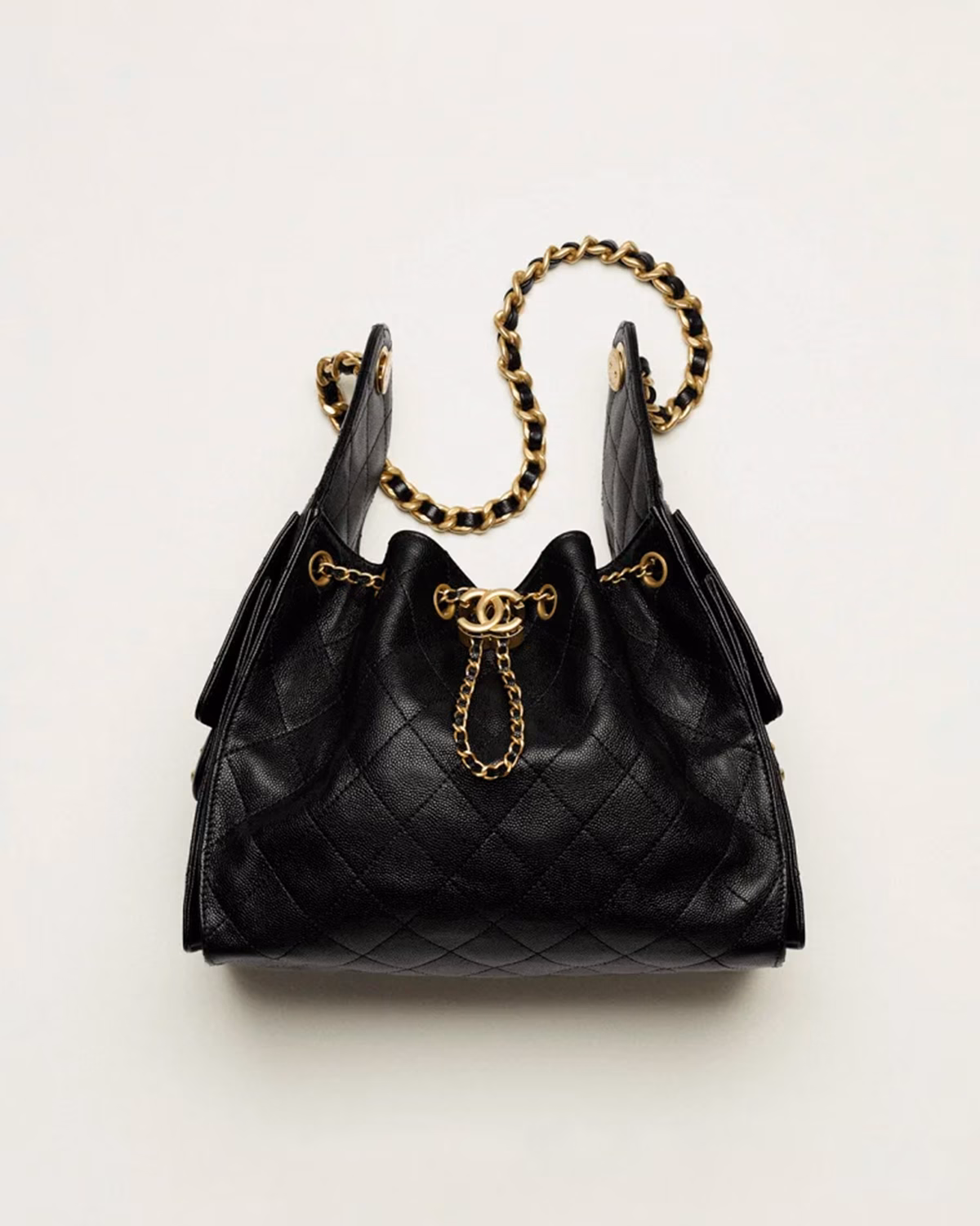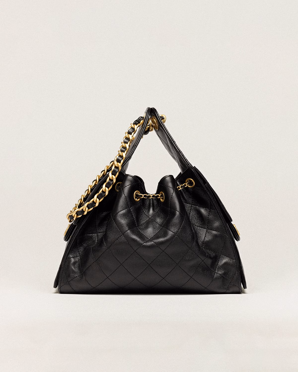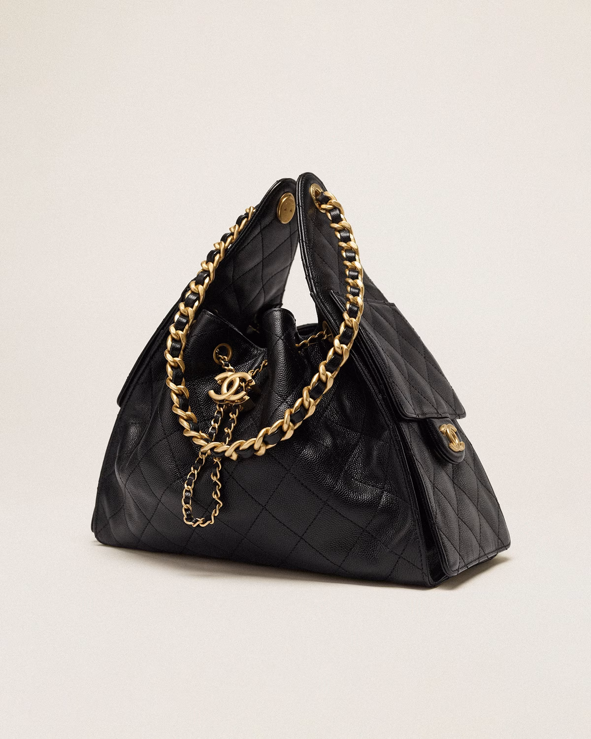 Crafted from durable caviar leather, the exterior is finished with signature diamond quilting, a leather-woven gold-tone chain strap, and the iconic interlocking CC turn-lock closure. Inside, the double flap design includes multiple compartments for organizing essentials such as a smartphone, cardholder, compact mirror, and keys.