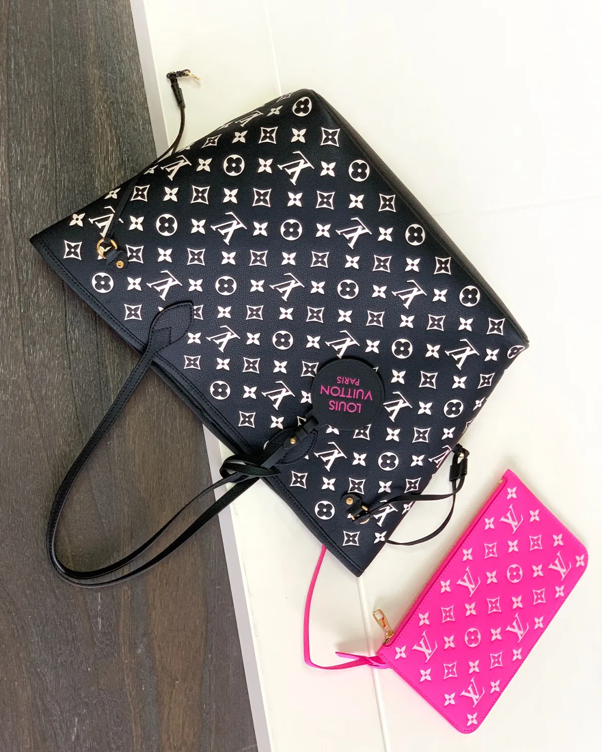 The Bi-Color Embossed Tote transforms the everyday shopper into a piece of high fashion. By replacing traditional canvas with deep, grained leather, it gains a softness and structure that feels incredibly premium. The oversized, beige-embossed motifs against the black background create a visual impact that is both timeless and trend-setting.