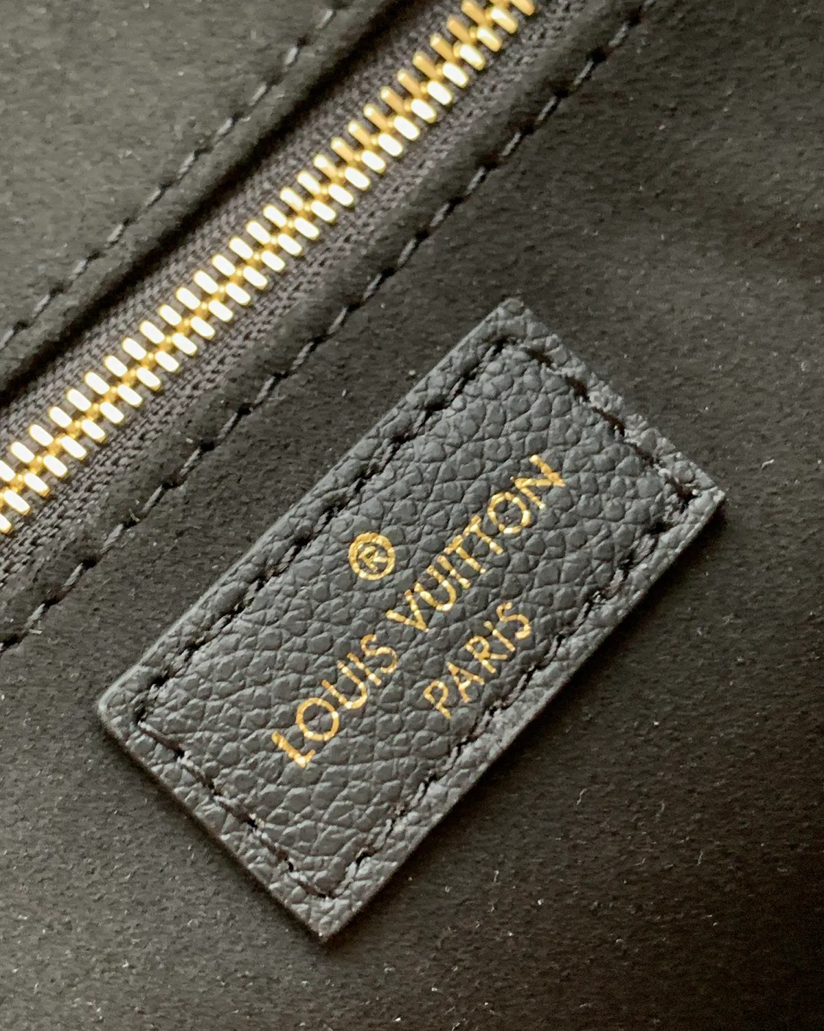 The body is crafted from “Empreinte” style leather, known for its pebbled texture and durability. The iconic monogram pattern is deeply embossed into the hide and then highlighted in a creamy beige tone. This tactile relief adds depth and luxury that printed canvas simply cannot match.