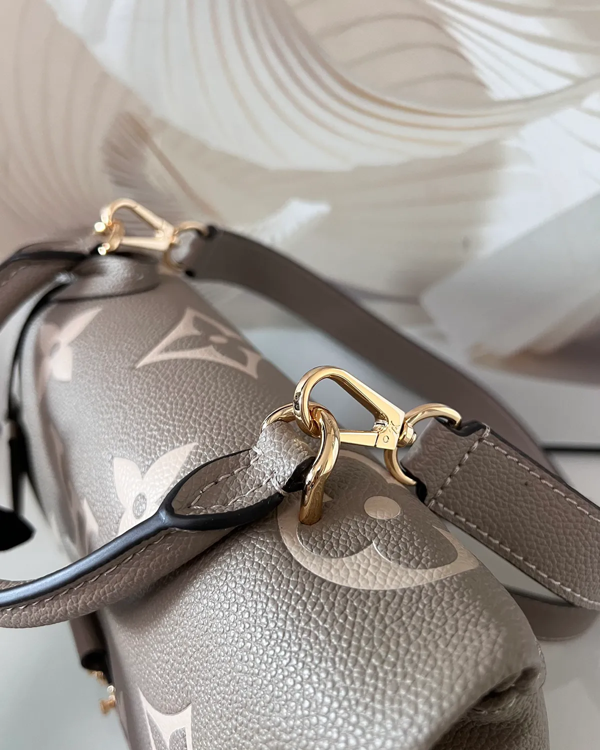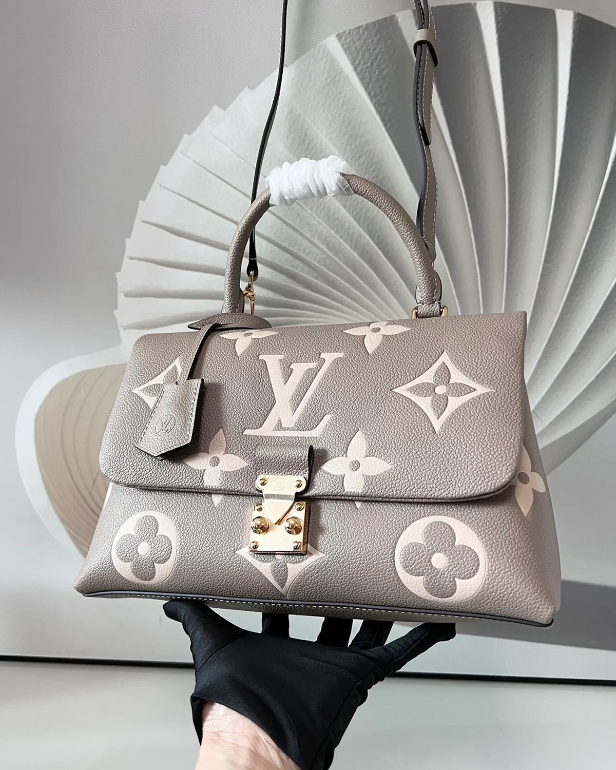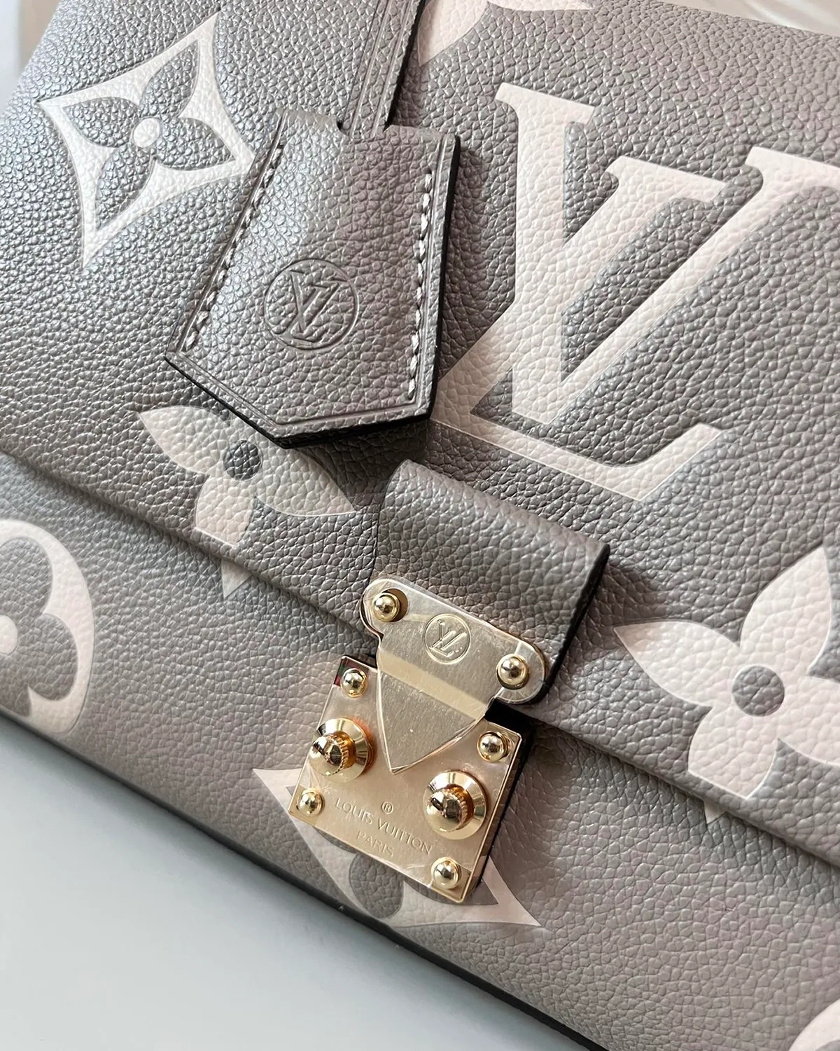 The bag is crafted from “Empreinte” style grained leather, renowned for its soft feel and durability. The Giant Monogram pattern is embossed deeply into the black leather and highlighted in a creamy beige tone. This high-contrast technique brings the iconic motifs to life, creating a visual texture that is both tactile and luxurious.