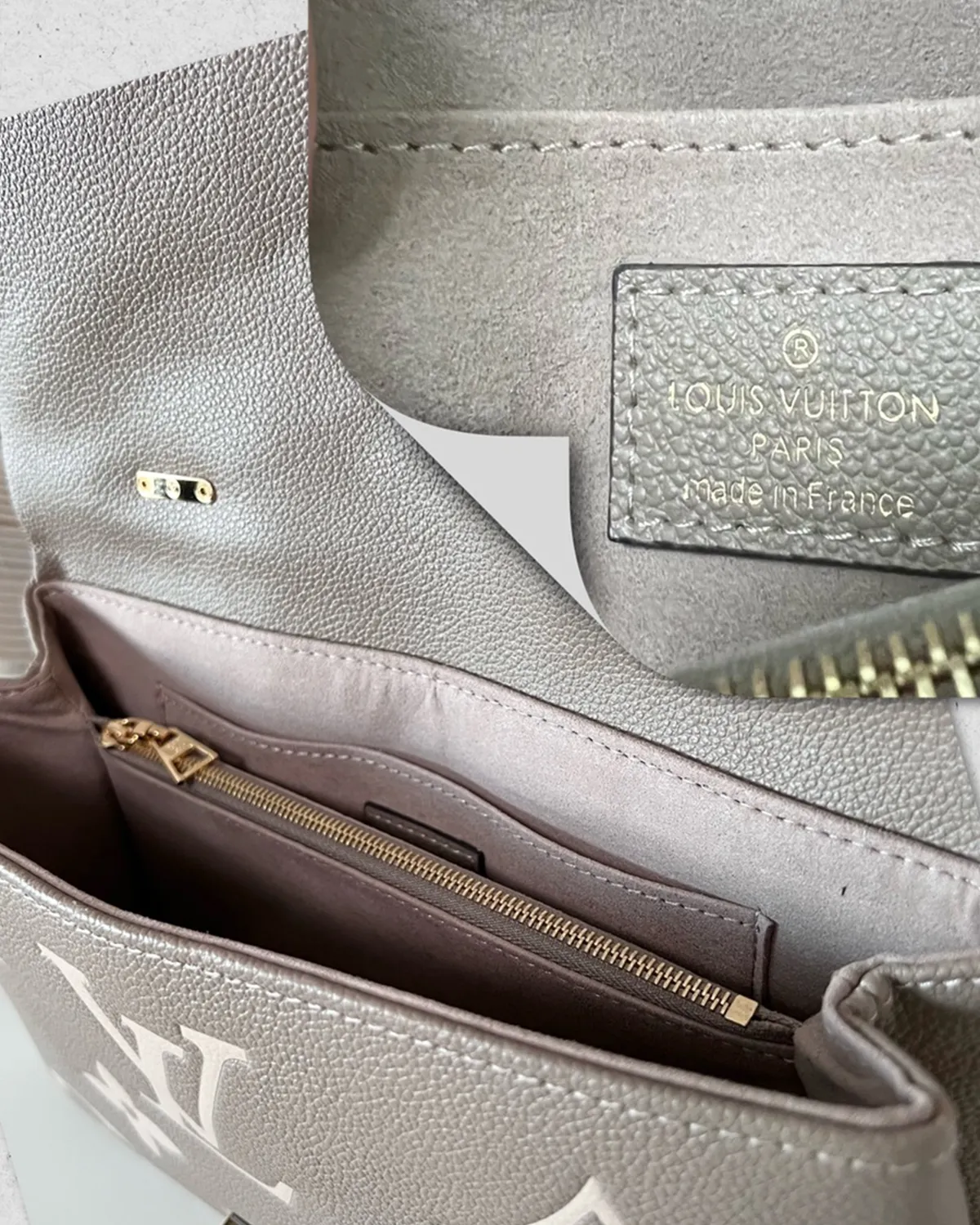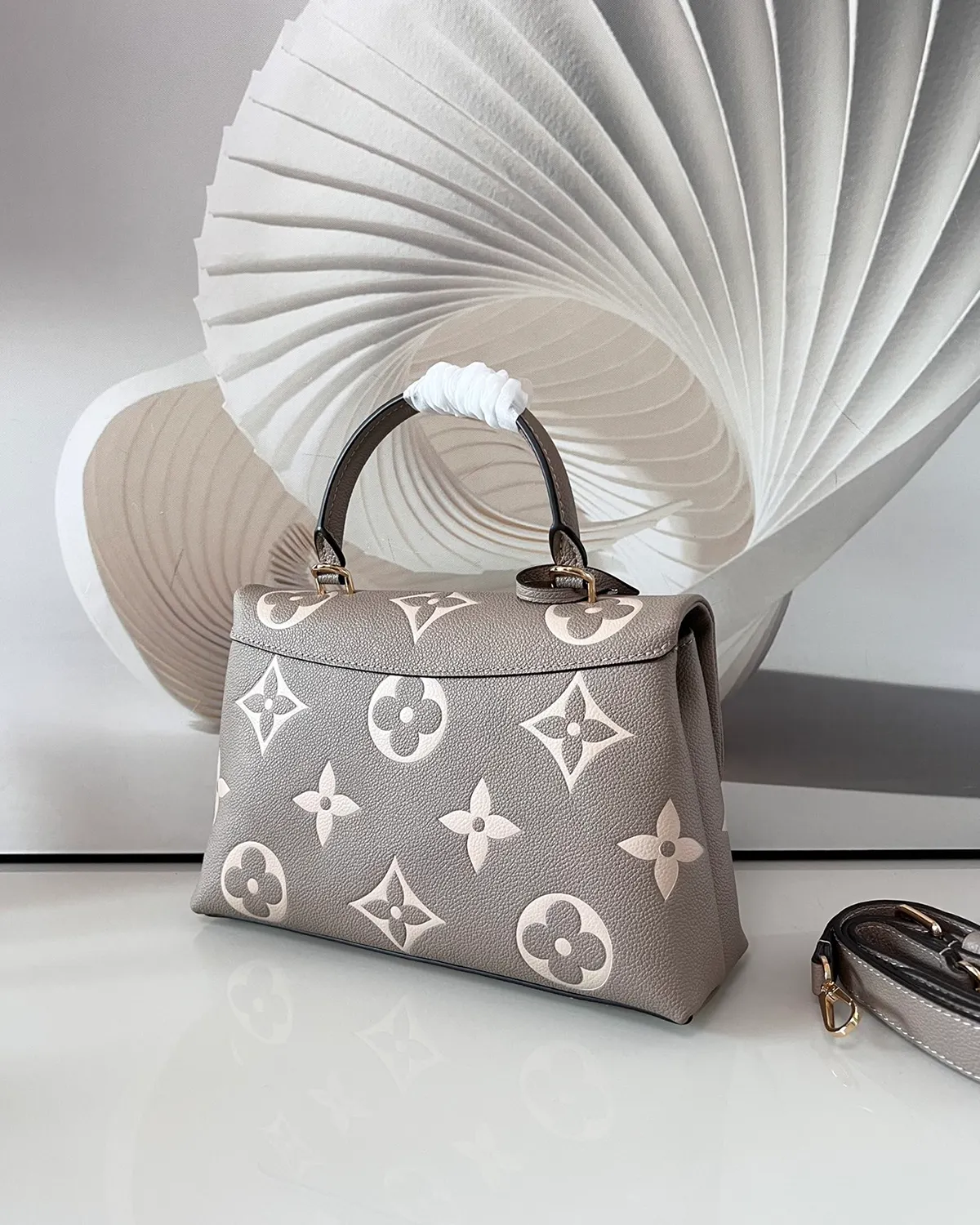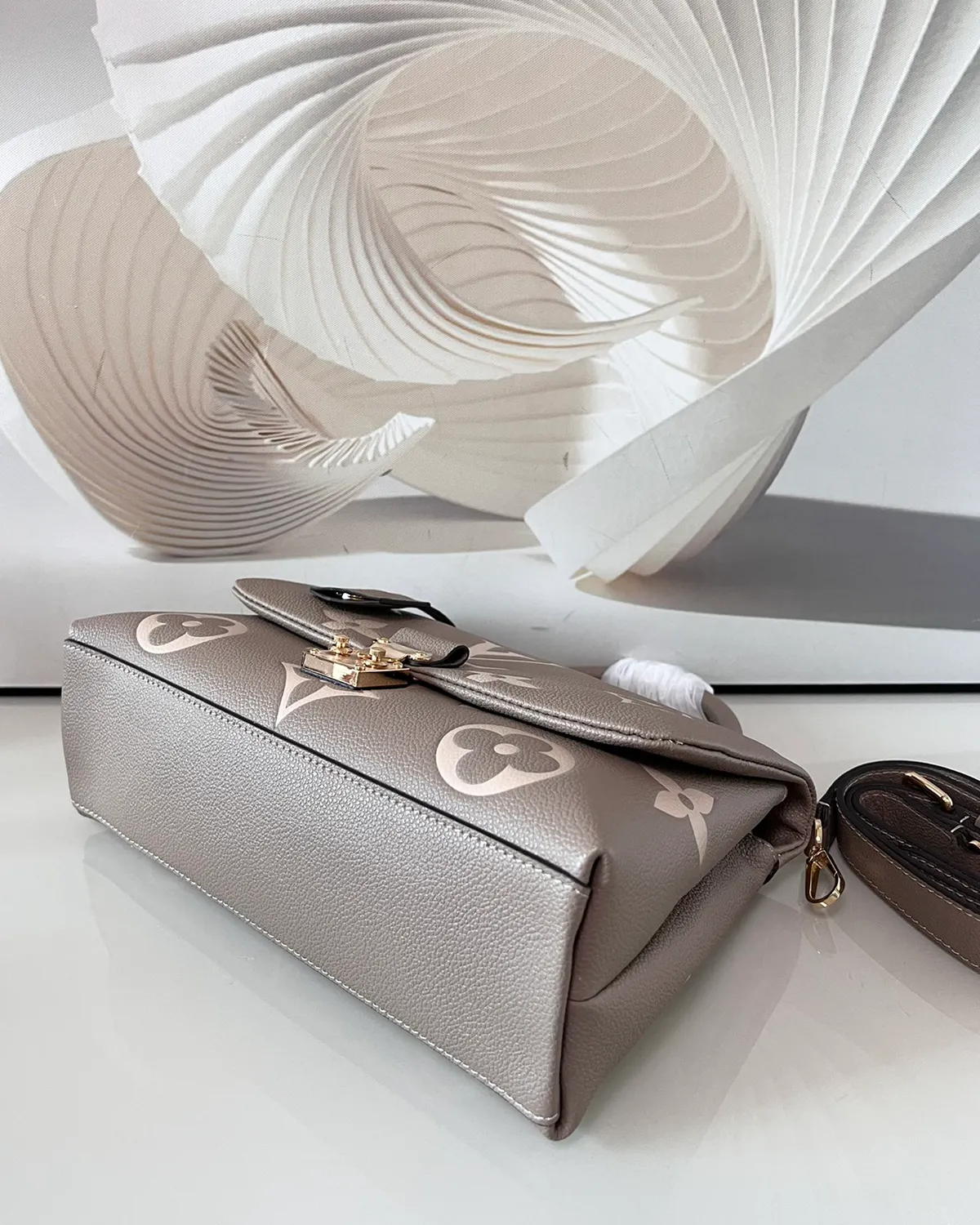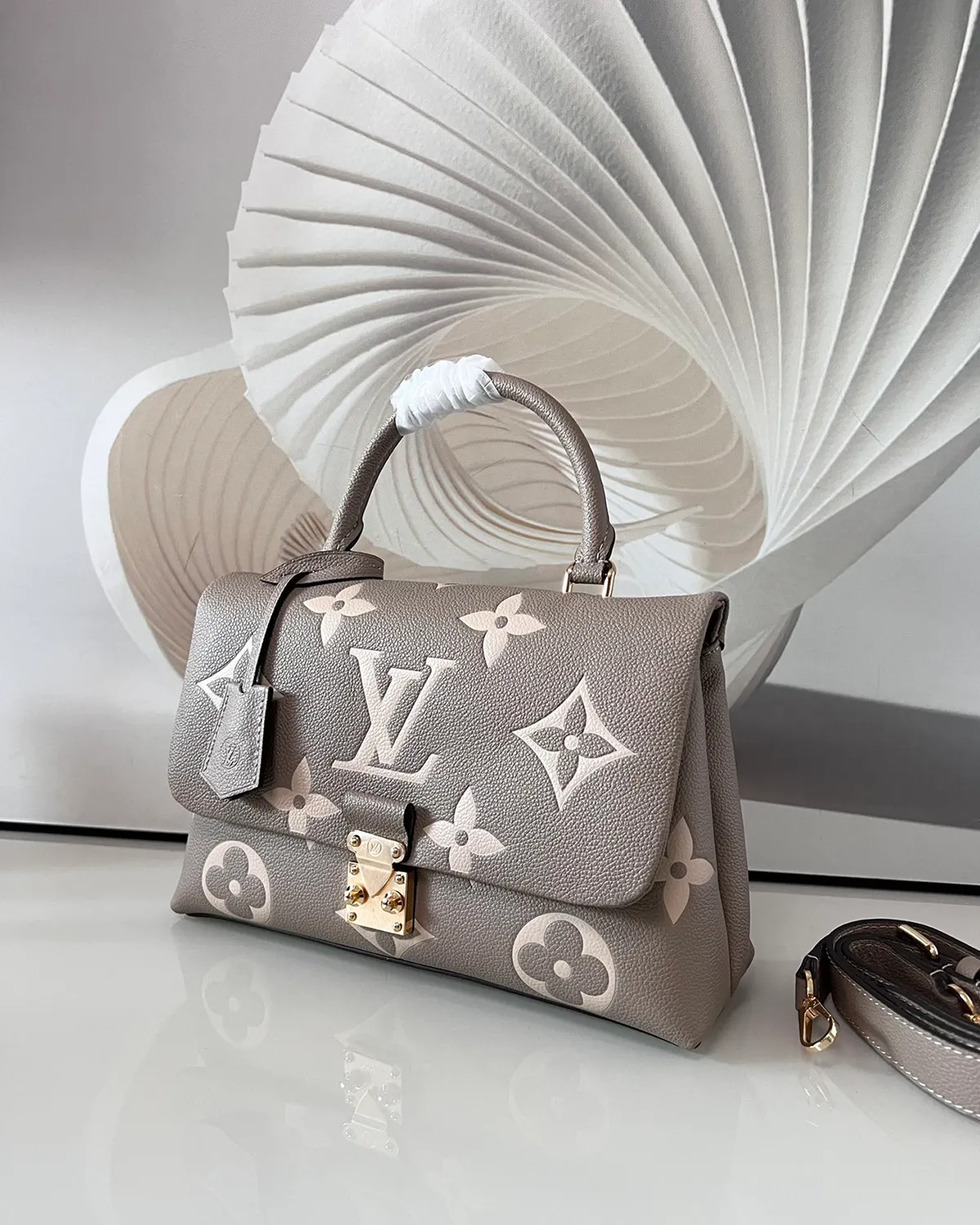 The bag is crafted from “Empreinte” style grained leather, renowned for its soft feel and durability. The Giant Monogram pattern is embossed deeply into the black leather and highlighted in a creamy beige tone. This high-contrast technique brings the iconic motifs to life, creating a visual texture that is both tactile and luxurious.