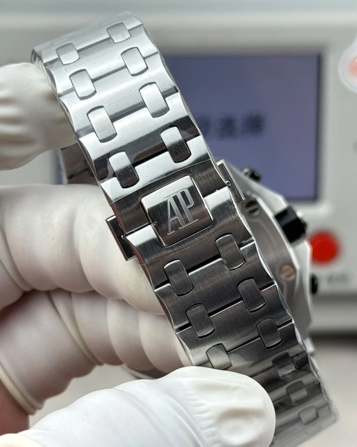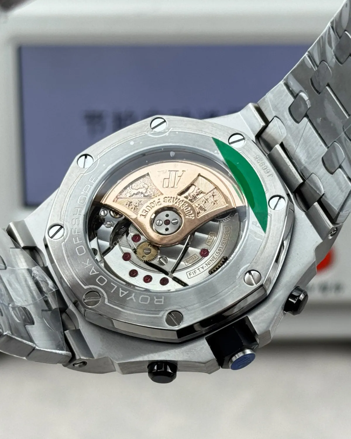 The 42mm case feels incredibly solid. It is paired with a heavy-duty integrated steel bracelet that gives the watch significant presence and weight. The solid caseback is engraved with the “Royal Oak Offshore” logo, just like the 1993 piece, hiding the anti-magnetic soft-iron inner cage within.