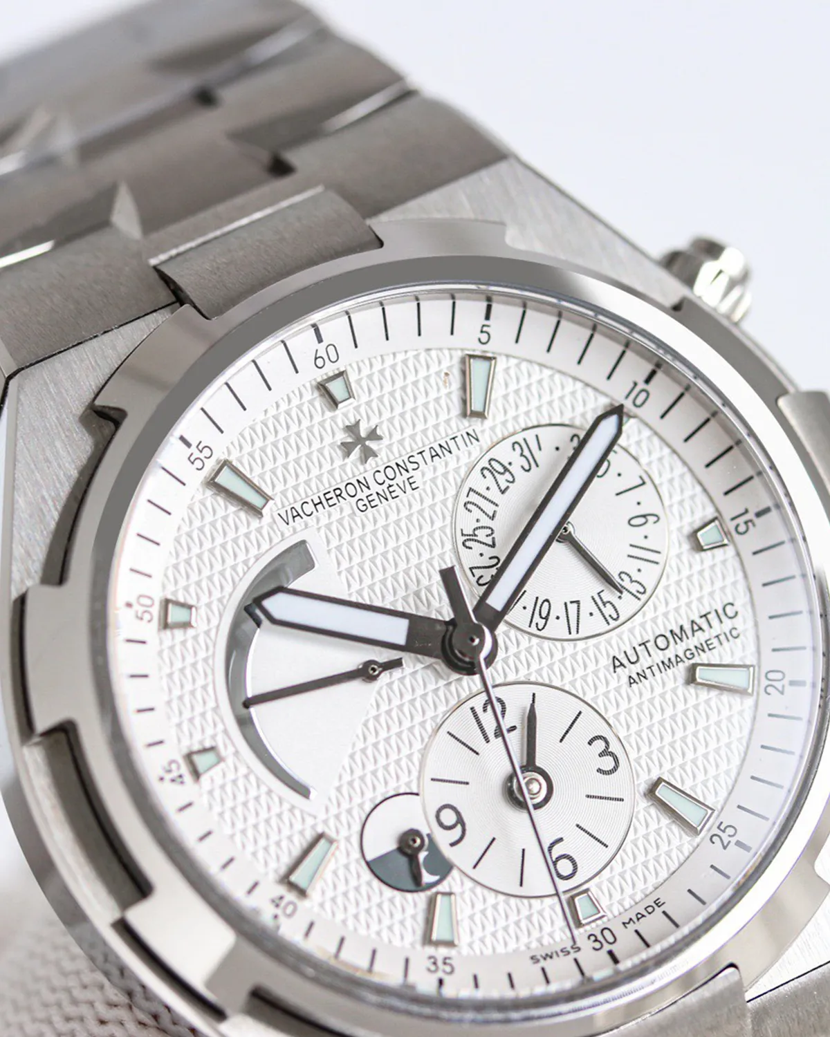 The Overseas Dual Time “Clous de Paris” elevates the standard sport watch into the realm of decorative art. While most sport watches feature flat or sunburst dials, this model introduces a complex guilloché pattern usually reserved for dress watches. The tiny pyramids of the “Clous de Paris” texture catch the light in a unique way, giving the dial a mesmerizing, matte-yet-sparkling appearance.