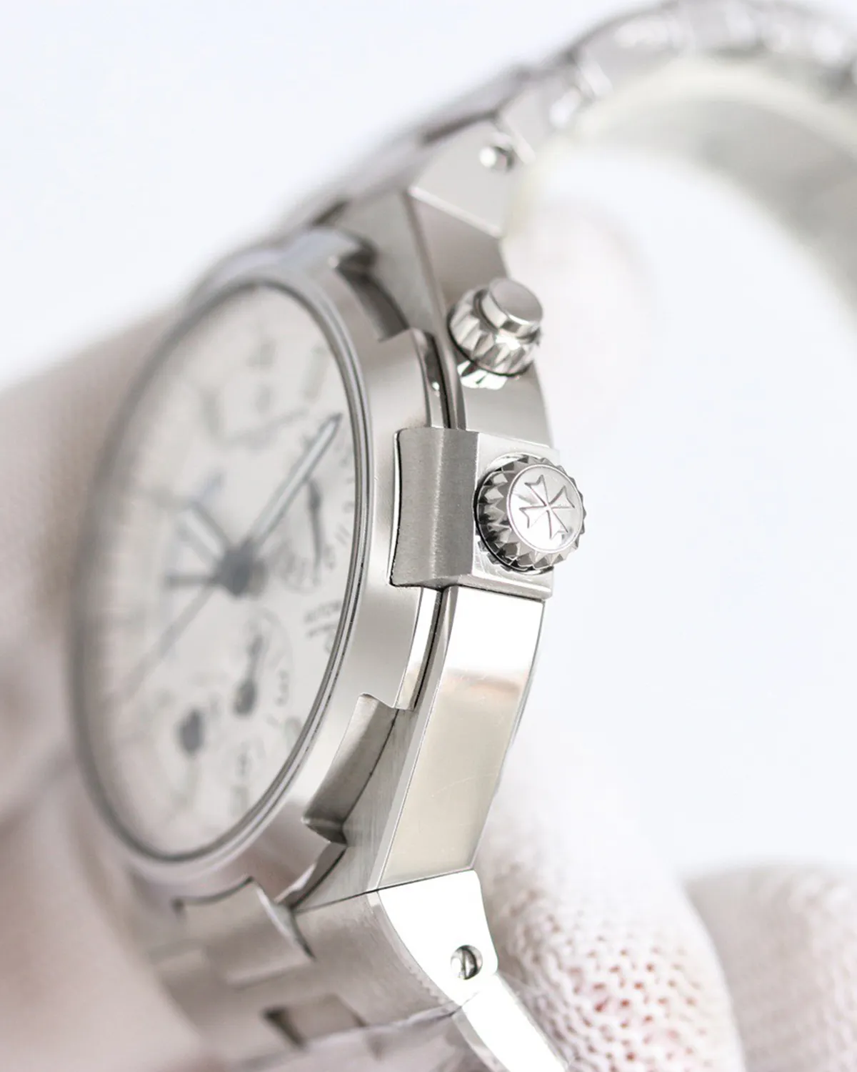 The 42mm stainless steel case features the iconic bezel inspired by the Maltese Cross. The integrated bracelet is a masterpiece of finishing, with half-Maltese cross links that are brushed on top and polished on the inner angles, reflecting light with every movement of the wrist.