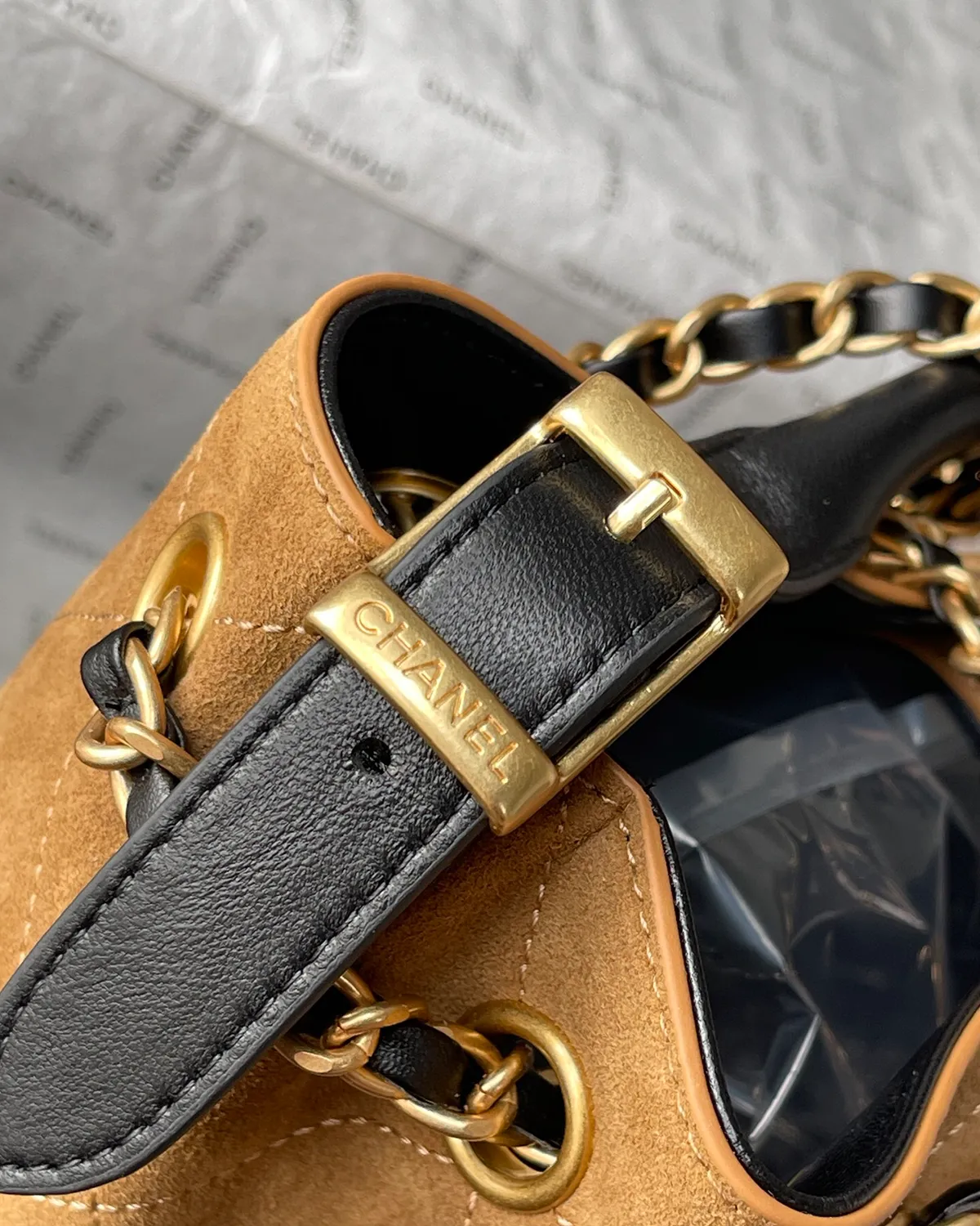 The body features the house’s signature “Diamond” quilting (Matelassé). This stitching technique was originally inspired by the jackets worn by stable boys and has since become a symbol of luxury. On the beige suede, the quilting creates a soft, plush depth that feels incredibly luxurious to the touch.