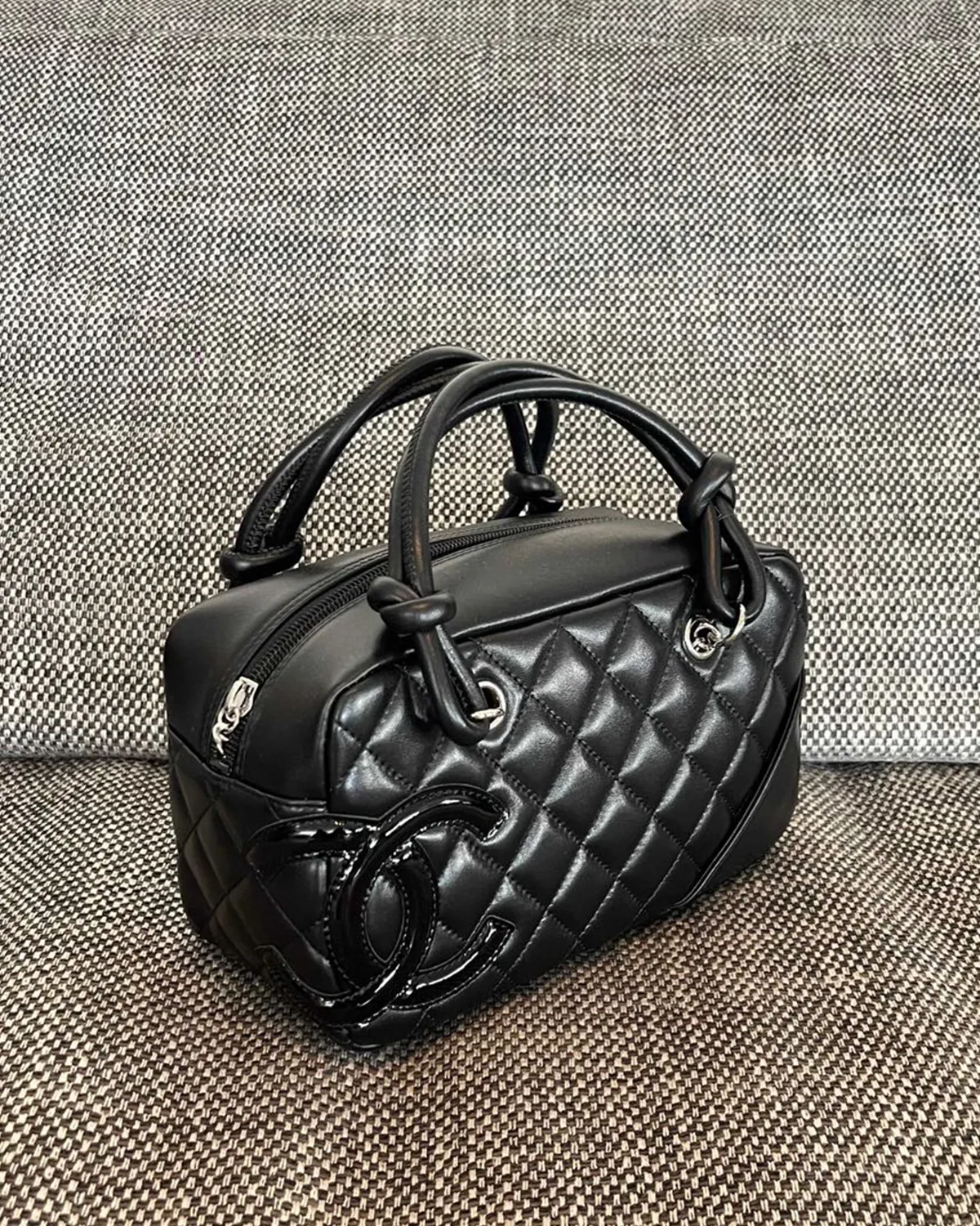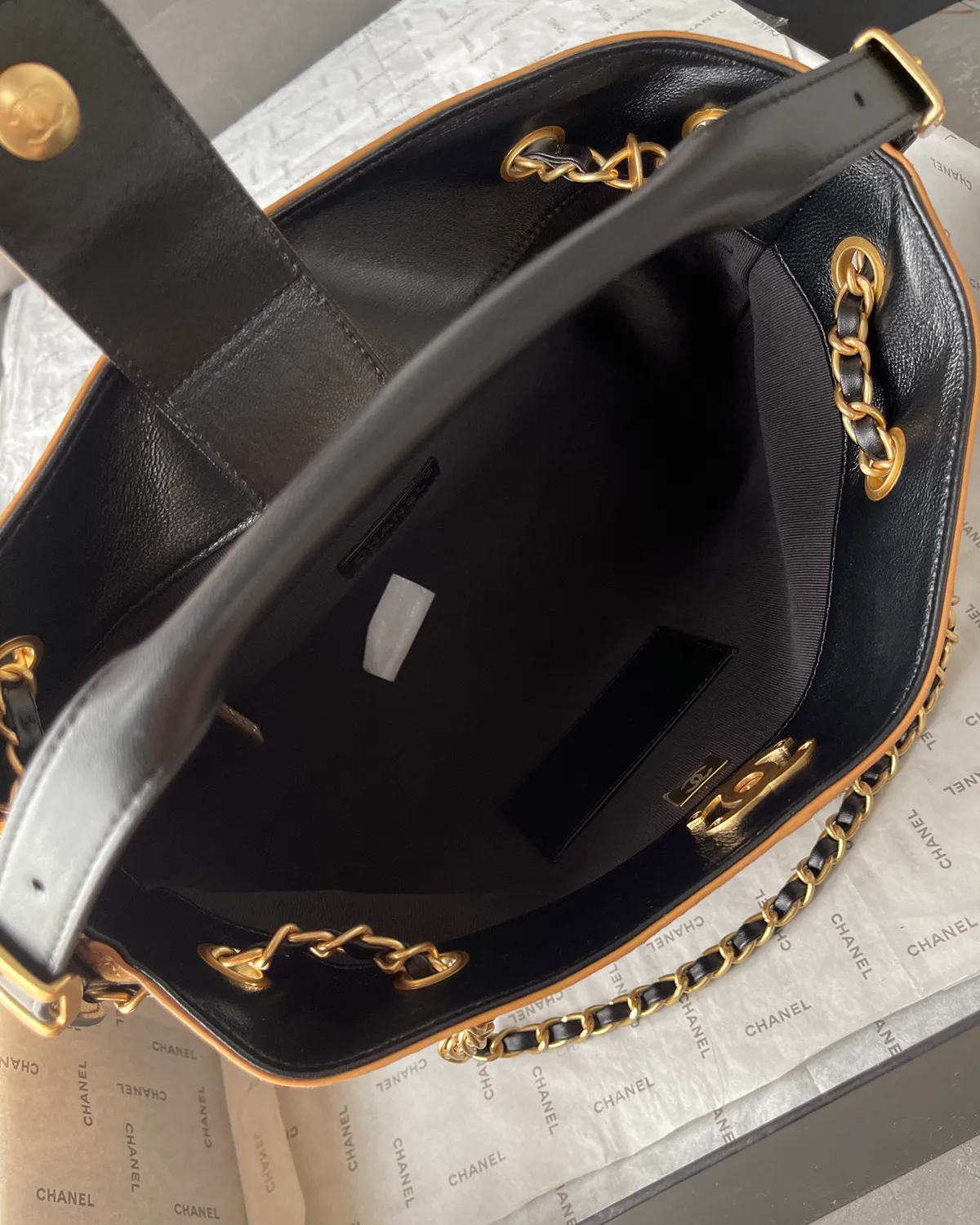 A discreet yet powerful interlocking logo charm hangs from the handle in polished gold-tone metal. It is the seal of the “Grand Maison.” Inside, the bag is often lined with a signature red or burgundy textile, a hidden detail meant to help you find your belongings easily within the bag.