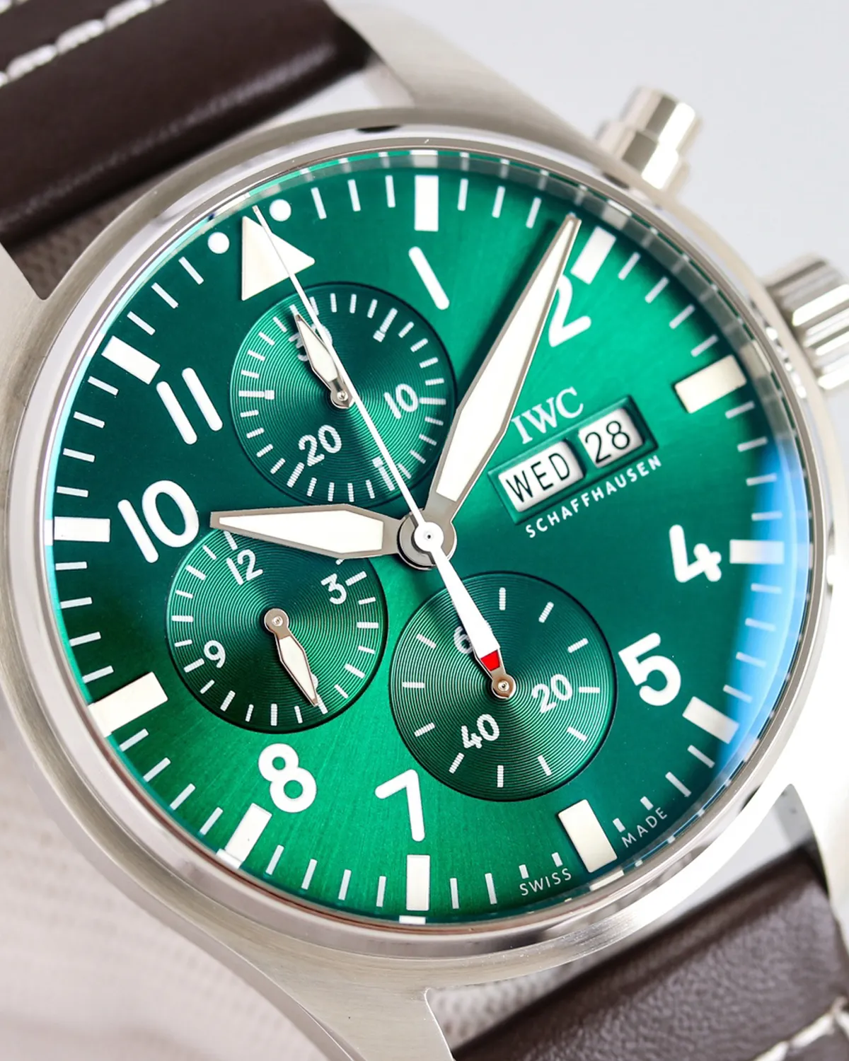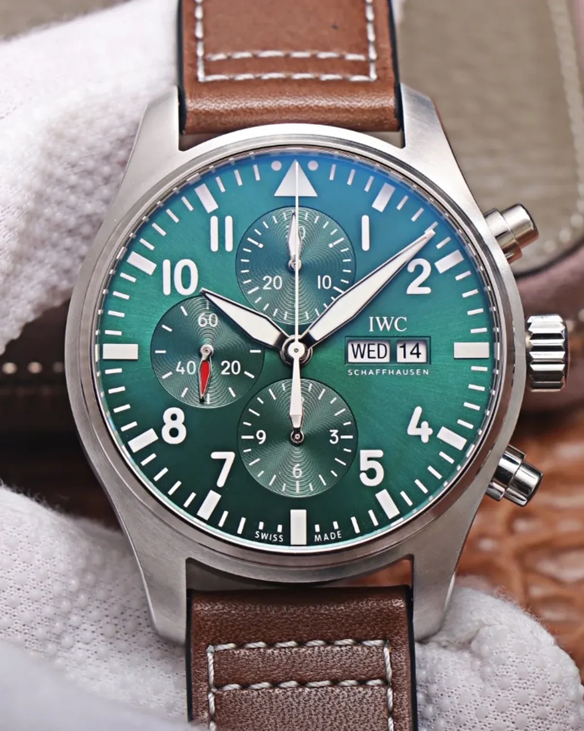 The Pilot’s Watch Chronograph 41 answers the call for a more wearable, contemporary aviator’s watch. By reducing the case size to 41mm, this model retains the rugged instrument look of the original while offering a refined fit that slides easily under a cuff. The rich forest green dial adds a layer of modern luxury to the utilitarian design.