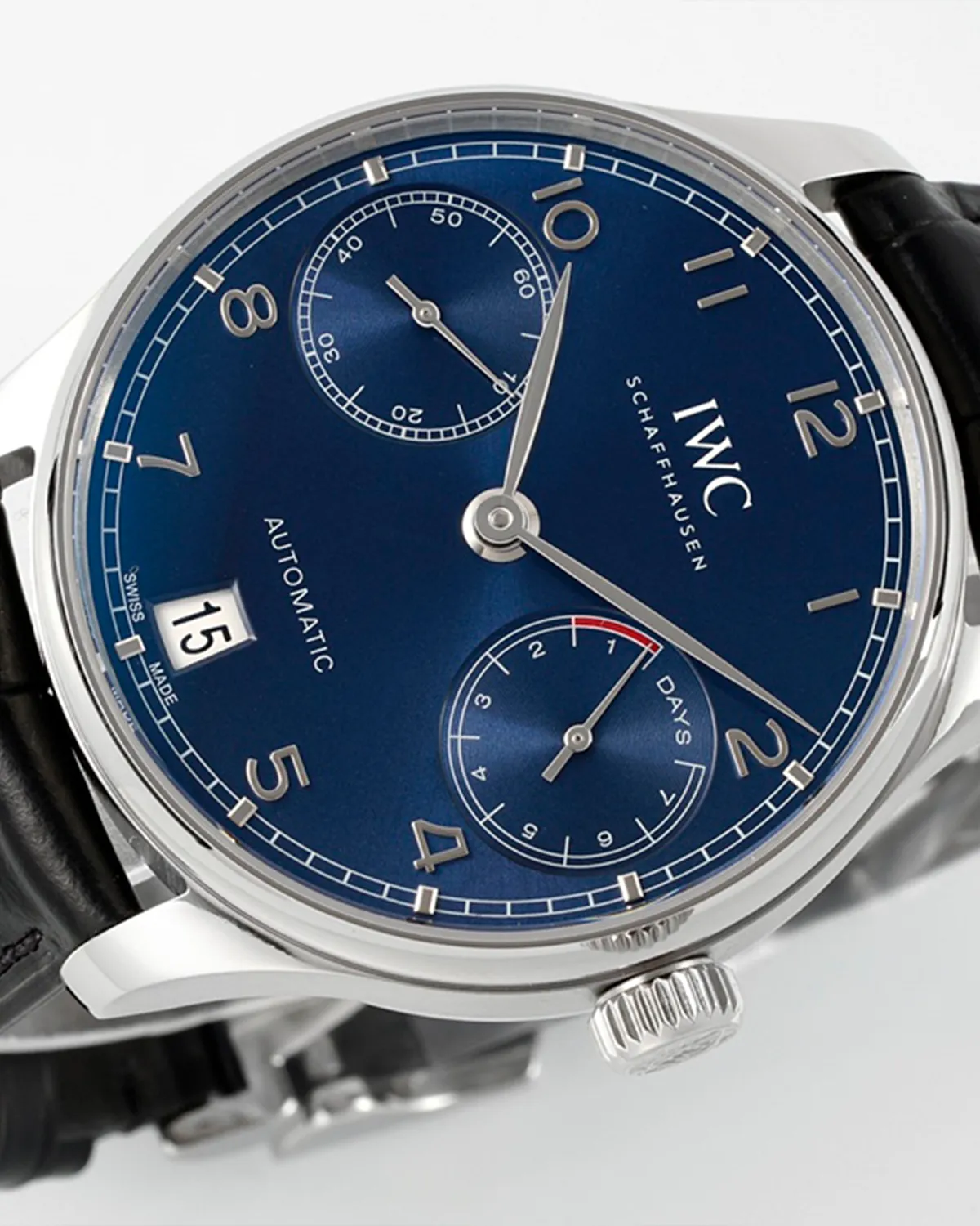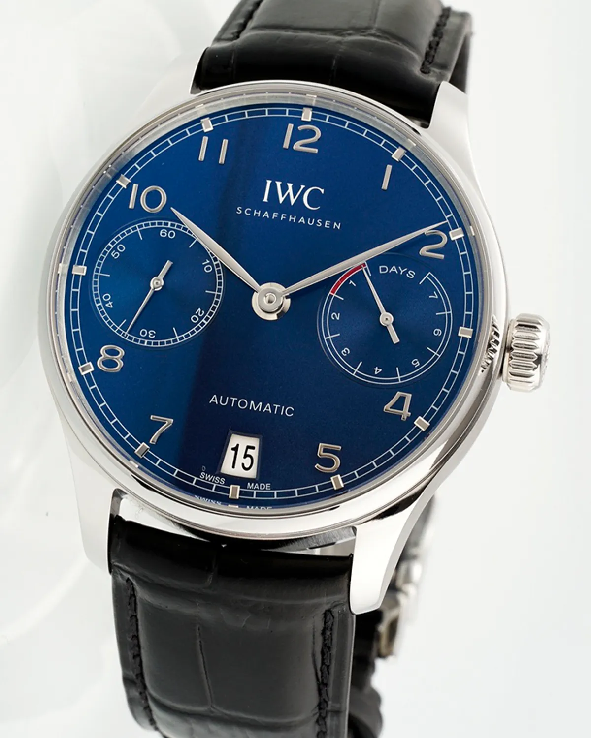 The Portugieser 7-Day Automatic is widely regarded as one of the most perfectly proportioned watches ever designed. This blue dial edition adds a layer of contemporary luxury to the classic silhouette. With its imposing size and uncluttered face, it bridges the gap between a dress watch and a casual daily wearer, making a statement of sophisticated taste.