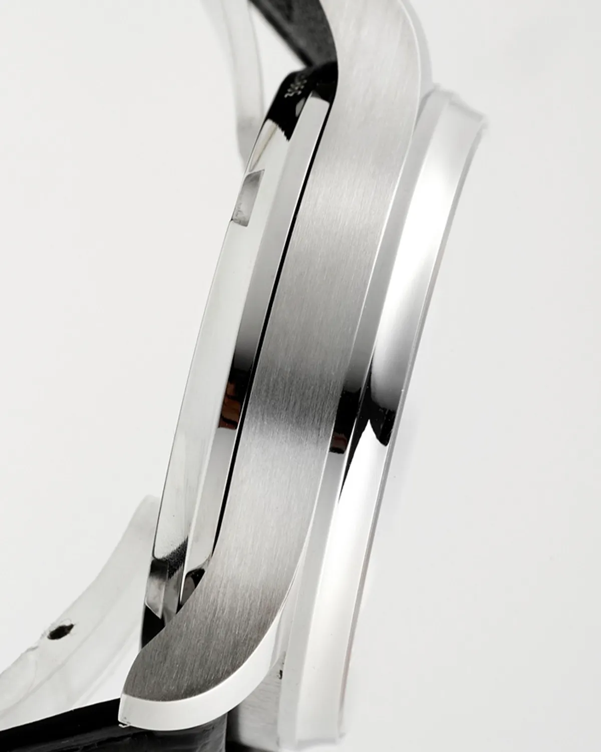 Symmetry is key to this model’s appeal. The sub-dial at 3 o’clock displays the power reserve status (indicating how much energy is left in the mainspring), while the sub-dial at 9 o’clock houses the running seconds. This balanced arrangement is both functional and aesthetically pleasing.