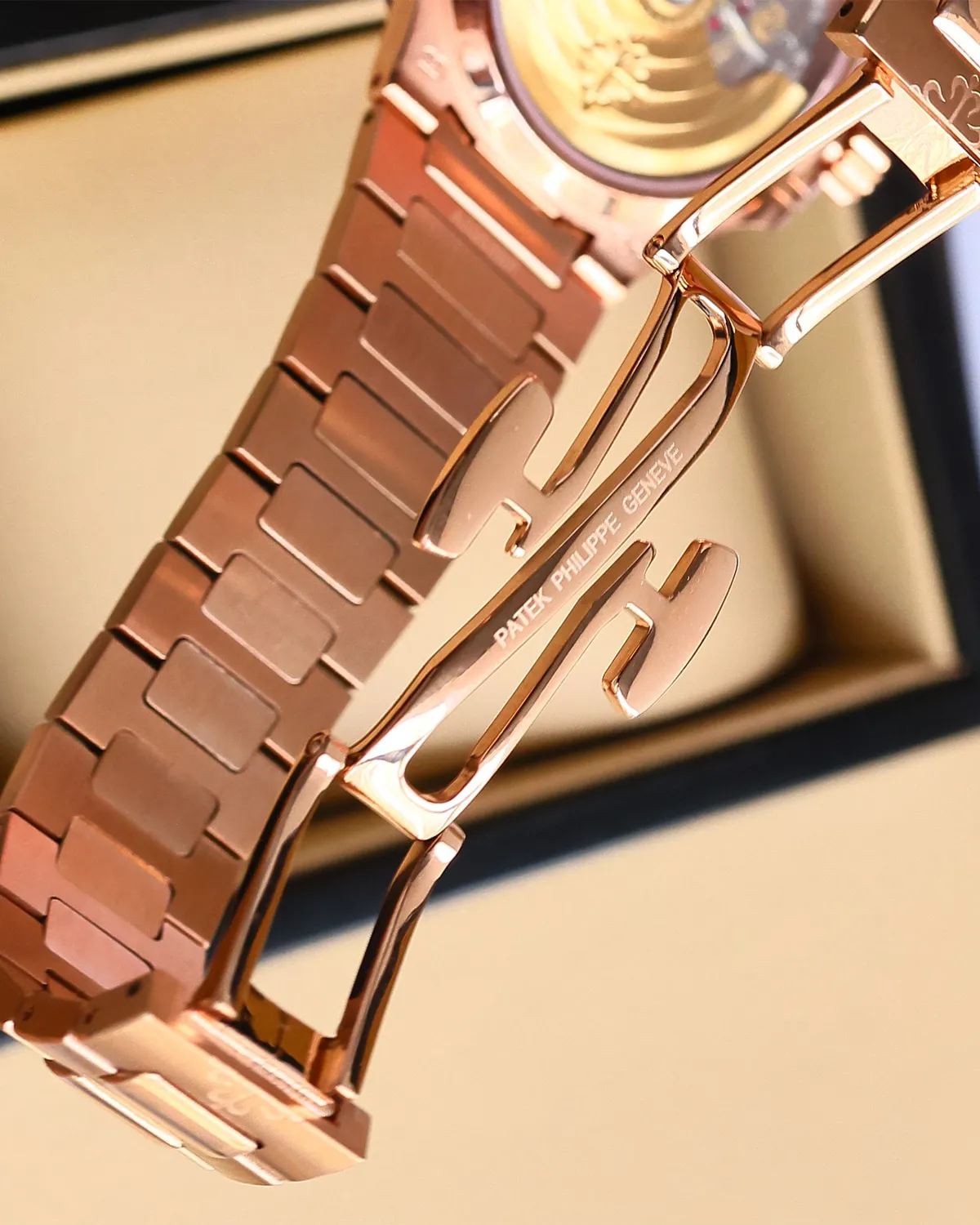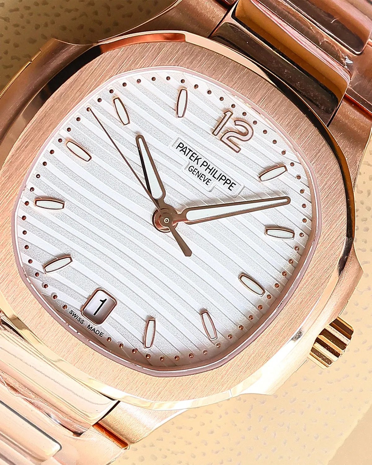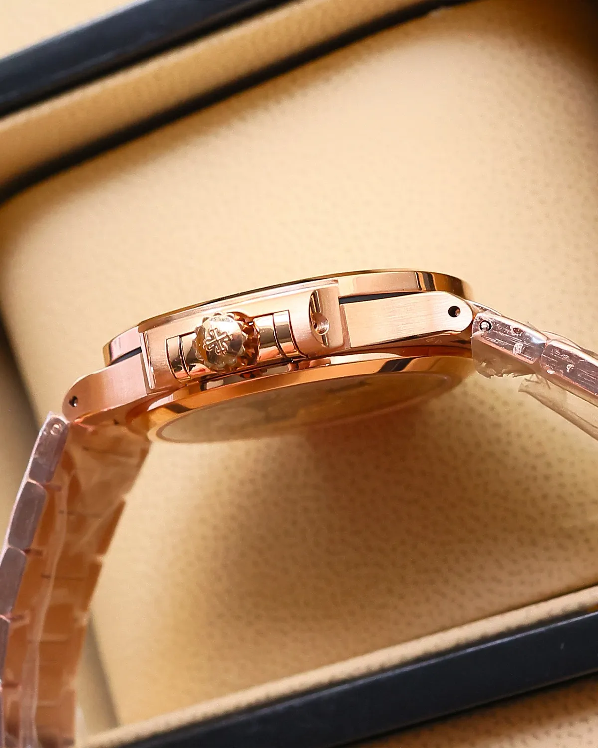 5711/1R date watch featuring a rose gold-tone case and bracelet paired with a light horizontal dial look for a clean, warm sport-lux finish.