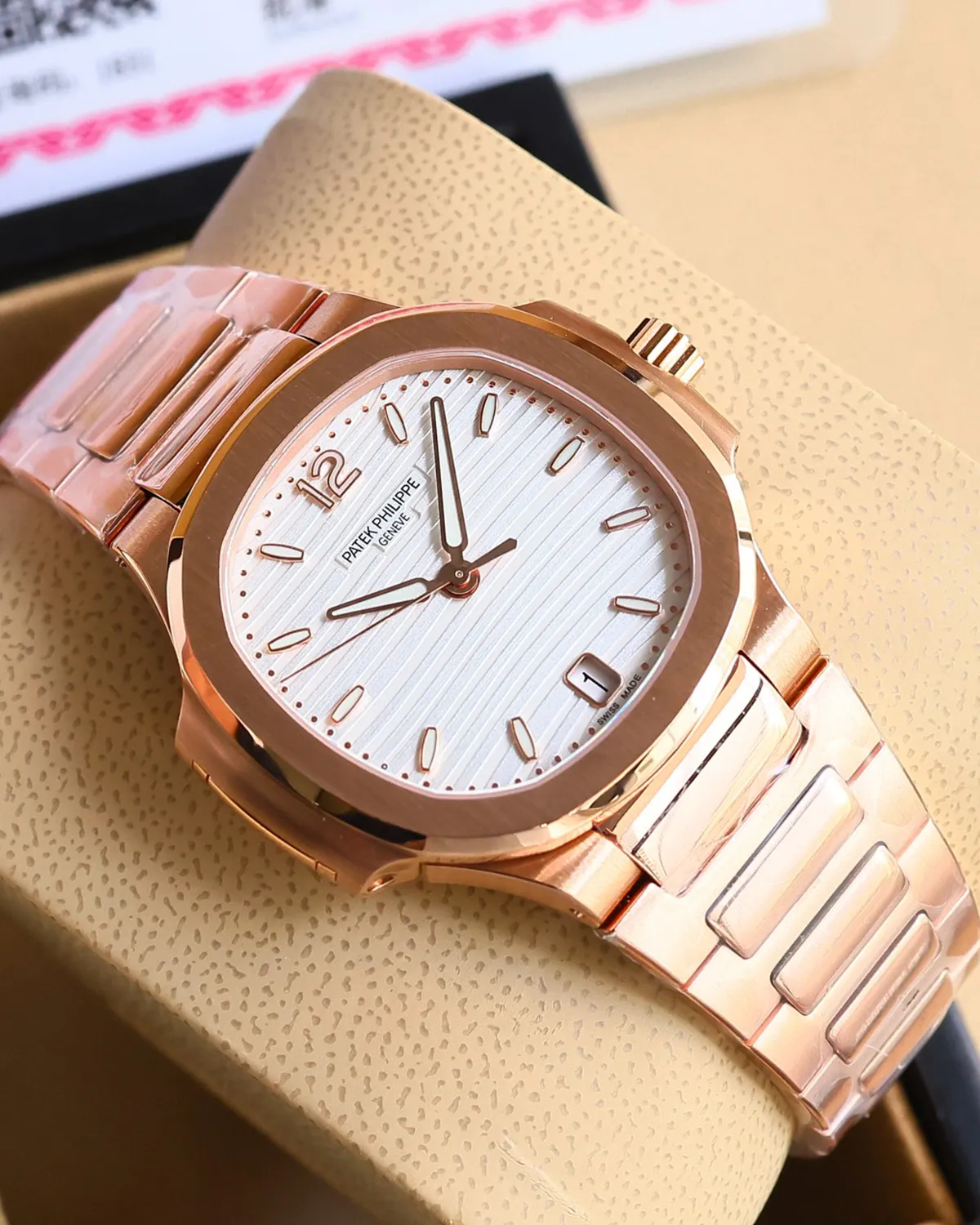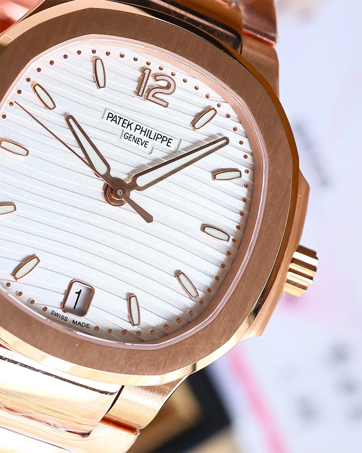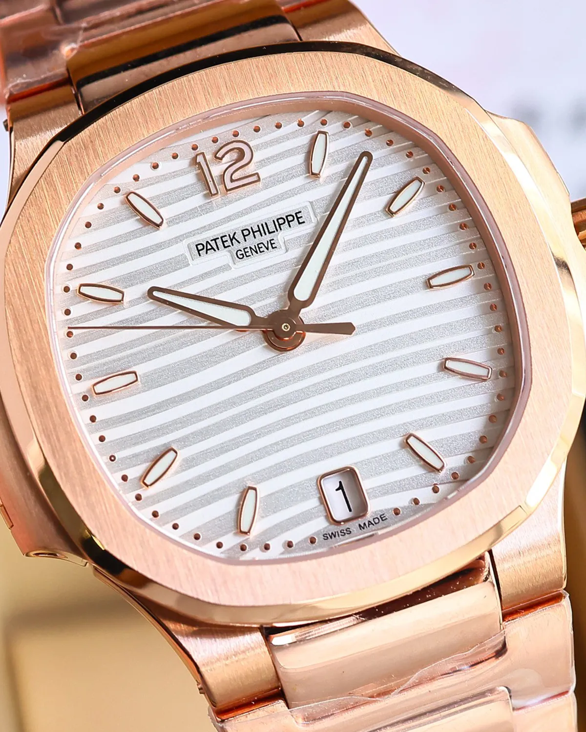 5711/1R date watch featuring a rose gold-tone case and bracelet paired with a light horizontal dial look for a clean, warm sport-lux finish.