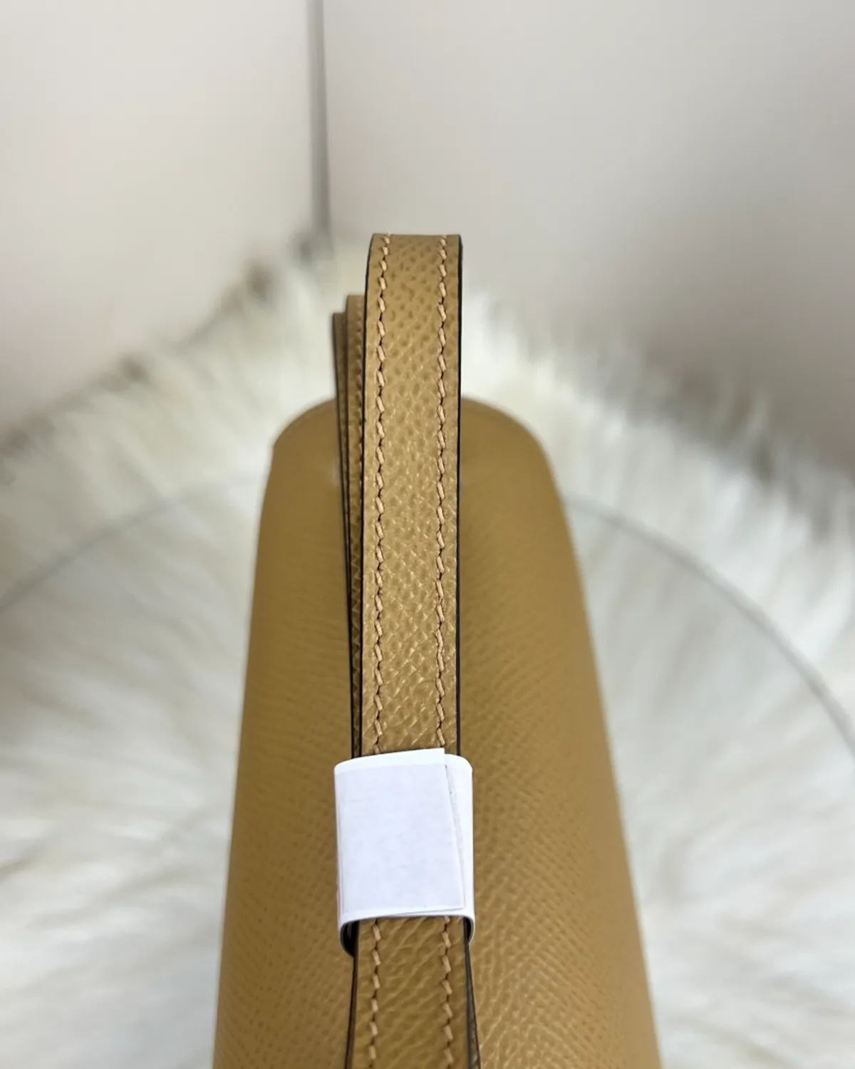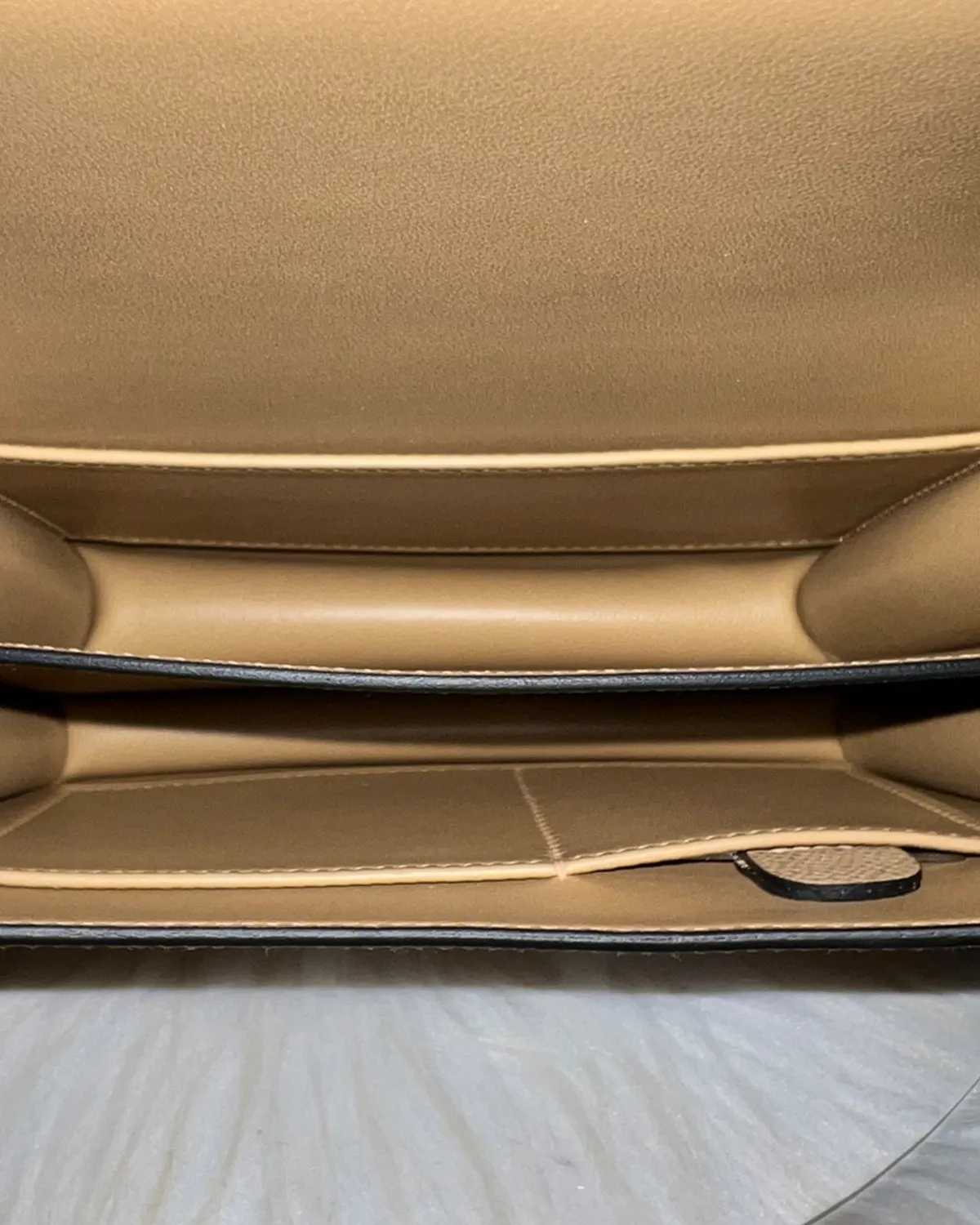 Chevre Mysore is legendary for its durability and distinct aesthetic. The grain is pronounced and slightly shiny, often featuring a visible “spine” line running down the center of the flap—a hallmark of authentic goatskin. It is incredibly lightweight and resistant to scratches, making it as practical as it is beautiful. The Kraft color glows with an inner warmth on this specific leather.