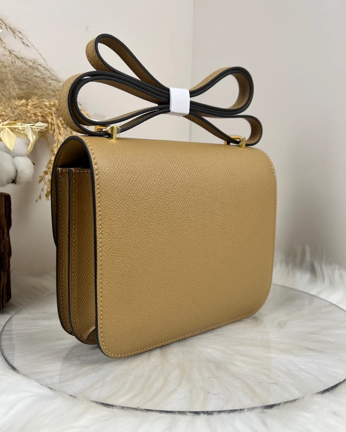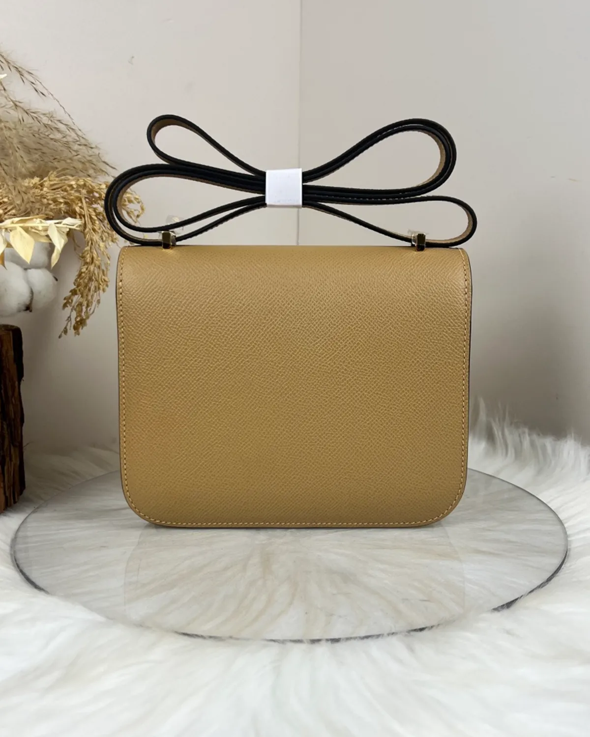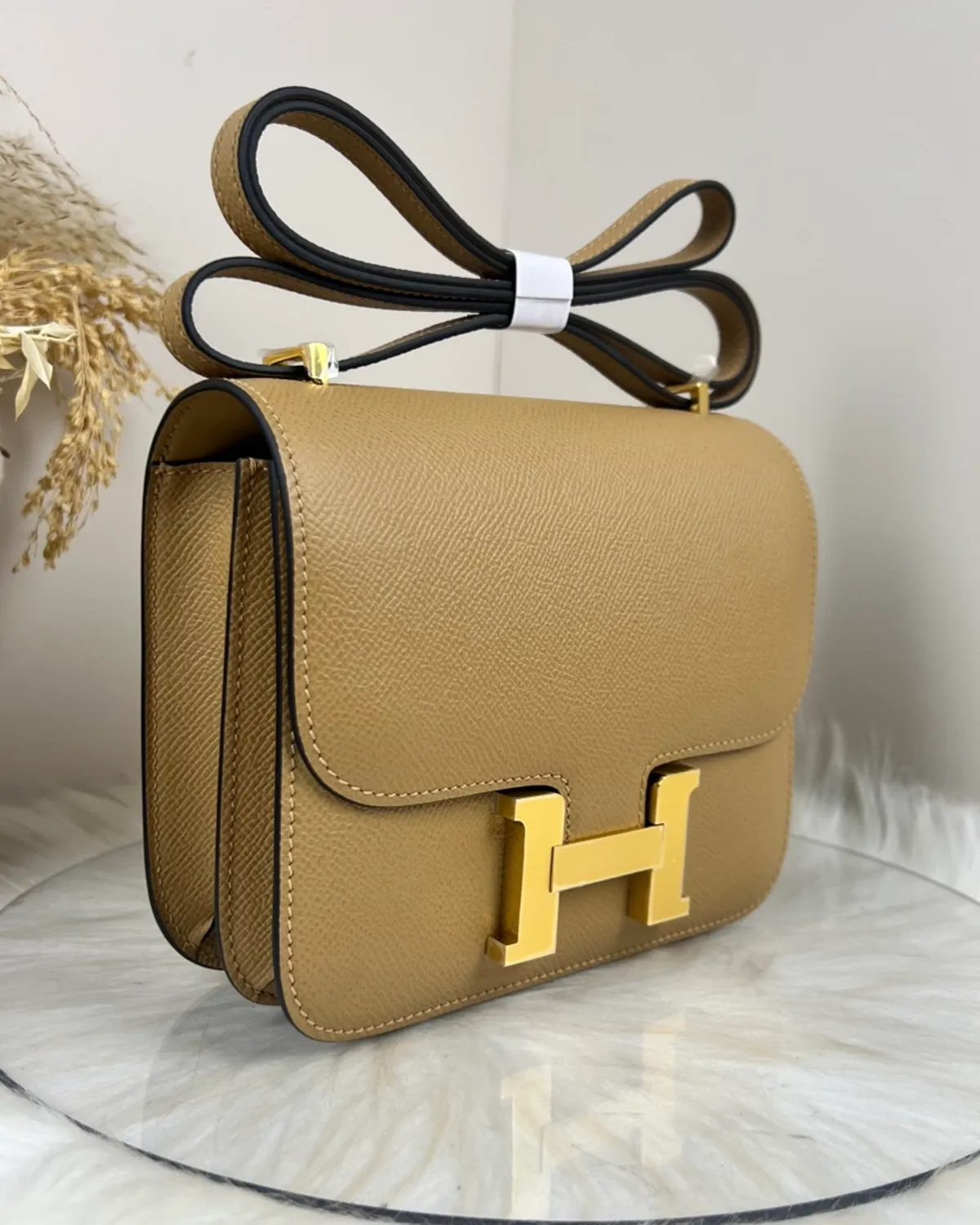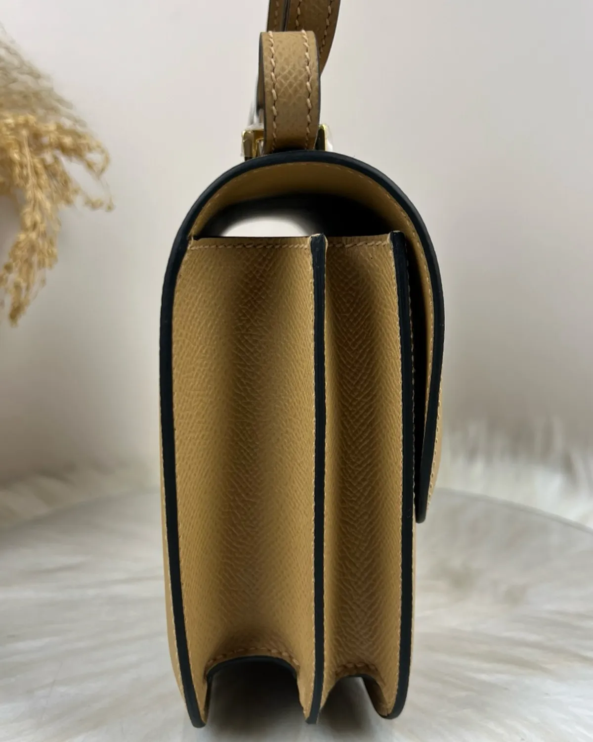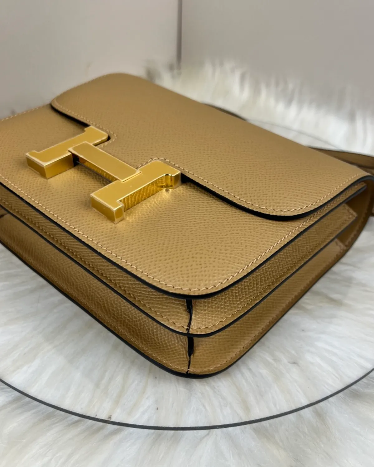 *Note: This item is a high-quality homage inspired by the Hermes Constance 18 Chevre Kraft design. It captures the unique goatskin texture and architectural clasp at an accessible price point.