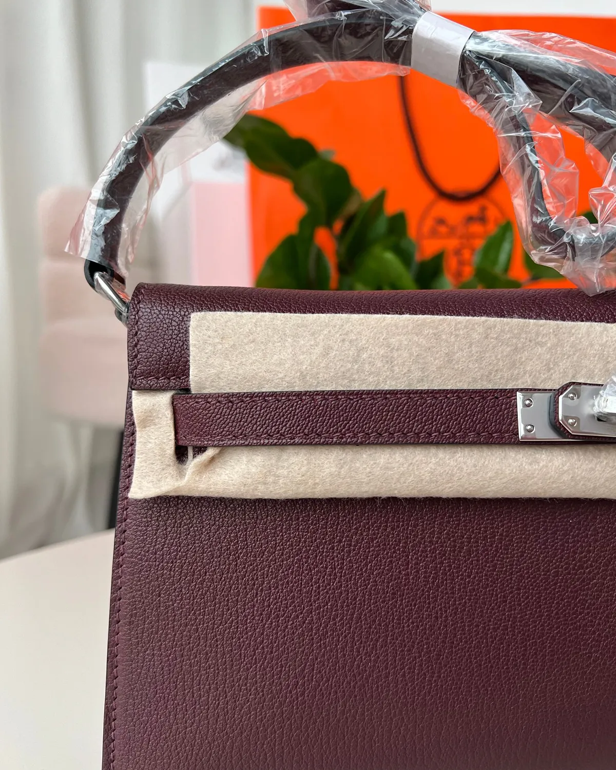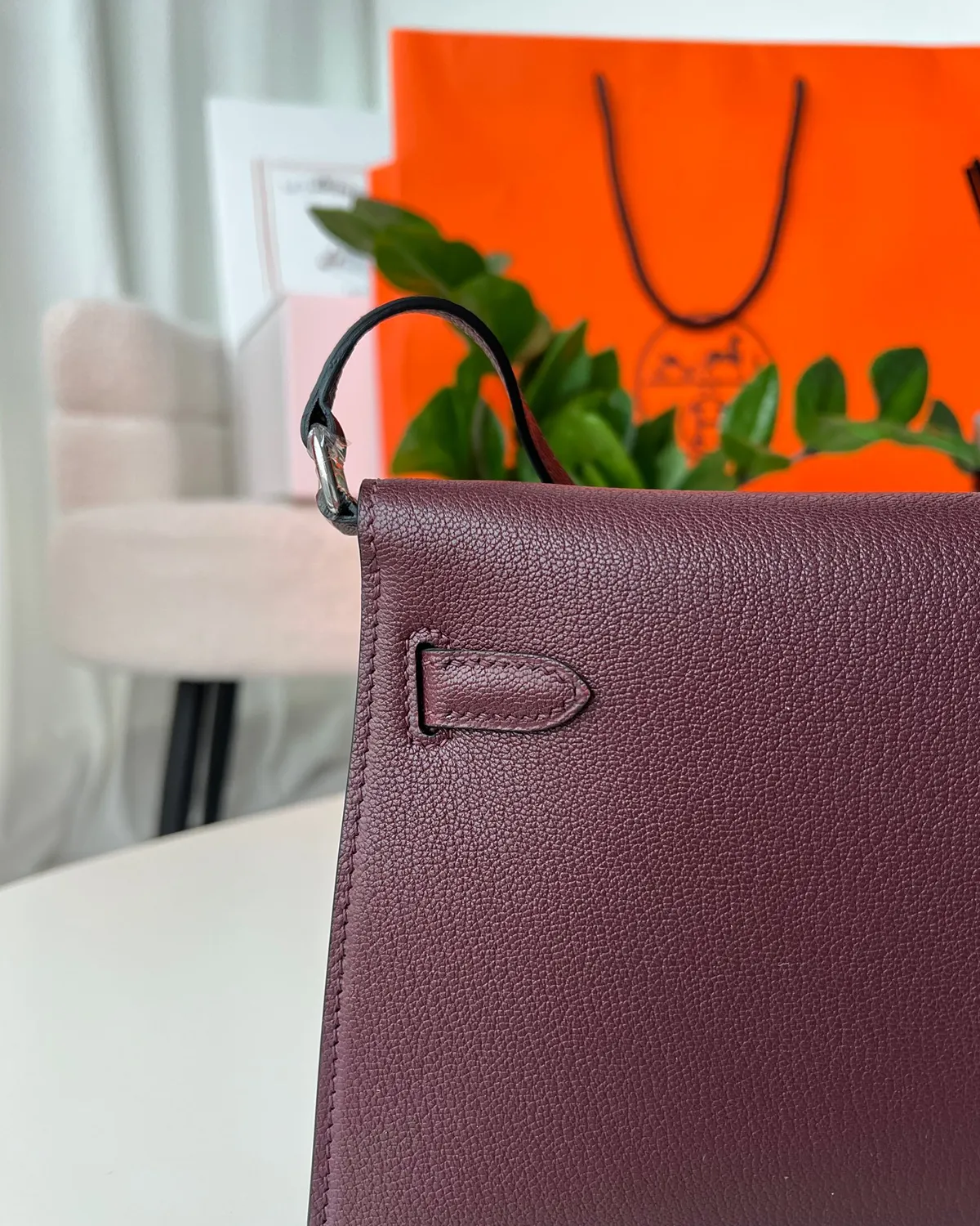 The body is crafted from “Swift” leather, a material celebrated for its almost imperceptible grain and soft hand-feel. Unlike rigid, heavily grained leathers, Swift absorbs dye with incredible vibrancy, resulting in colors that are deep and saturated. Its smooth surface gives the bag a contemporary, polished look that pairs perfectly with the structured silhouette.