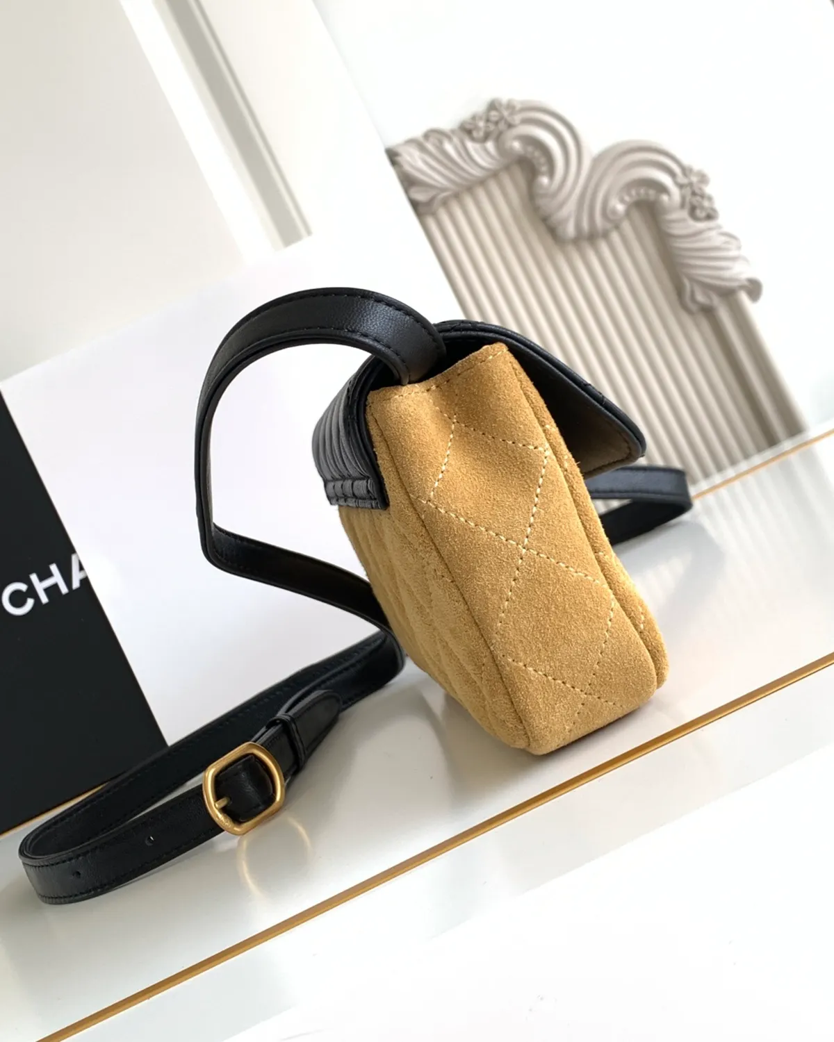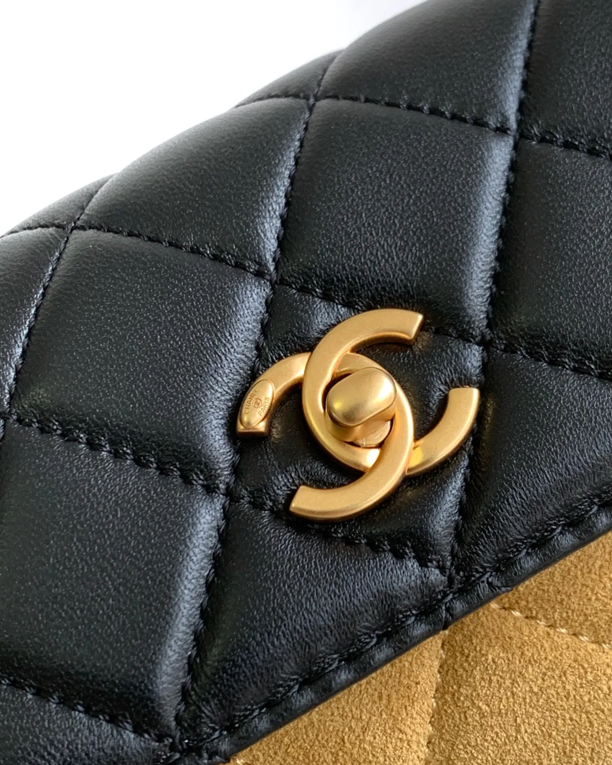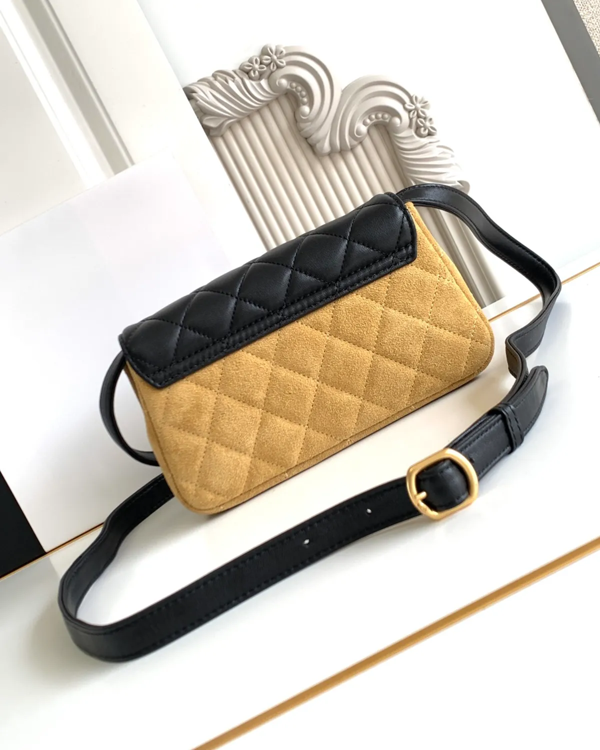 Each panel of the bag tells a different tactile story. Velvety suede meets buttery lambskin and robust grained calfskin, all stitched together with precision. The patchwork design creates a rich tapestry of tones—from deep earth browns to soft creams and blacks—making it an incredibly versatile accessory that complements any fall/winter wardrobe.