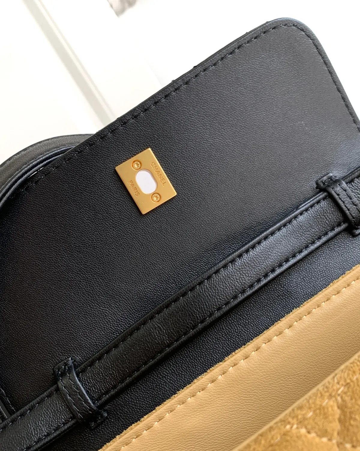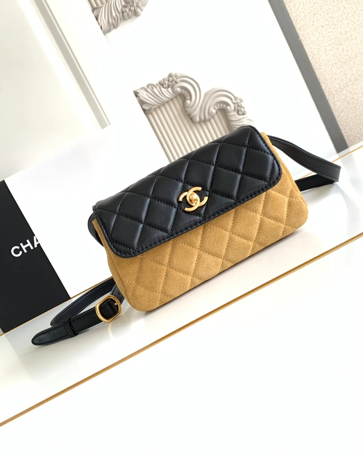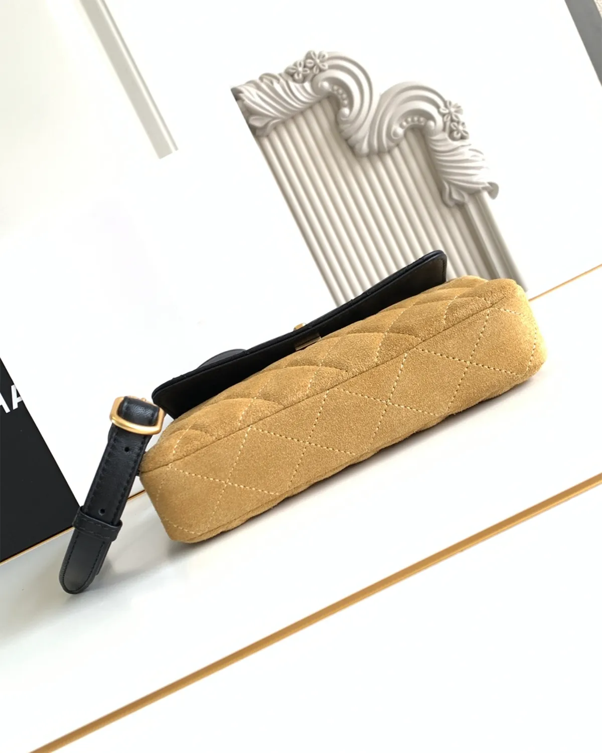 Each panel of the bag tells a different tactile story. Velvety suede meets buttery lambskin and robust grained calfskin, all stitched together with precision. The patchwork design creates a rich tapestry of tones—from deep earth browns to soft creams and blacks—making it an incredibly versatile accessory that complements any fall/winter wardrobe.