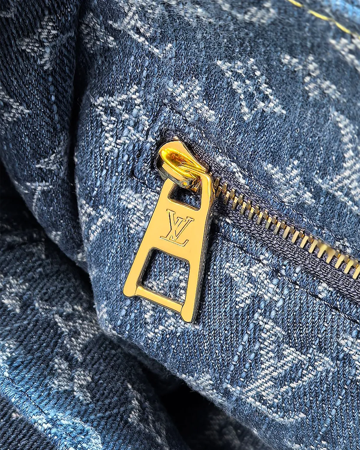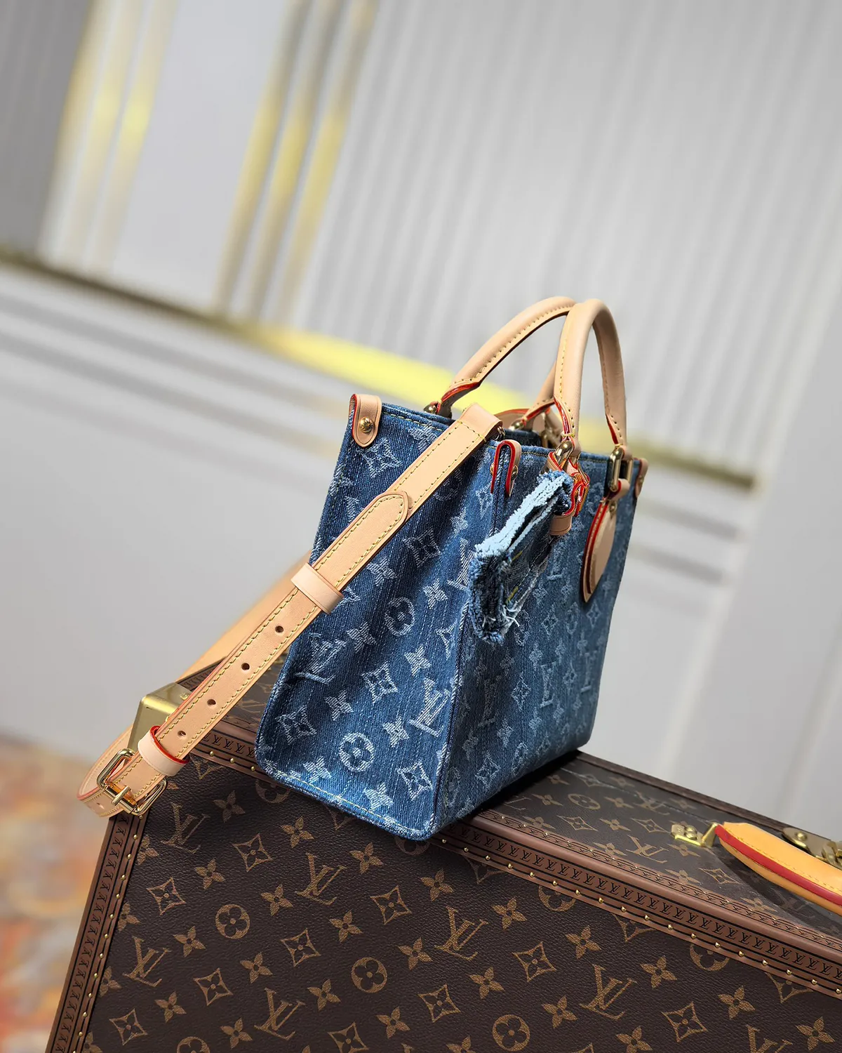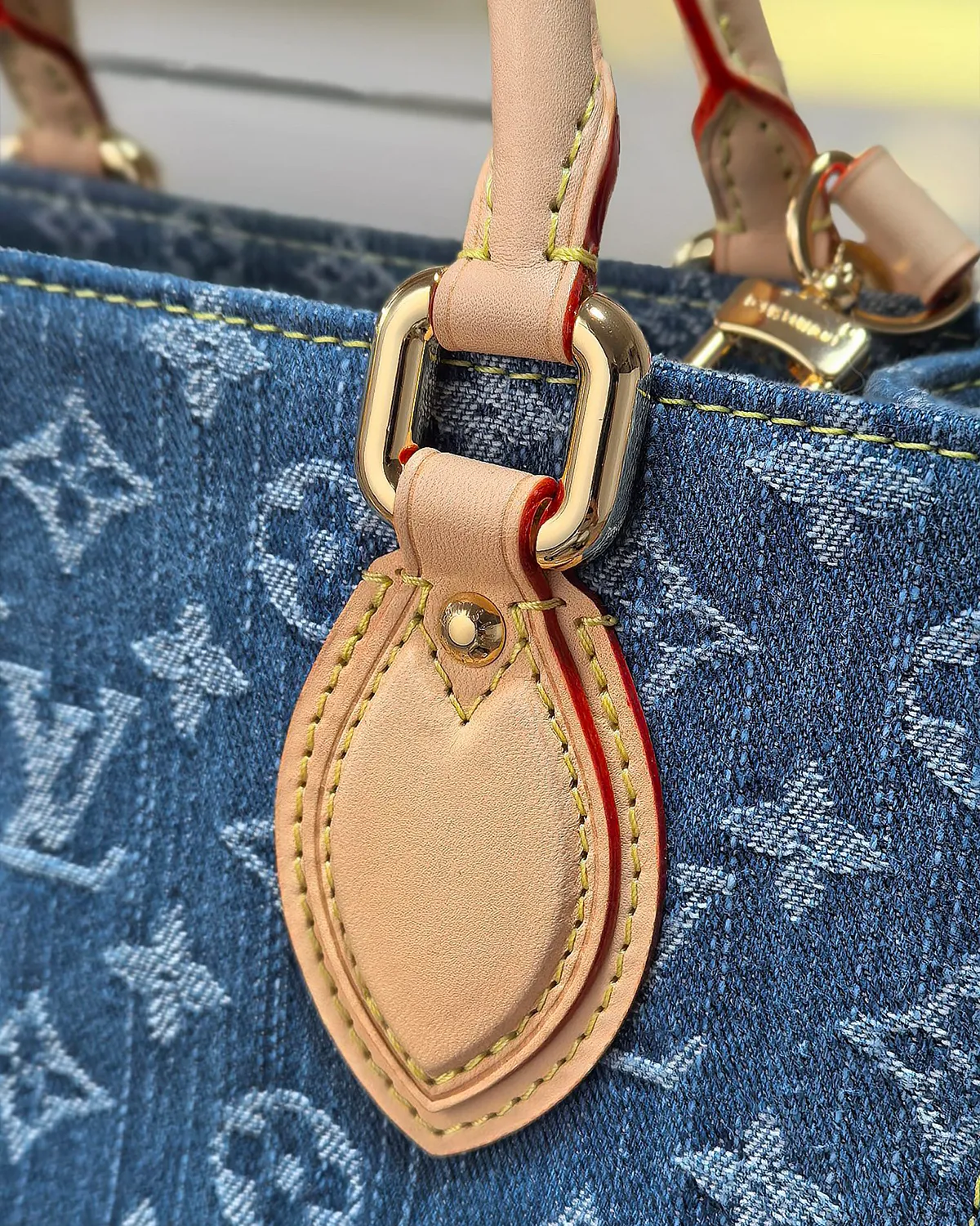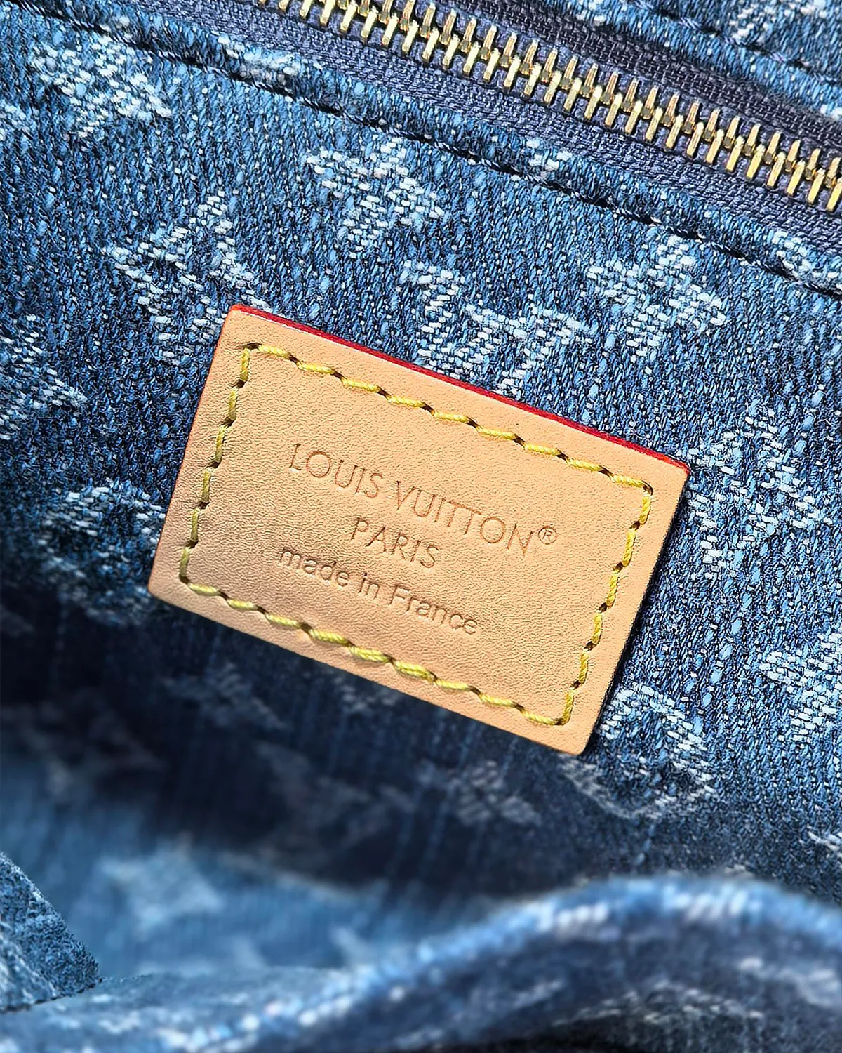 Framing the soft denim is rich Navy Blue cowhide leather trim. The contrast stitching (often in white or yellow) highlights the construction, nodding to the detailing found on premium jeans. The polished gold-tone hardware adds a final touch of glamour to the casual aesthetic.