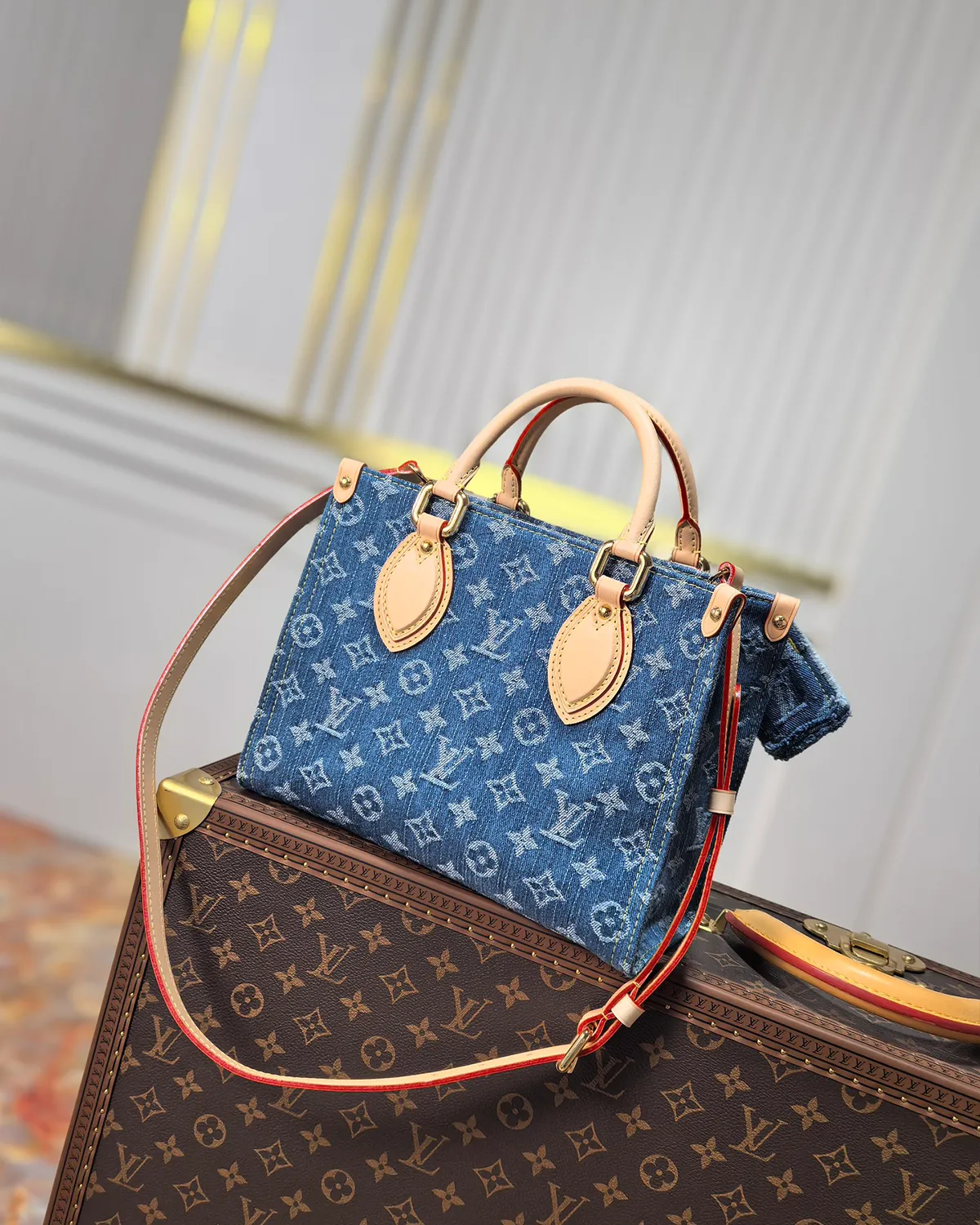 This PM model is designed for movement. It comes with a wide, adjustable textile strap that sits comfortably on the shoulder. Attached to the strap is a playful, removable round coin purse in matching denim—a functional detail that keeps small essentials like keys or earbuds instantly accessible.