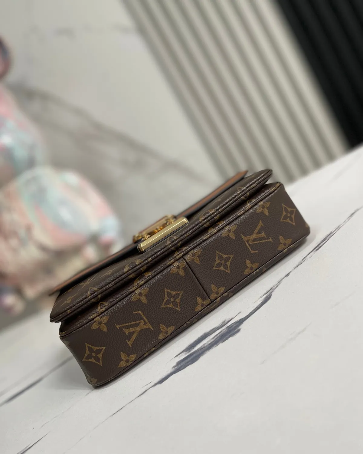 The centerpiece of the design is the gold-tone S-lock clasp. Derived from the unpickable locks of 19th-century travel trunks, it has been refined here into a smooth, jewelry-like closure. It clicks shut with a reassuring weight, securing the flap over a spacious front pocket and the main compartment.