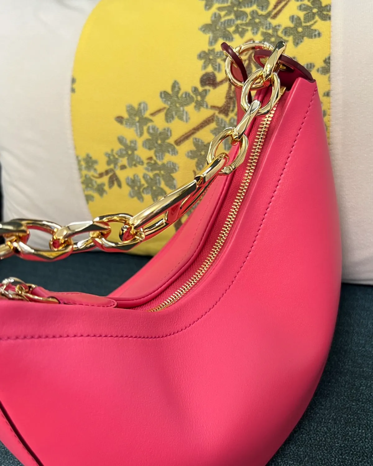 The Signature Crescent Chain Hobo Mini redefines how a bag interacts with the body. It isn’t just carried; it is worn. The ergonomic “Moon” shape tucks perfectly under the arm or sits elegantly against the hip, while the metallic handle transforms the piece into a bold statement of jewelry, blurring the line between accessory and adornment.