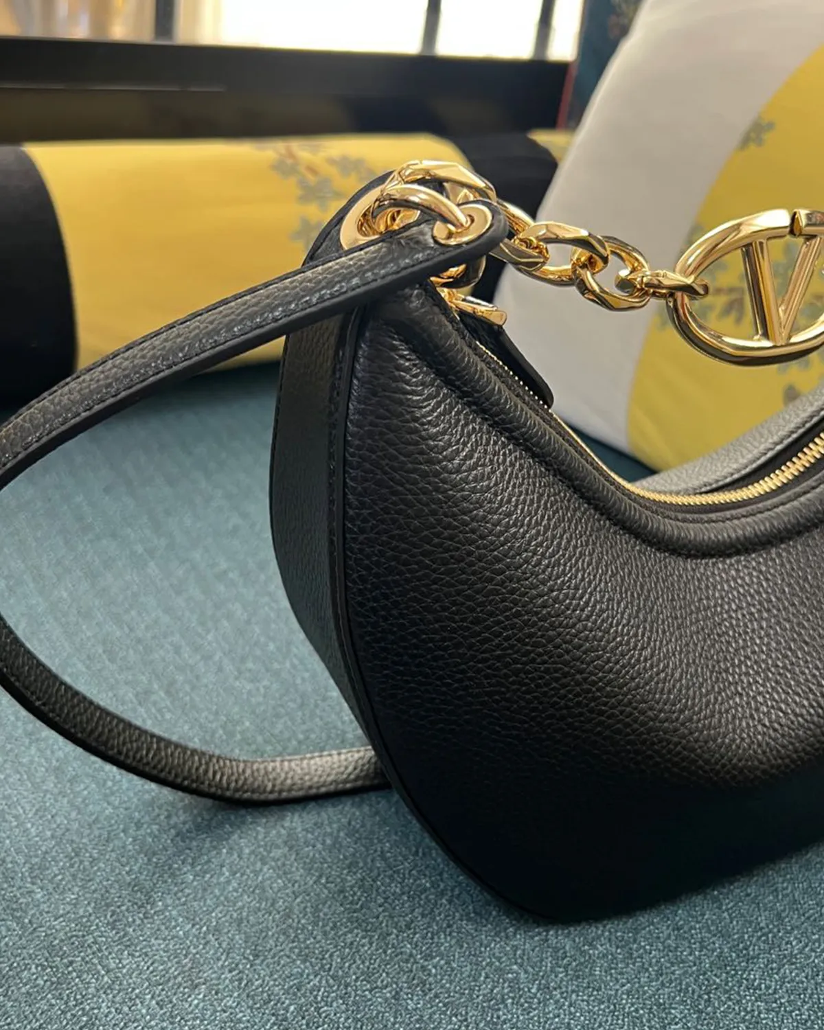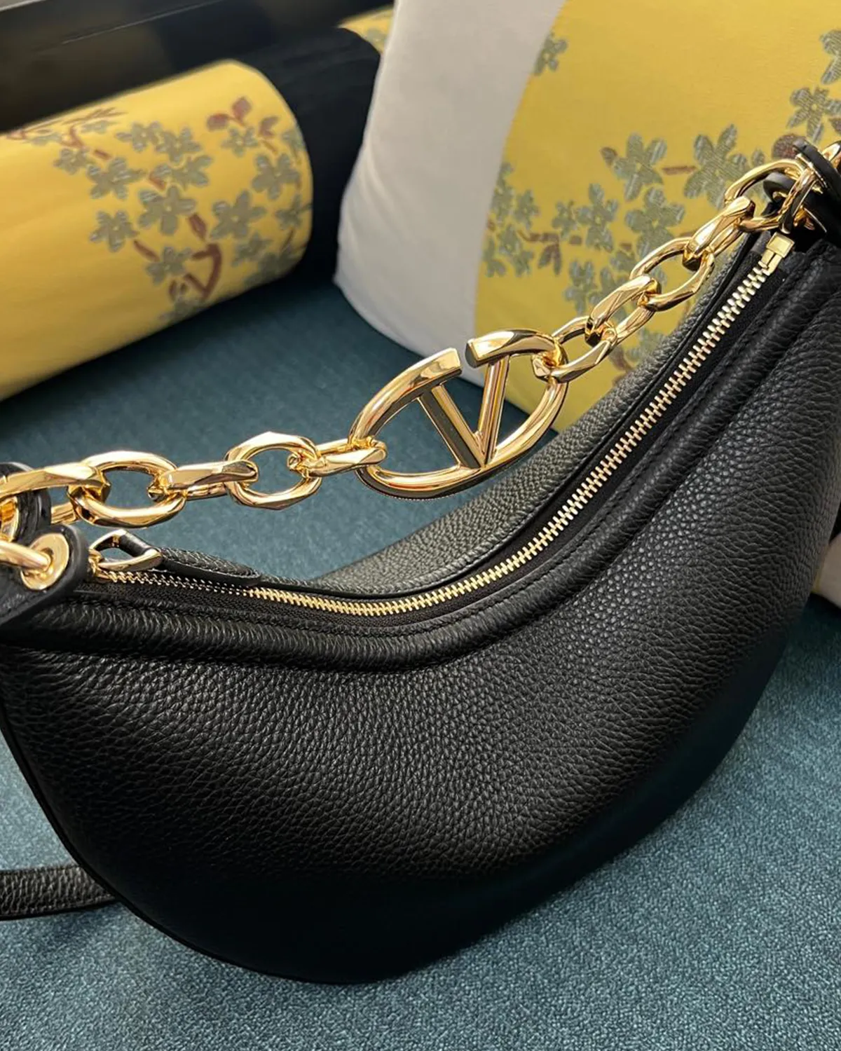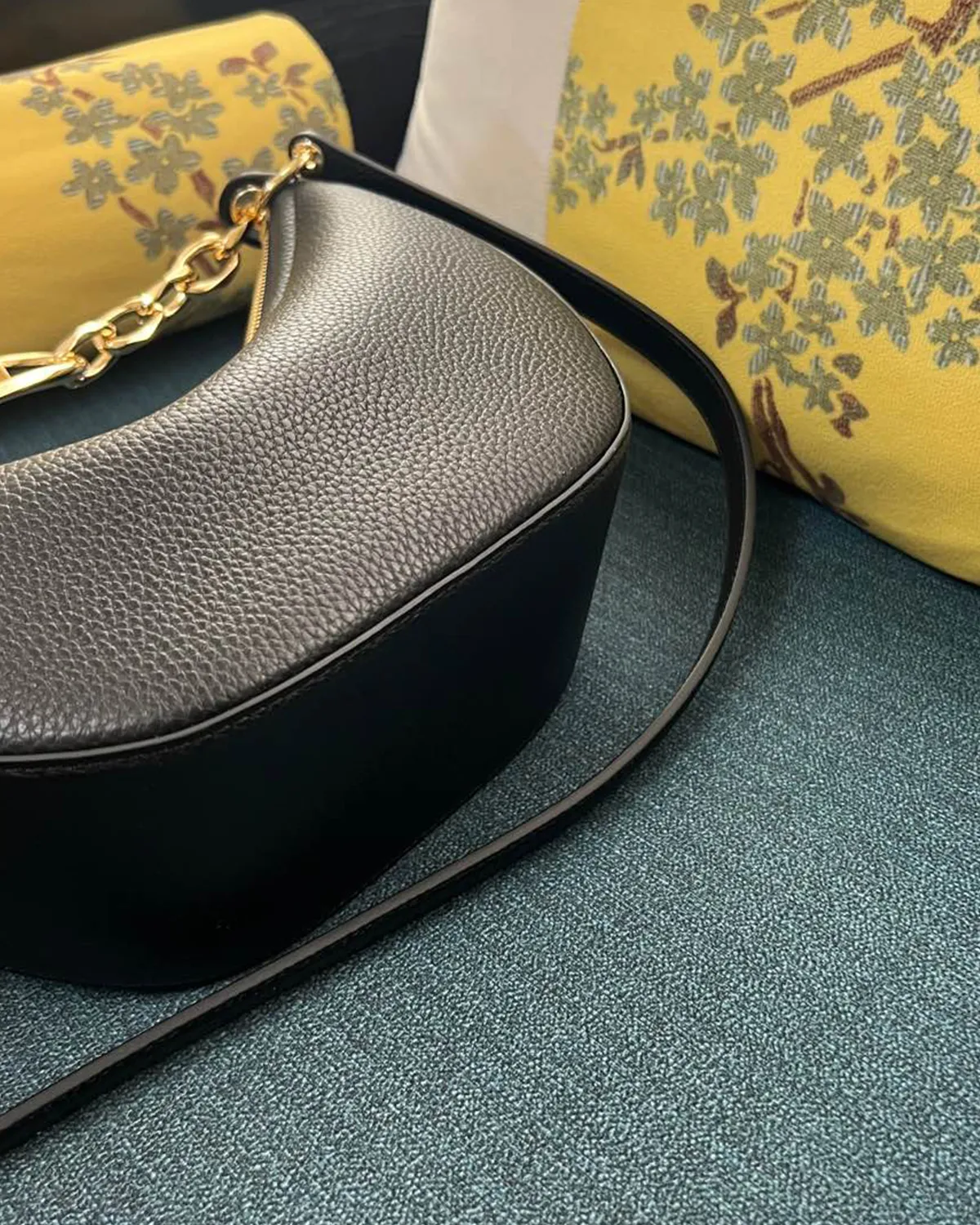 The Signature Crescent Chain Hobo Small redefines how a bag interacts with the body. It isn’t just carried; it is worn. The ergonomic “Moon” shape tucks perfectly under the arm or sits elegantly against the hip, while the metallic handle transforms the piece into a bold statement of jewelry, blurring the line between accessory and adornment.