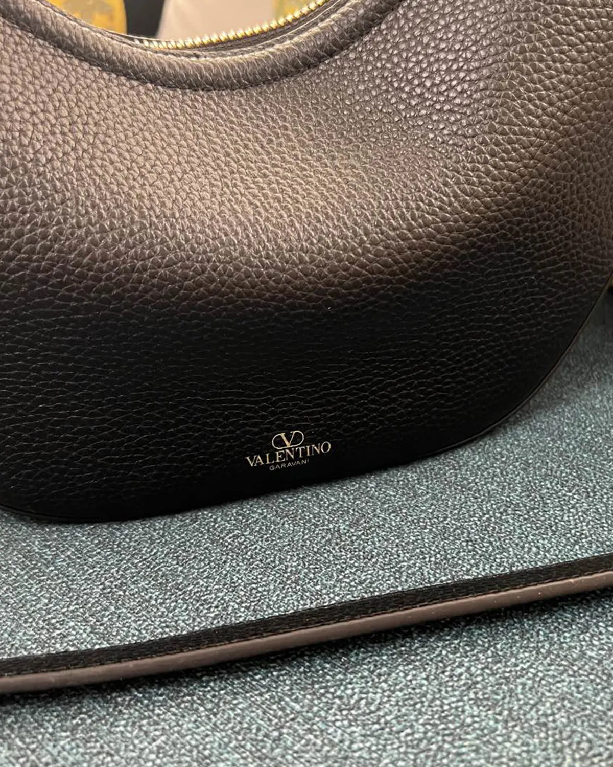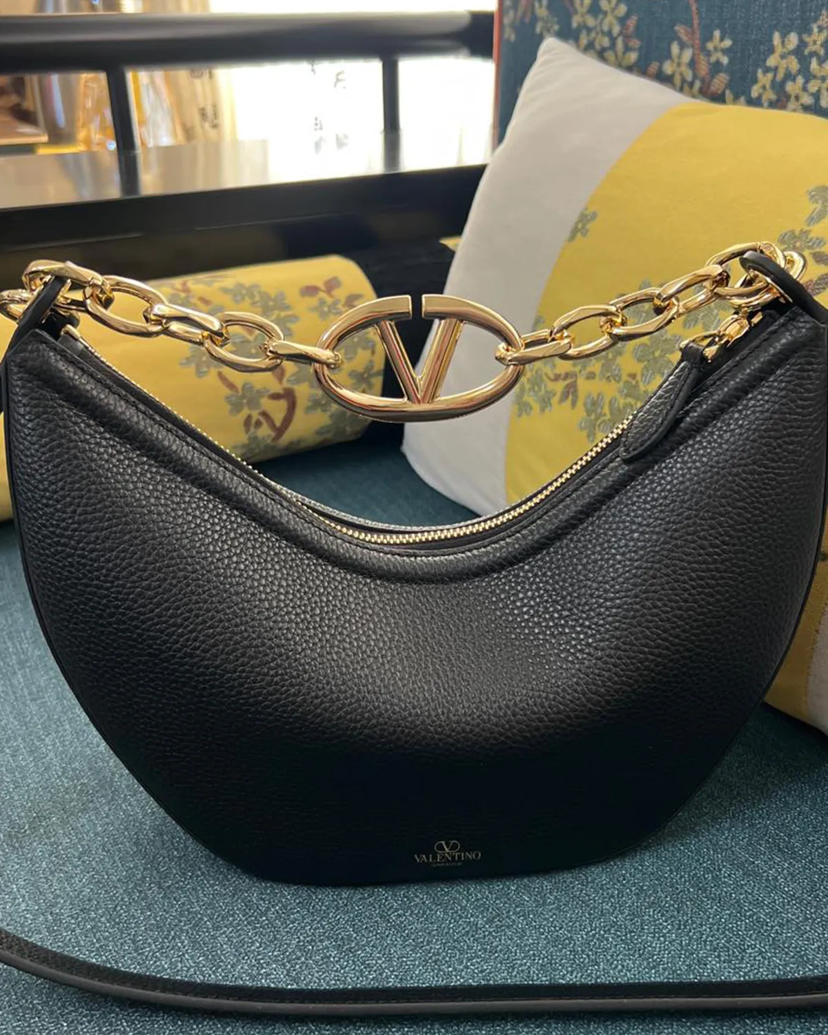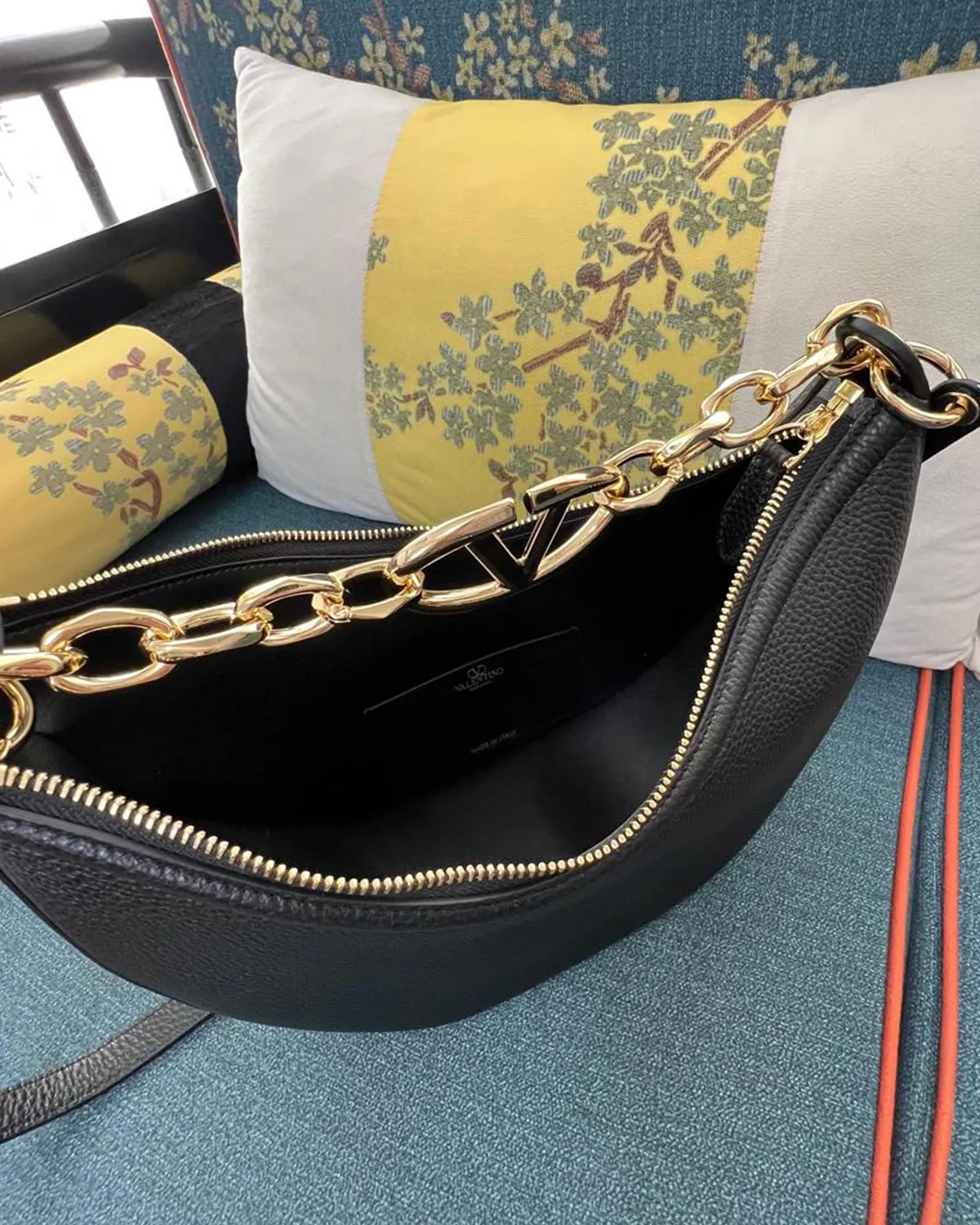 The Signature Crescent Chain Hobo Small redefines how a bag interacts with the body. It isn’t just carried; it is worn. The ergonomic “Moon” shape tucks perfectly under the arm or sits elegantly against the hip, while the metallic handle transforms the piece into a bold statement of jewelry, blurring the line between accessory and adornment.