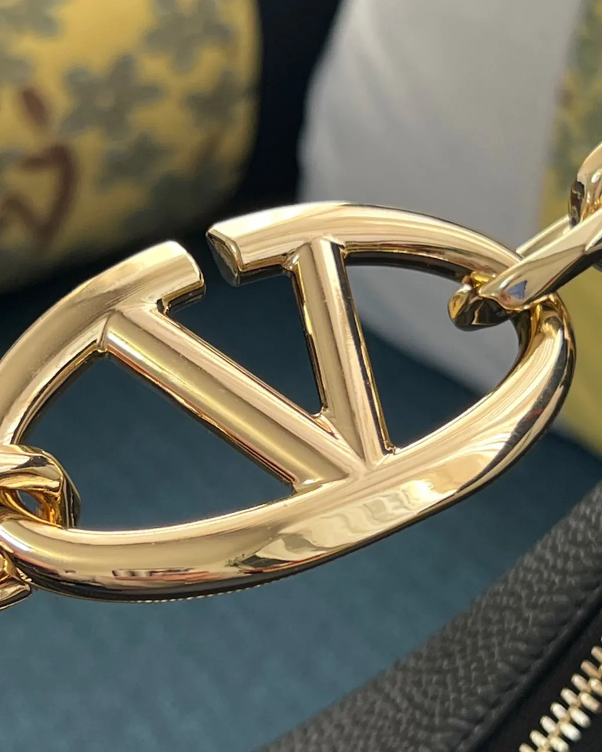The defining feature is the rigid metal chain that curves along the top of the bag. Composed of interlocking V-shaped links in polished gold-tone metal, it creates a continuous, elliptical line. This handle allows you to slip your wrist through, wearing the bag like an oversized cuff bracelet for an evening look that demands attention.