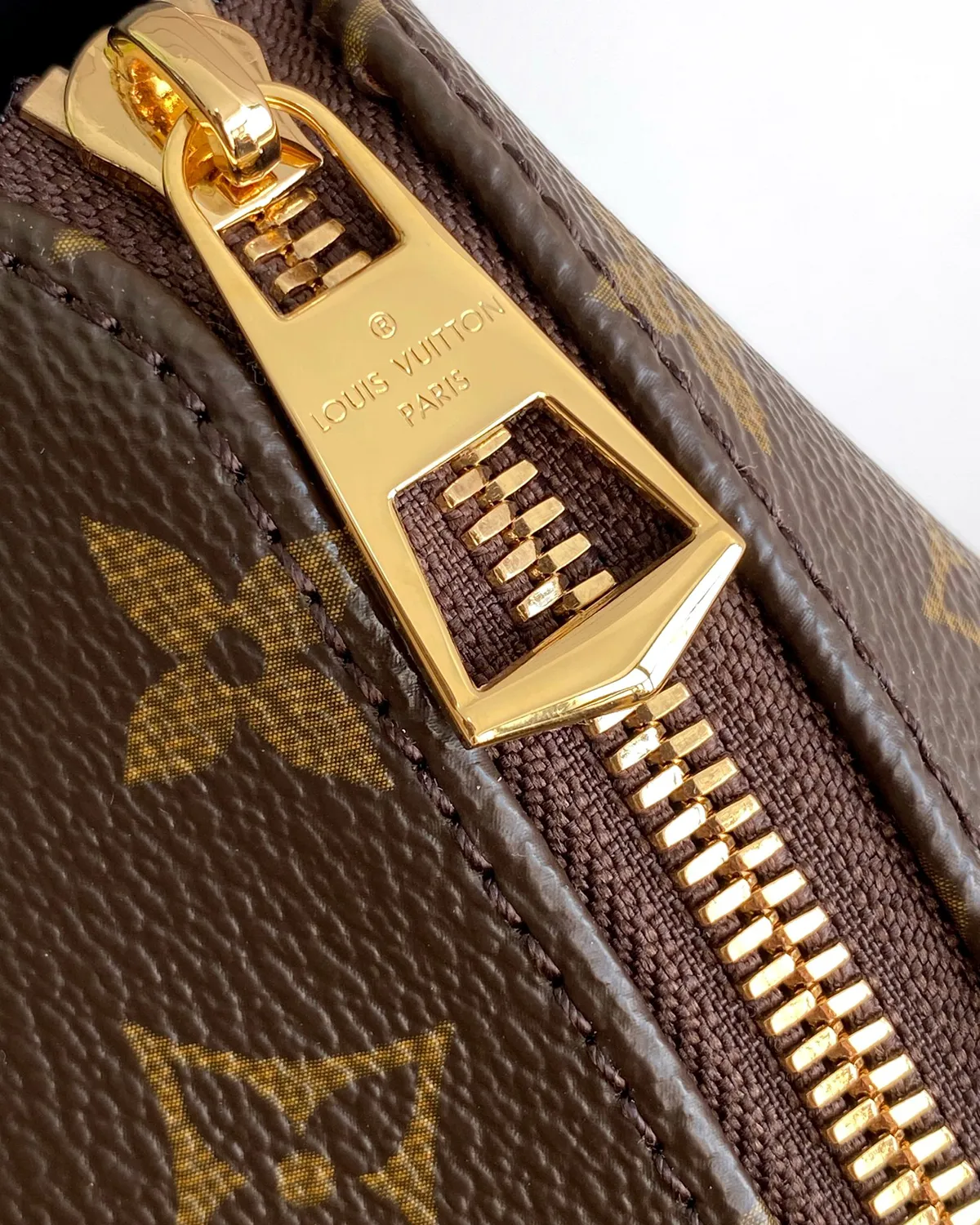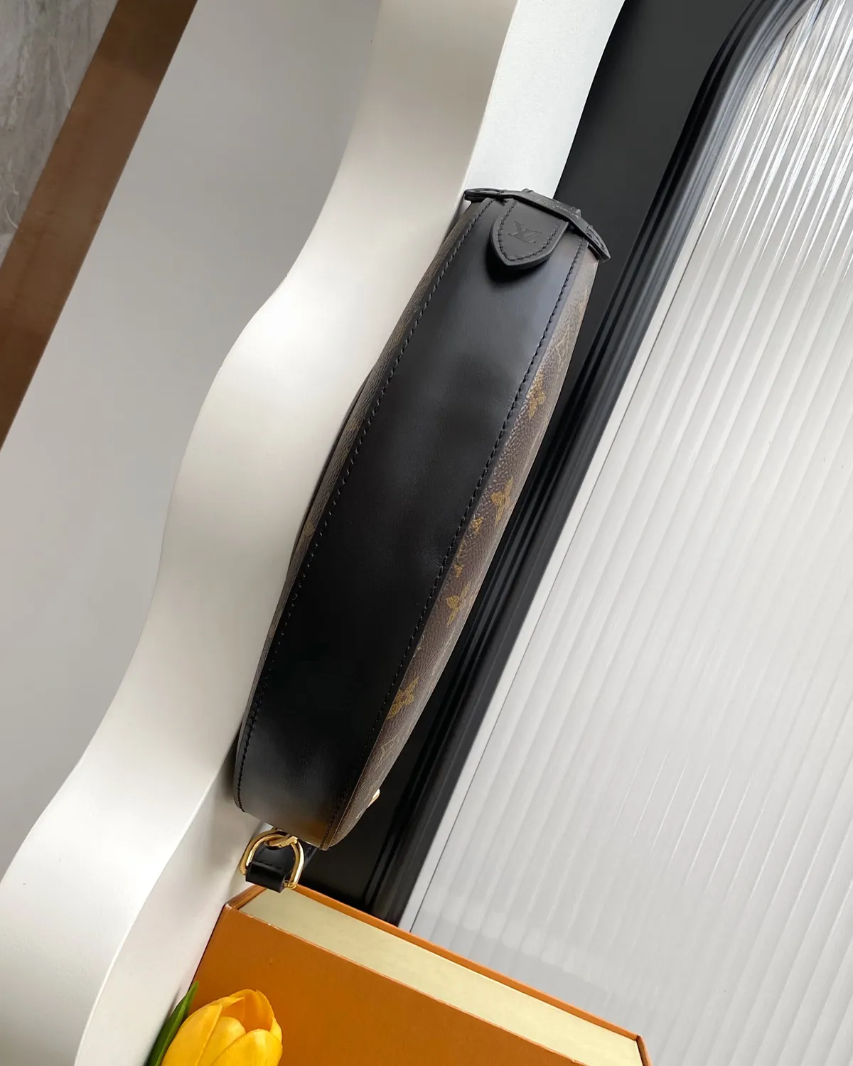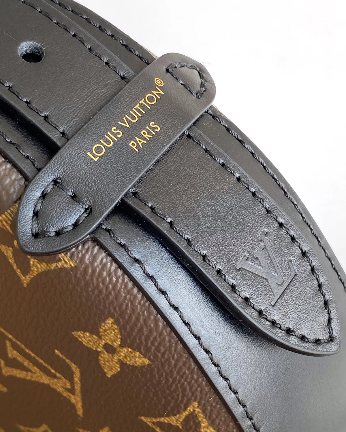 The body features the timeless monogram coated canvas, celebrated for its durability. It is framed by smooth black cowhide leather on the bottom and sides, adding structural integrity and a modern, graphic contrast. The leather luggage tag, embossed with a circular logo, adds a heritage travel touch to this petite city bag.