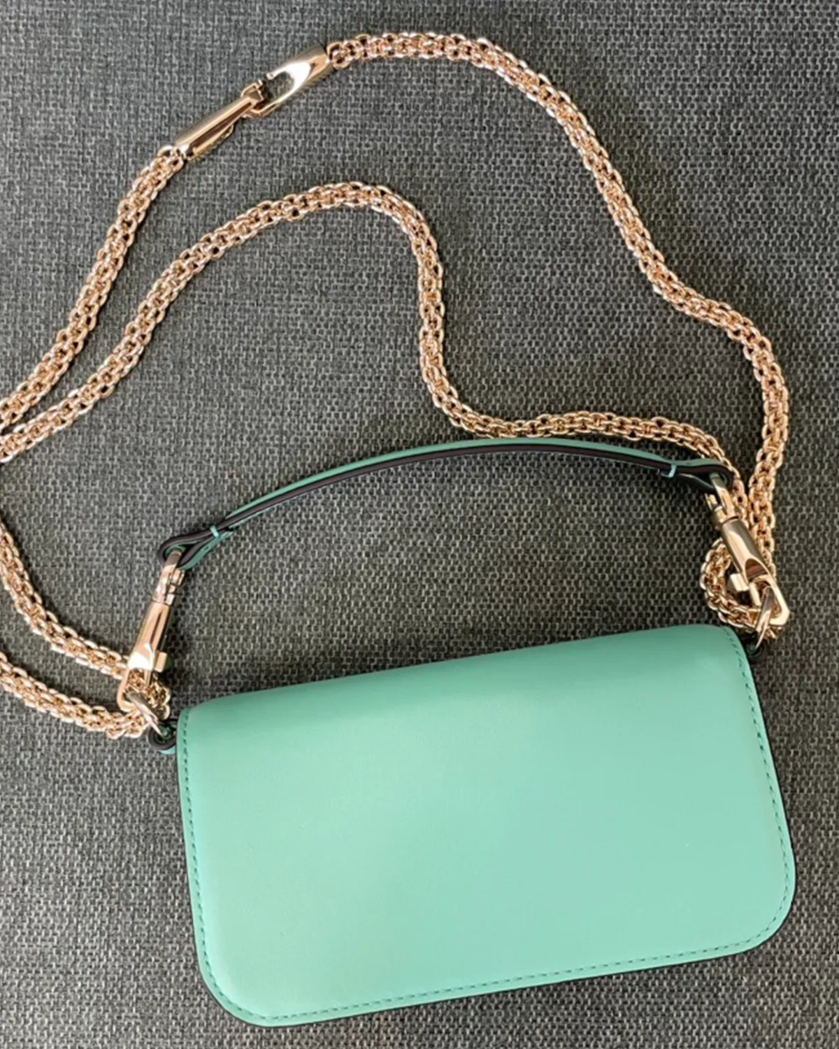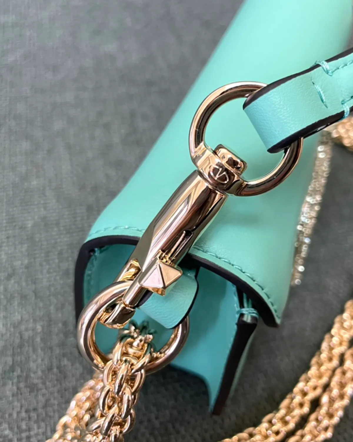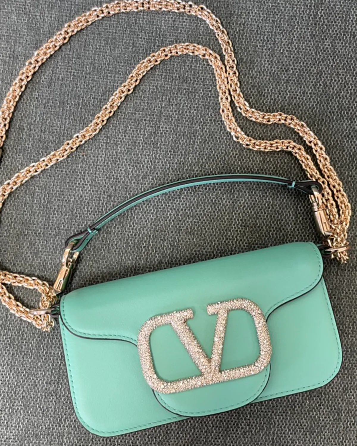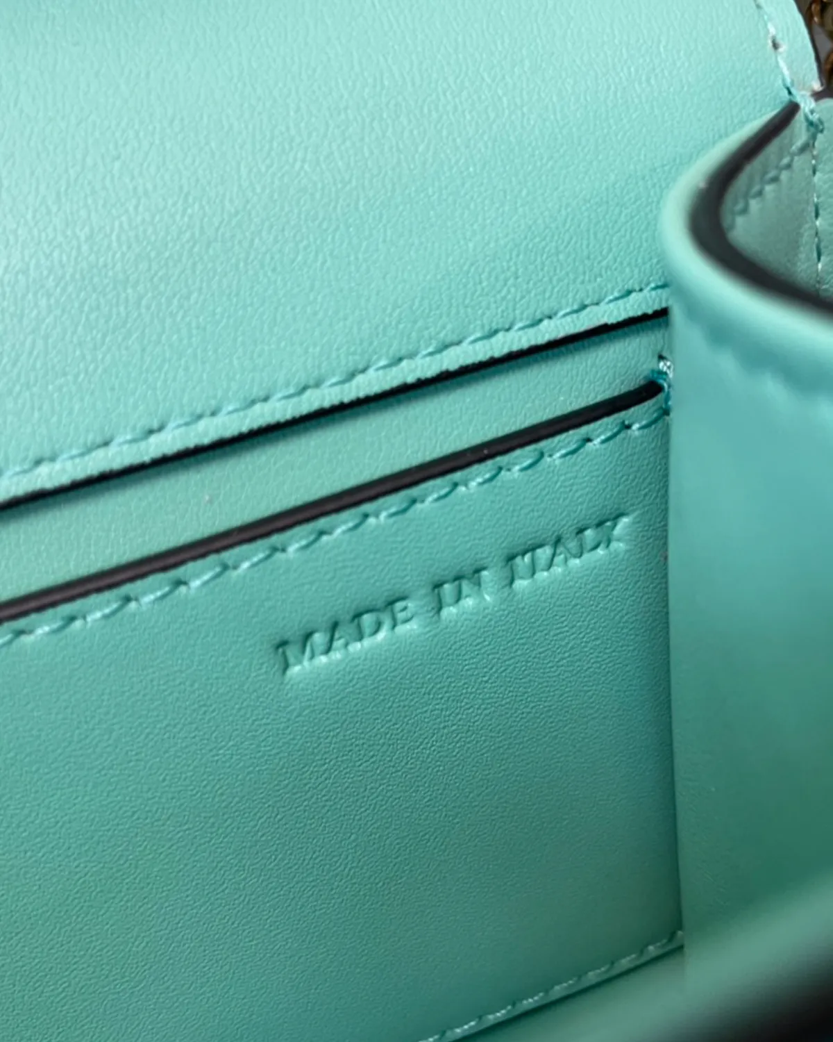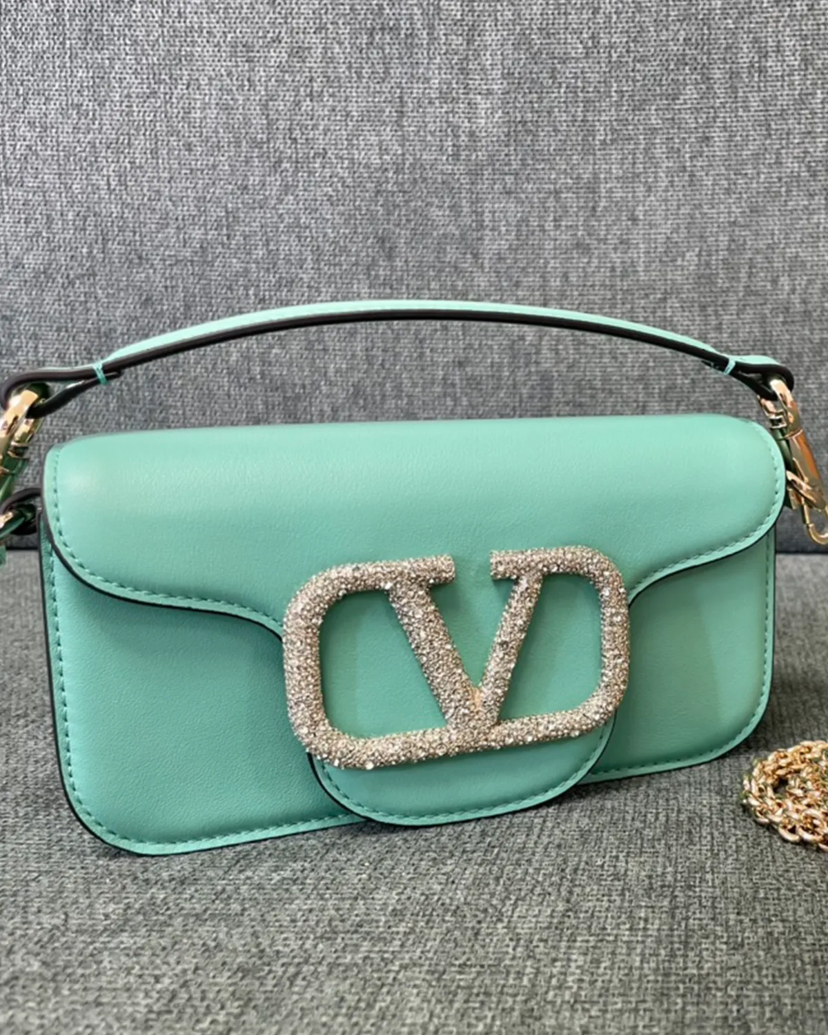 The undisputed star is the “V” logo closure. Paved with precision-cut crystals (Swarovski style), it transforms the magnetic clasp into a piece of fine jewelry. Against the deep green leather, the crystals pop with extraordinary brilliance, adding a three-dimensional sparkle that elevates the bag from an accessory to an objet d’art.