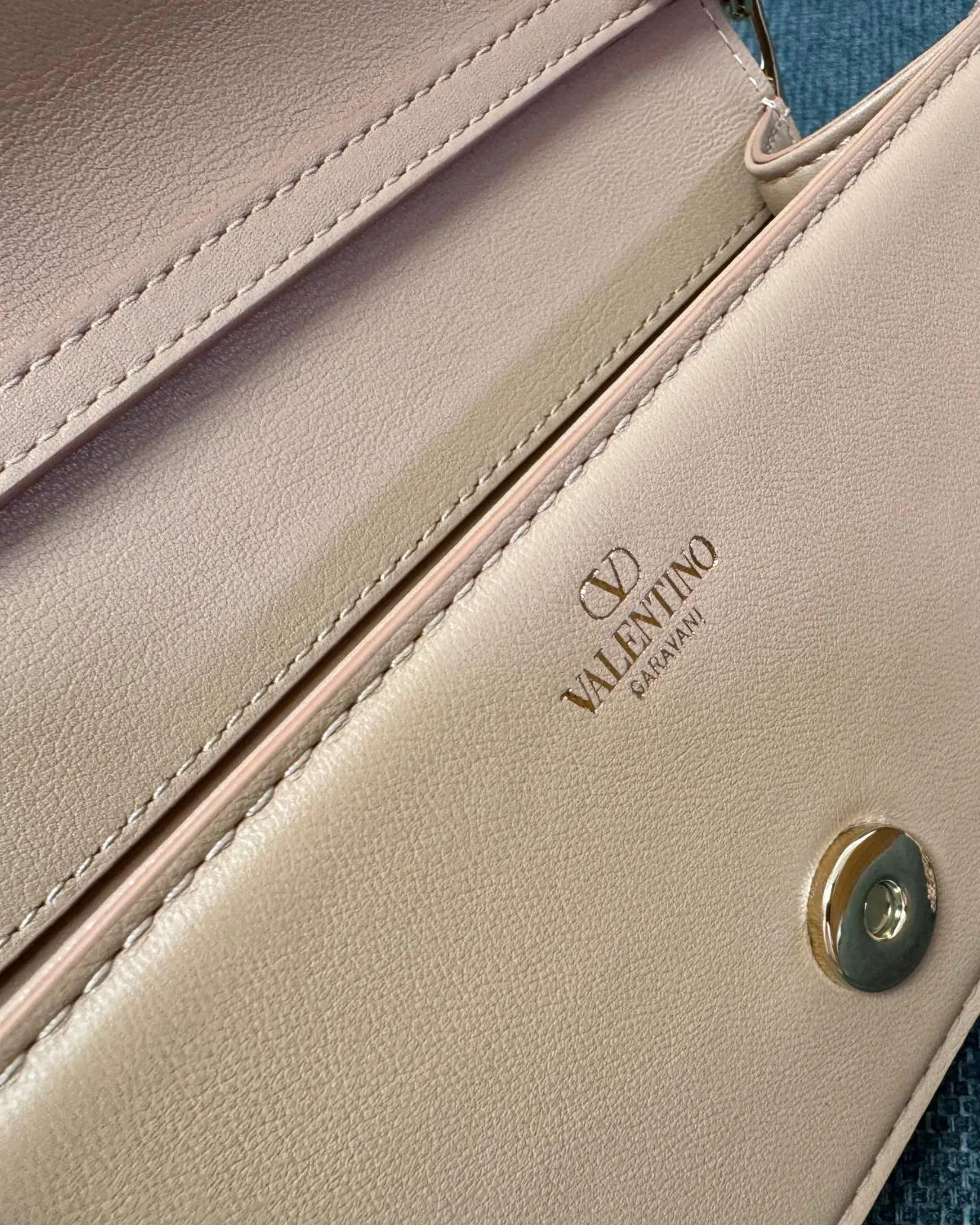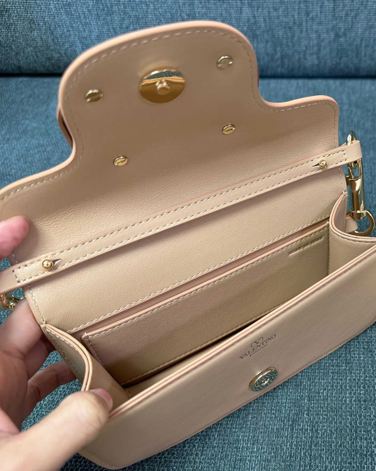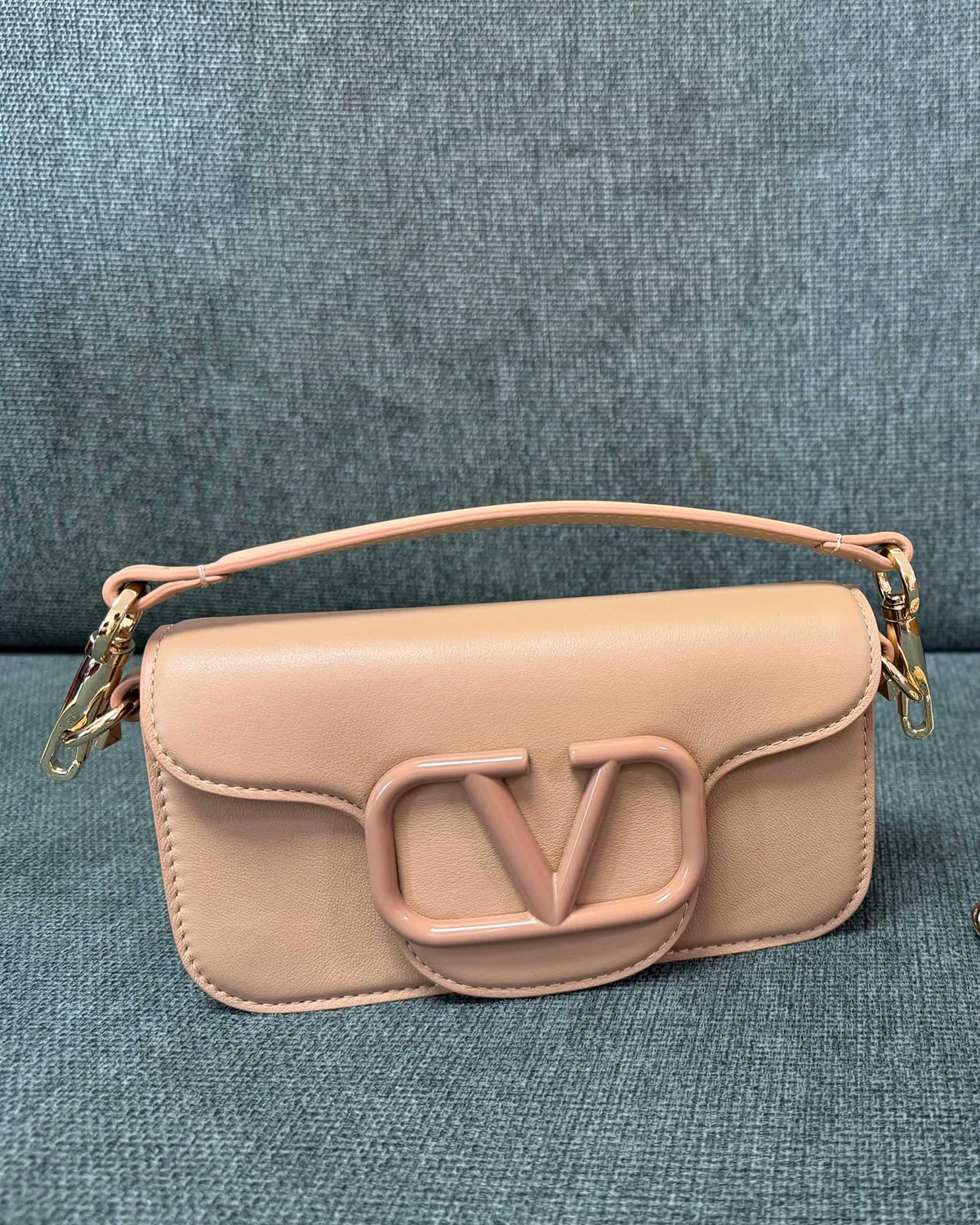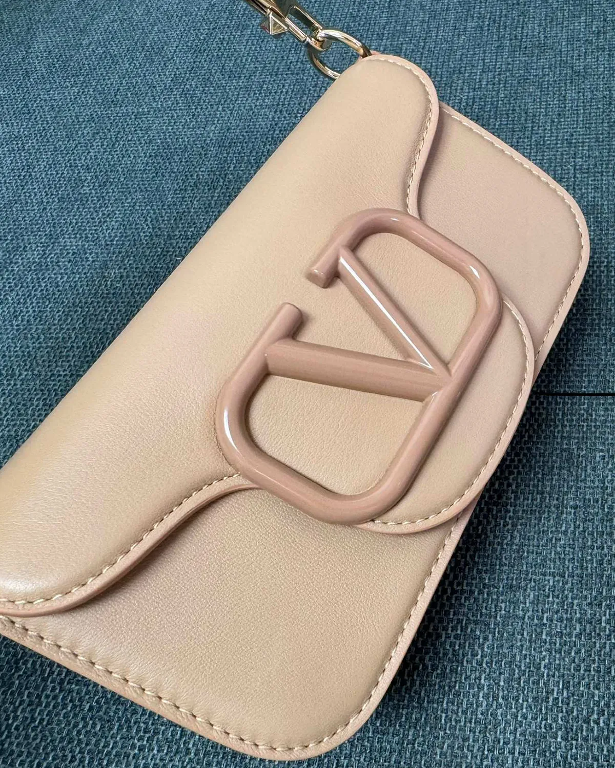 Anchoring the flap is the iconic V-logo signature in polished gold-tone metal. It acts as the jewelry centerpiece of the bag, providing a bold, graphic contrast to the minimalist leather background. The magnetic closure underneath ensures secure and easy access to your essentials.