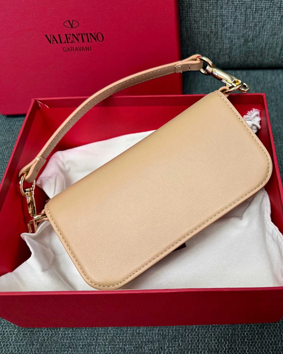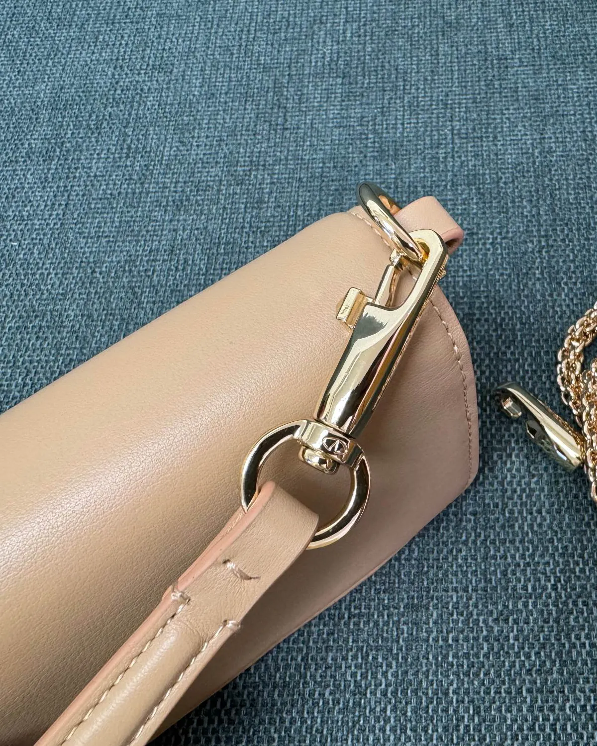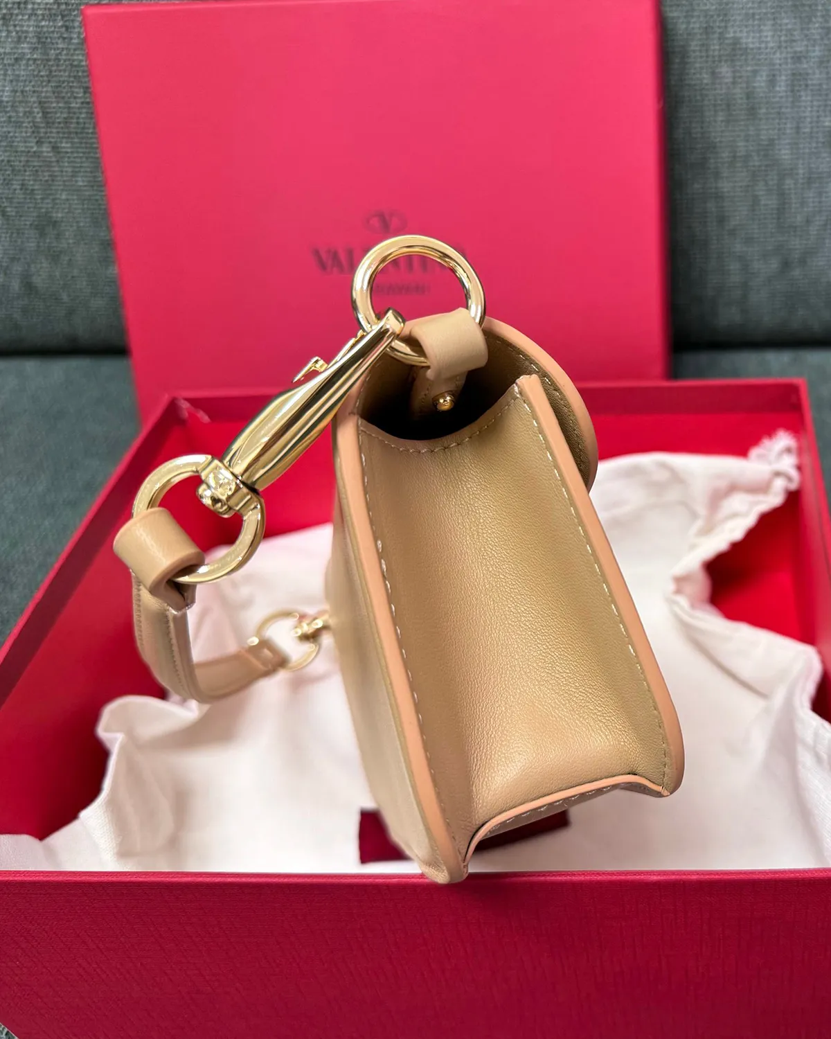 The body is crafted from high-grade smooth calfskin, selected for its flawless finish and soft sheen. The “Neutral” colorway—a blend of beige, cream, and rose powder—is sophisticated and warm. This leather is rigid enough to maintain the bag’s sharp rectangular lines while feeling supple to the touch.