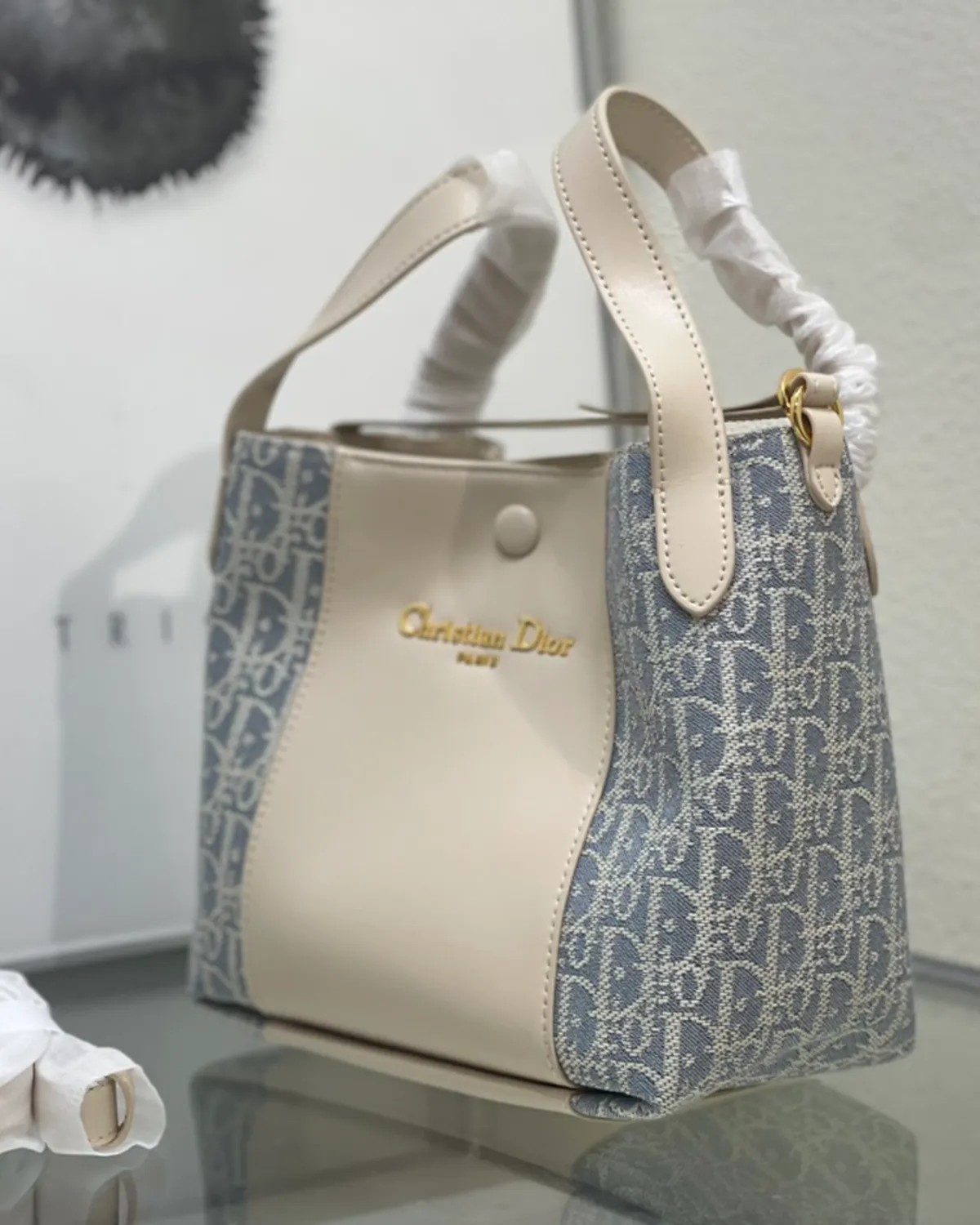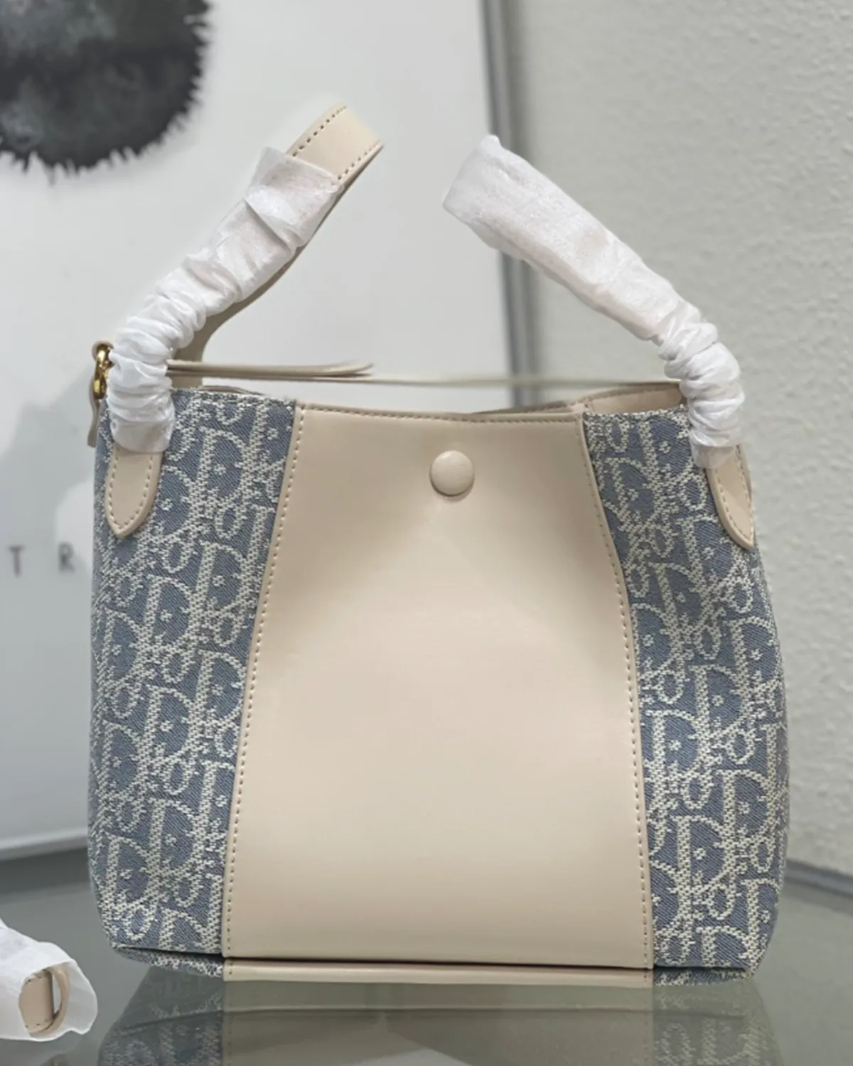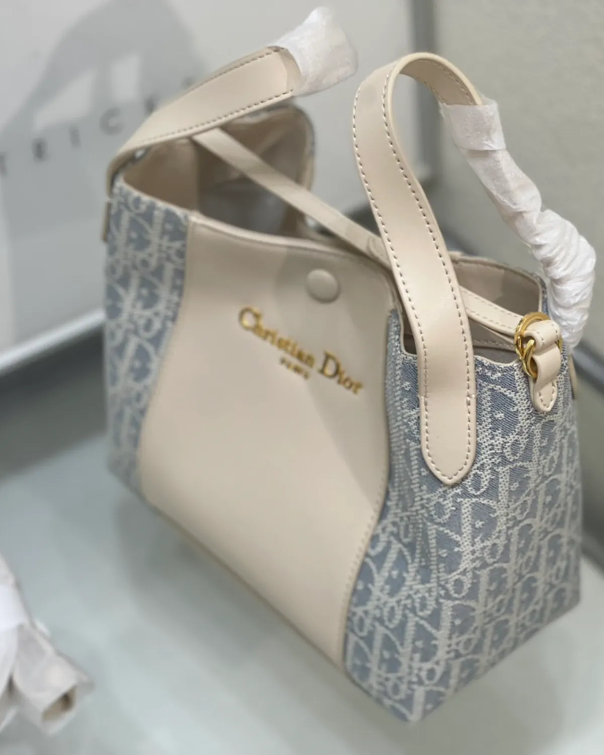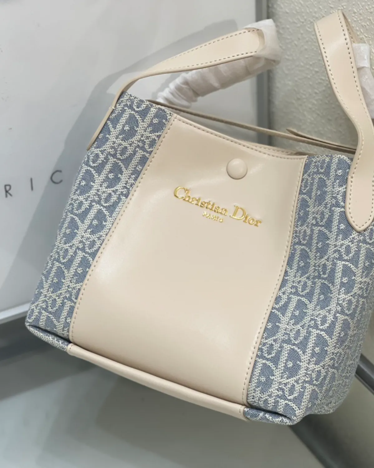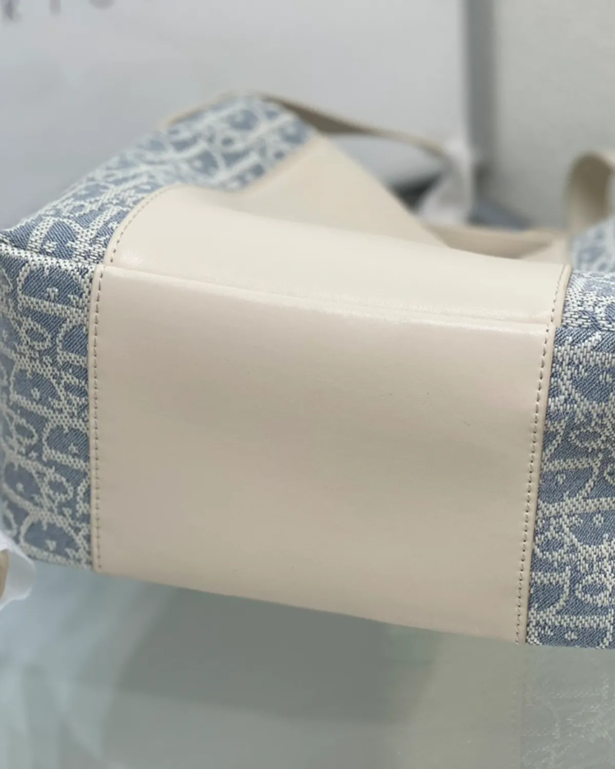 The body is crafted from a unique “Chambray” fabric, created by weaving white and blue threads together to achieve a soft, mottled finish similar to high-end denim. Despite its relaxed look, the fabric is densely embroidered with the house’s signature geometric motif, creating a fascinating contrast between the casual ground and the raised, 3D stitching.