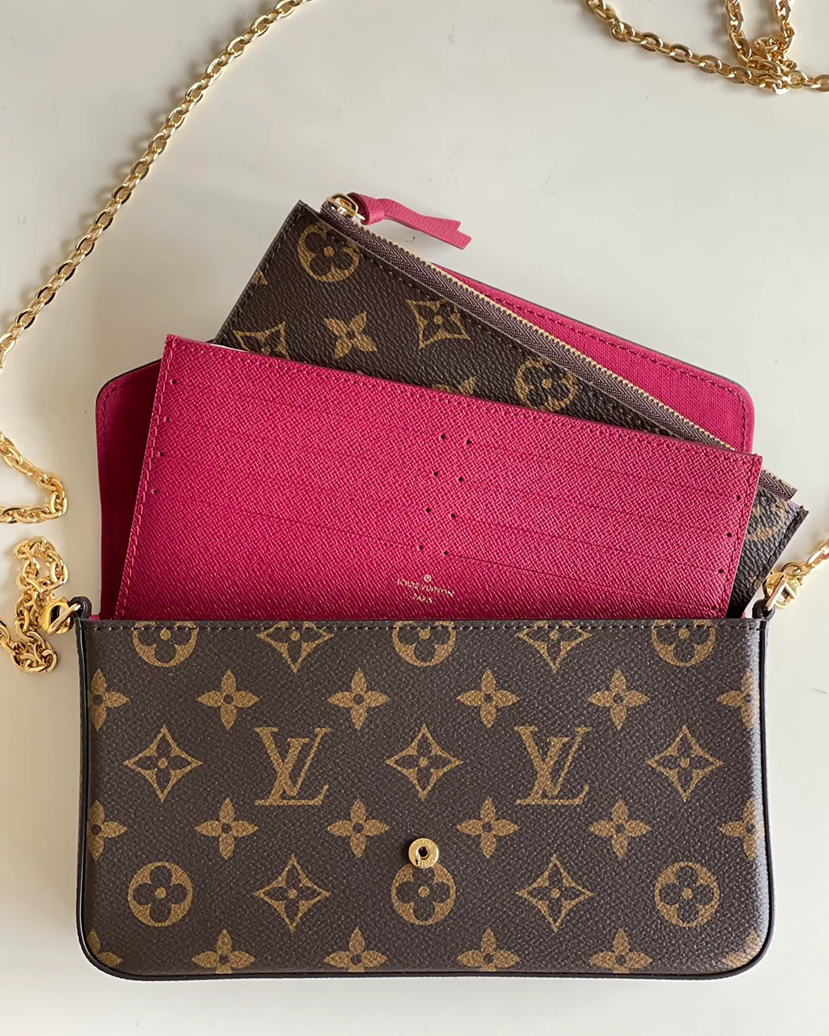 The Signature Envelope Chain Pouch is the answer to the modern dilemma of “what to carry.” It is a masterclass in modular design, offering the elegance of a classic evening clutch with the practicality of a daily wallet. The timeless brown canvas exterior gives way to a surprise burst of vibrant Fuchsia pink inside, adding a playful, personal touch every time you open it.