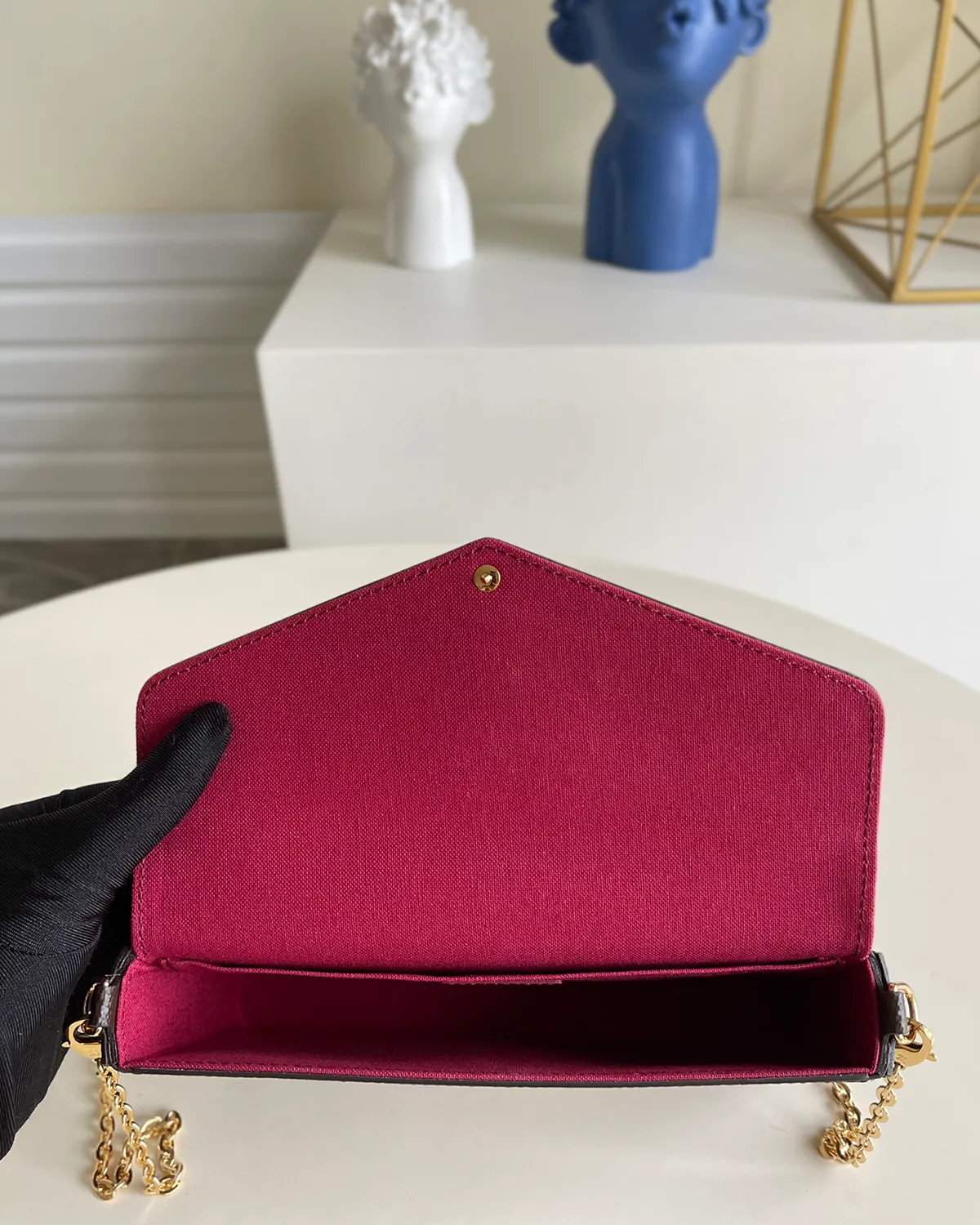 The delicate gold-tone chain is fully removable. When attached, it offers a chic shoulder or crossbody drop that sits lightly on the body. When removed, the bag transforms into a sleek, streamlined envelope clutch, perfect for formal events or dinner dates.