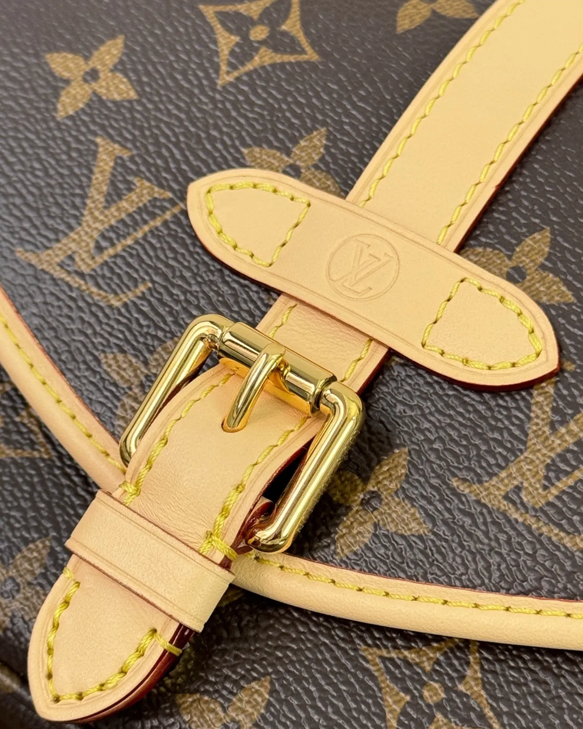 The body is wrapped in the iconic coated canvas, framed by rich natural cowhide leather (Vachetta). The defining feature is the vertical leather strap that runs down the front, secured by a polished gold-tone buckle. While it looks like a traditional buckle, it often conceals a modern magnetic closure for effortless access to your essentials.