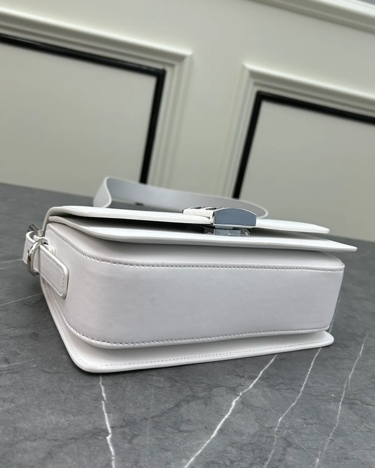 The body is crafted from premium “Box” calfskin, chosen for its flawless, semi-matte finish and ability to hold a sharp shape. The neutral colorway—ranging from cappuccino to soft ivory—highlights the quality of the hide, creating a sophisticated canvas that pairs with any palette. The leather is sturdy yet supple, aging gracefully over time.