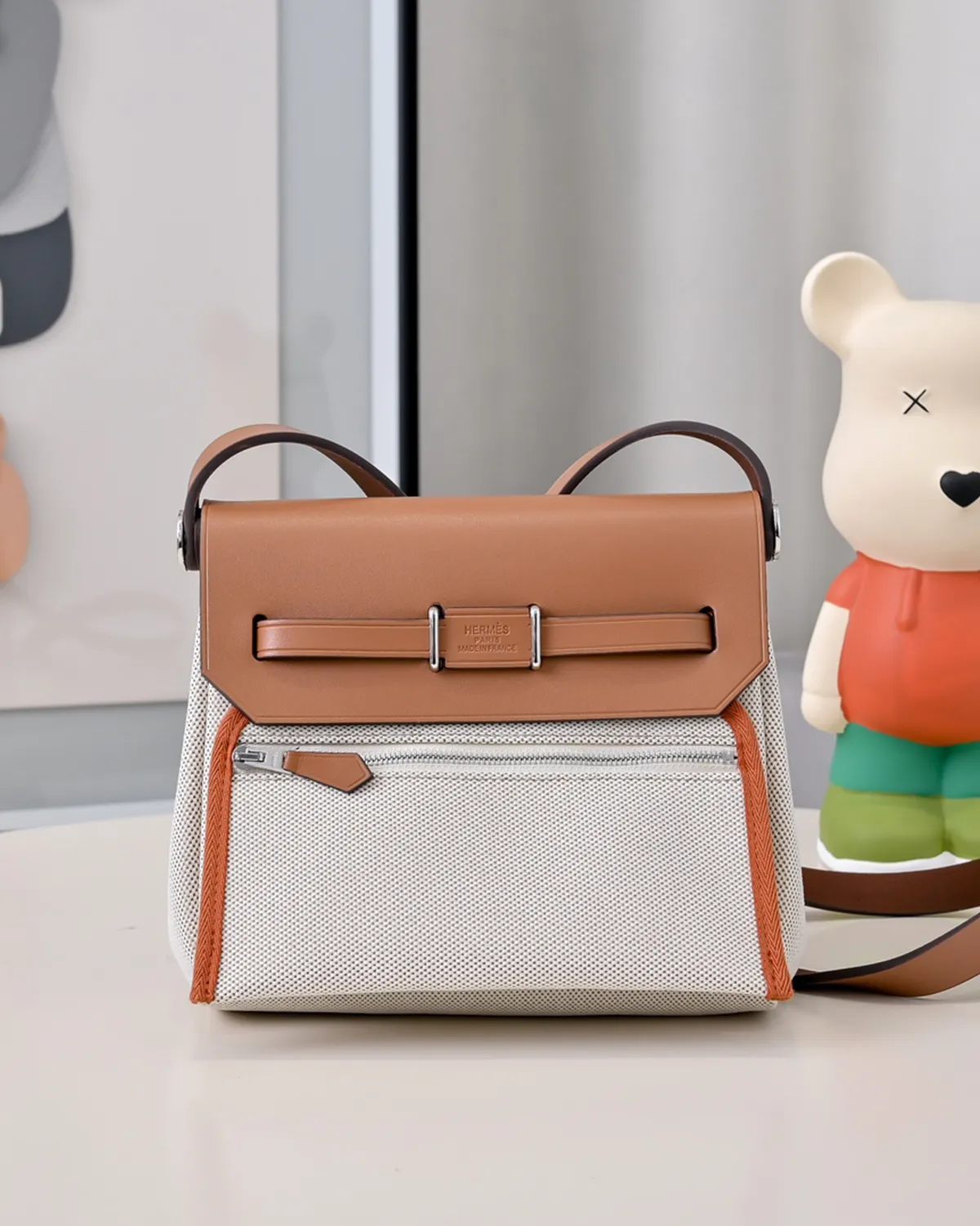 Structuring the canvas is “Fauve” saddle leather (often Barenia or Vache Hunter). This smooth, golden-brown hide is the most traditional of all leathers, smelling faintly of earth and wax. It frames the bag, forms the sturdy handles, and creates the flap, promising to develop a magnificent patina that darkens and richens with every use.