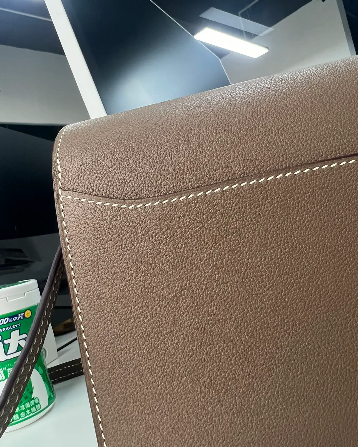 The wallet is crafted from Epsom or Tadelakt leather, chosen for their ability to hold a rigid shape. This ensures the clean, rectangular lines of the wallet remain sharp over time, resisting the softening that occurs with lesser leathers. The beige tone is versatile and chic, hiding inside a bag or carried as a mini clutch.