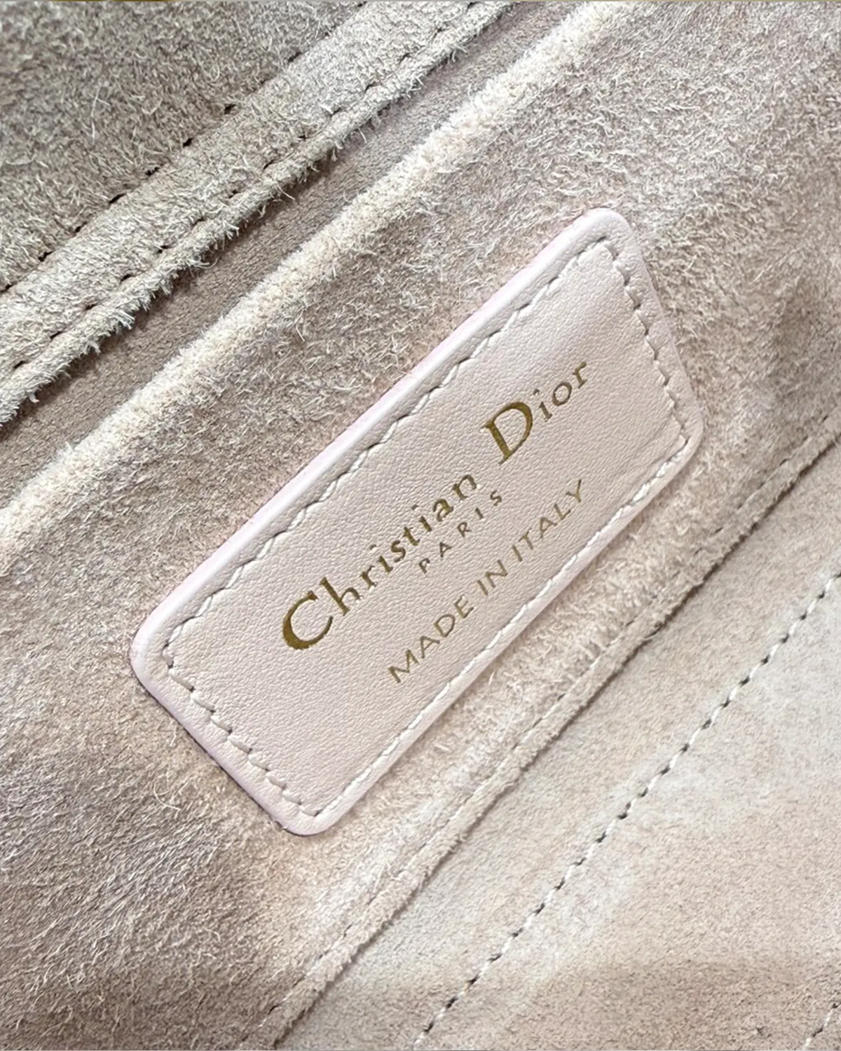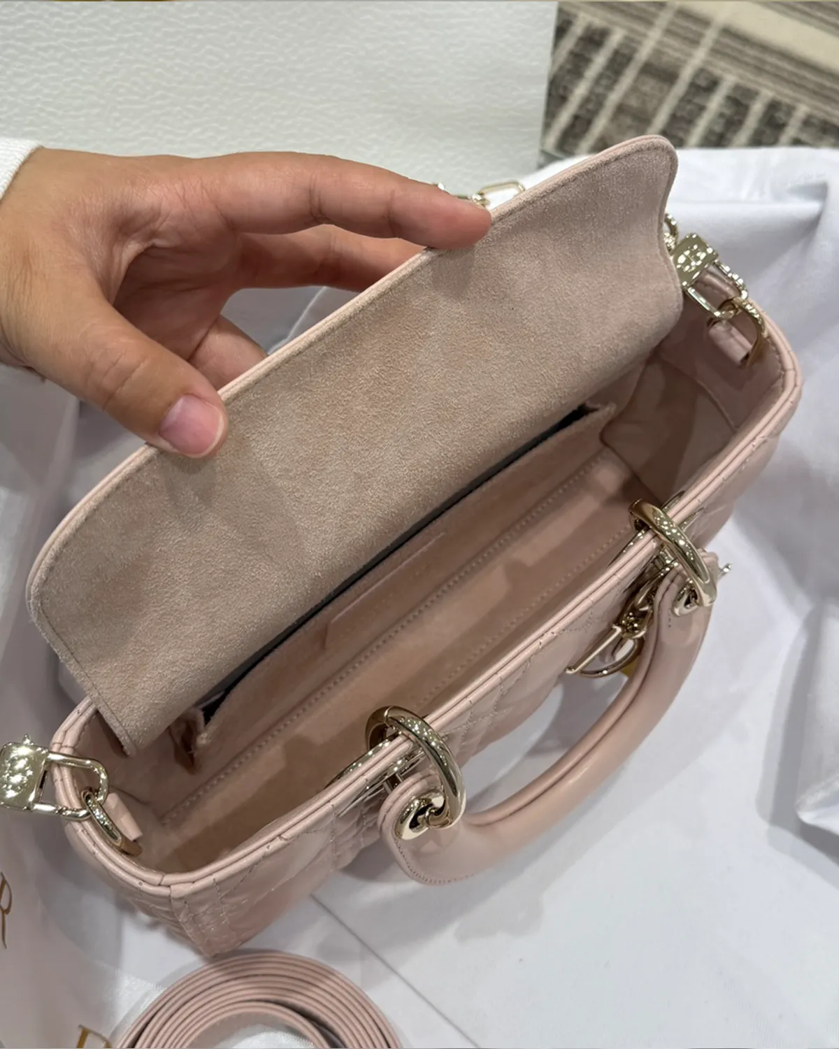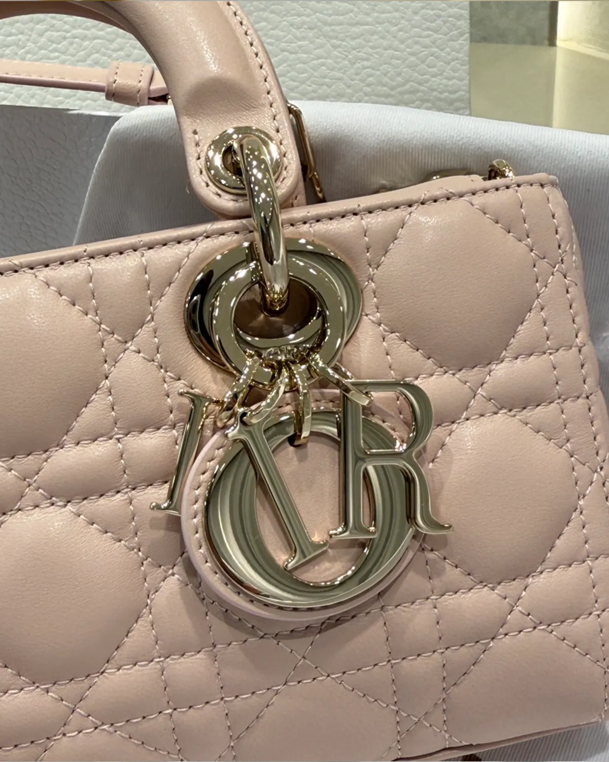 The body is wrapped in exquisite lambskin, chosen for its smooth grain and delicate hand-feel. The “Powder Pink” colorway is a sophisticated neutral-pink that pairs beautifully with denim or evening wear. The signature “Cannage” topstitching creates a quilted geometric pattern, adding volume and texture that catches the light beautifully.