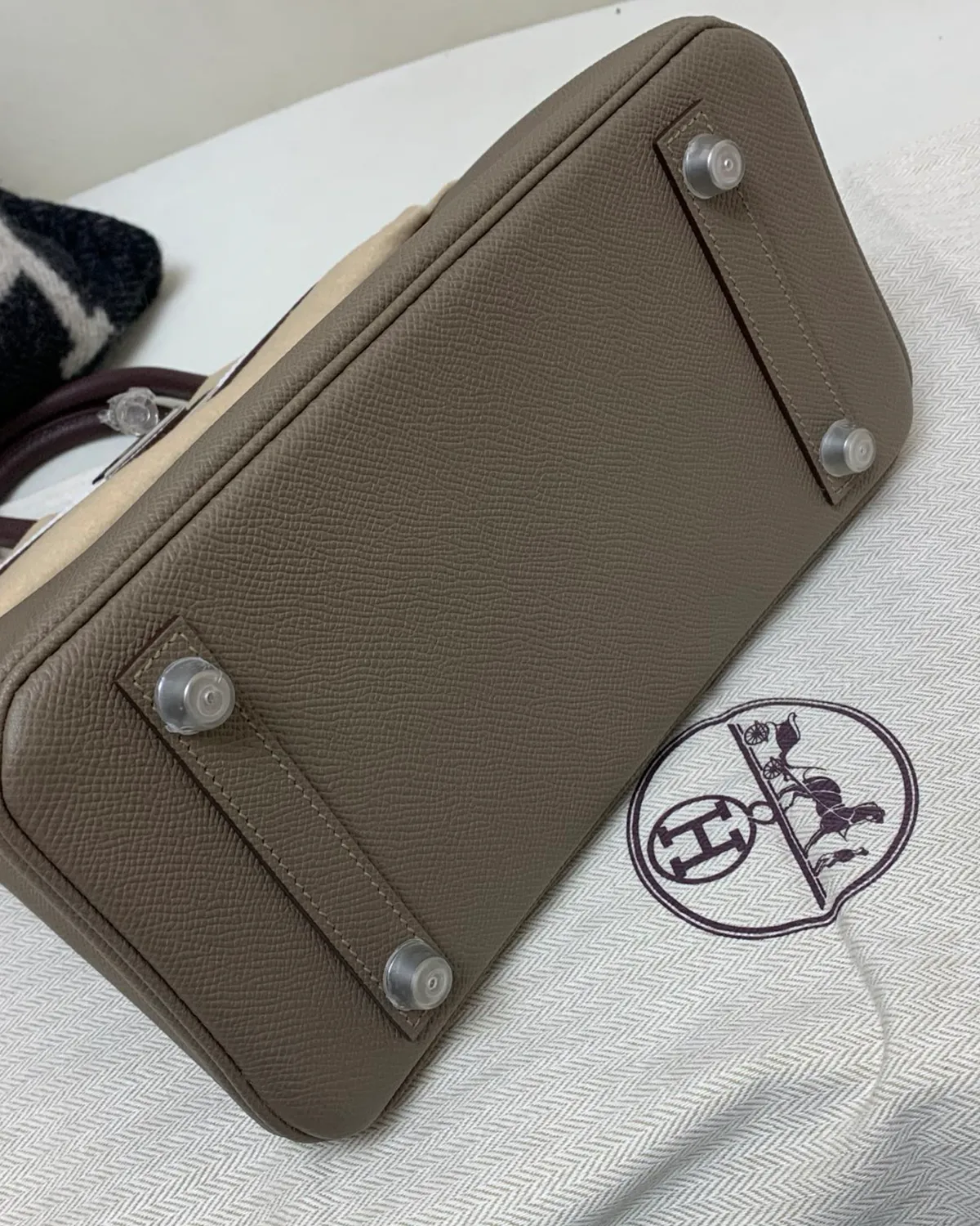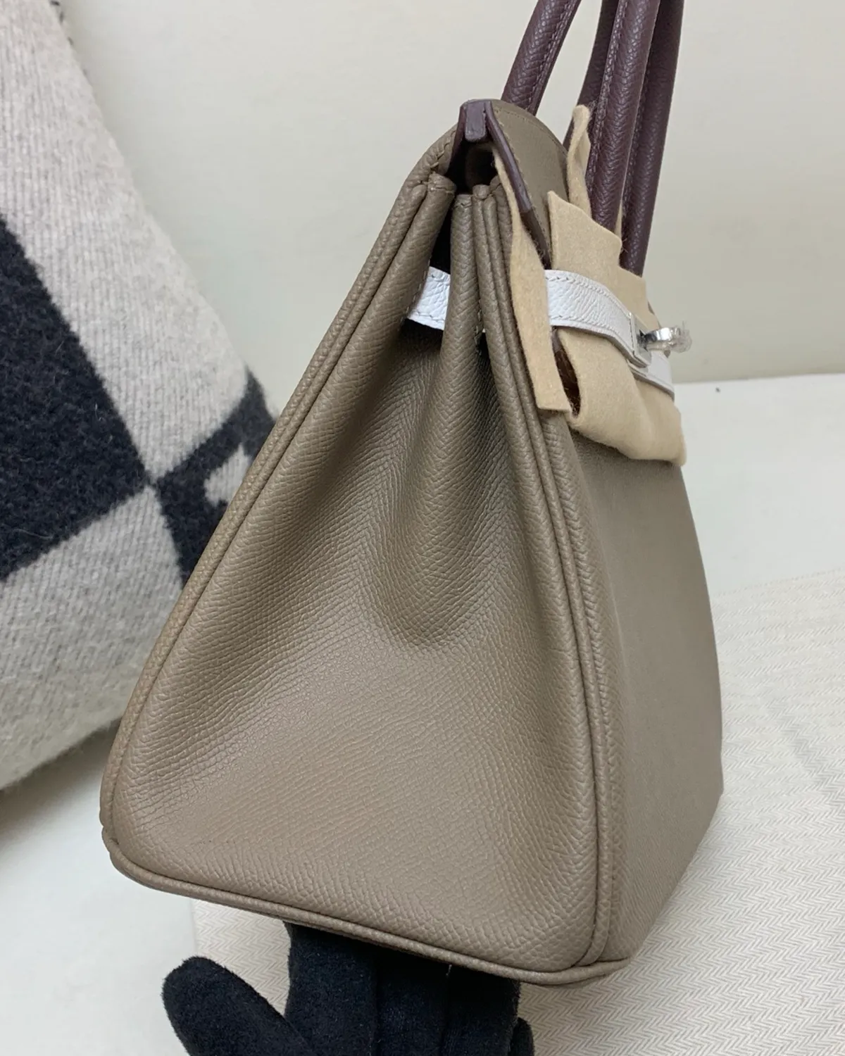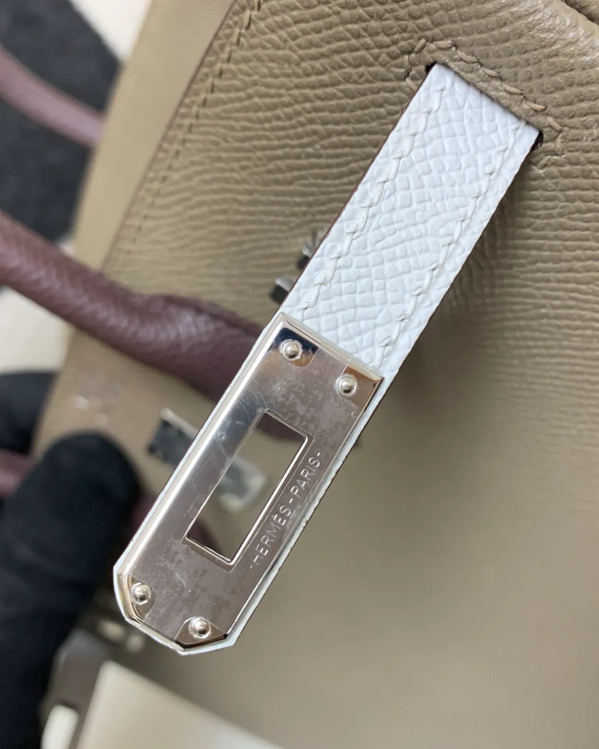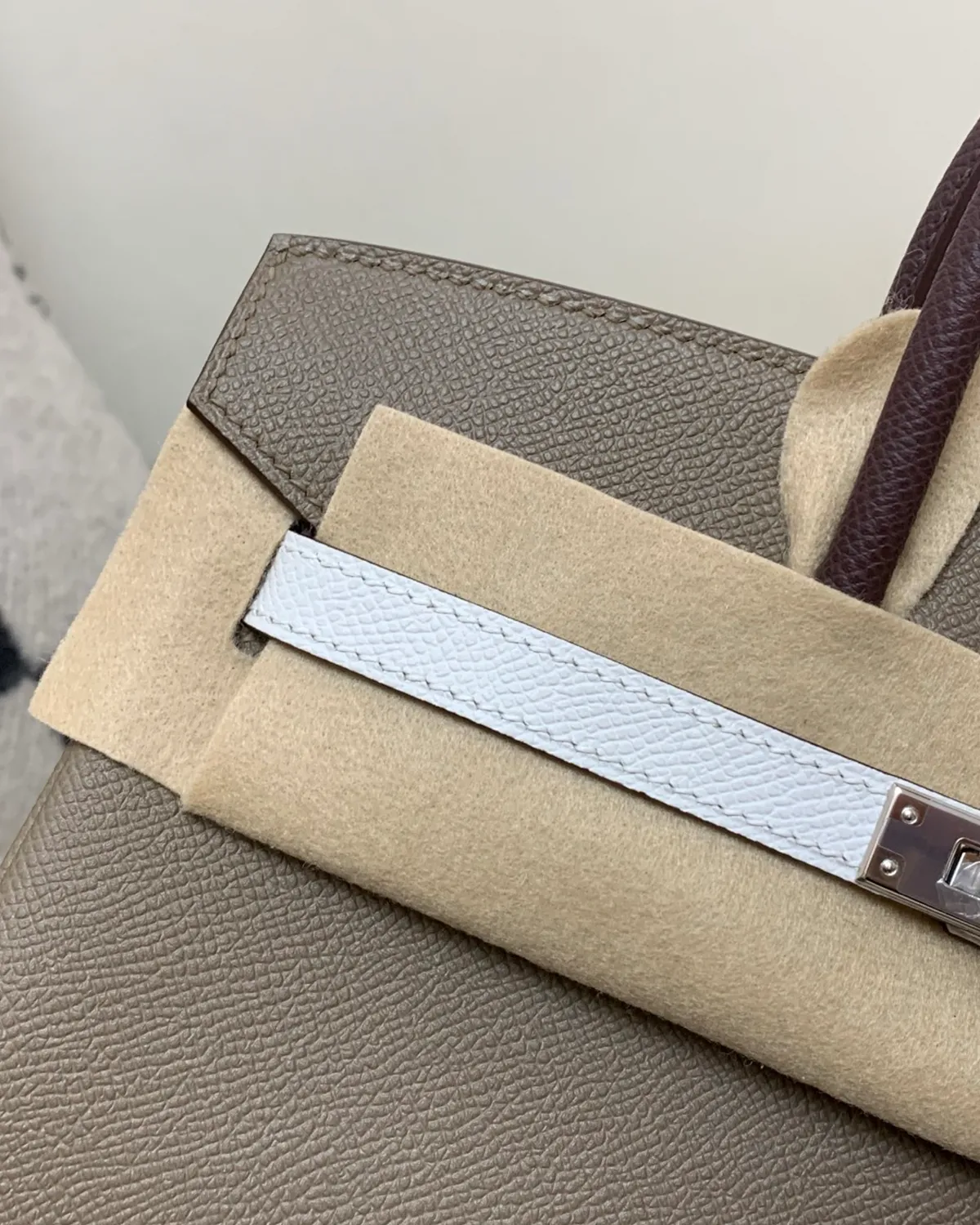 What sets Etoupe apart is the use of white thread for the saddle stitching. This high-contrast detail outlines the architectural geometry of the bag, highlighting the precision of the hand-stitched seams. It adds a sporty, equestrian edge to the refined Togo leather, showcasing the artistry that goes into every piece.