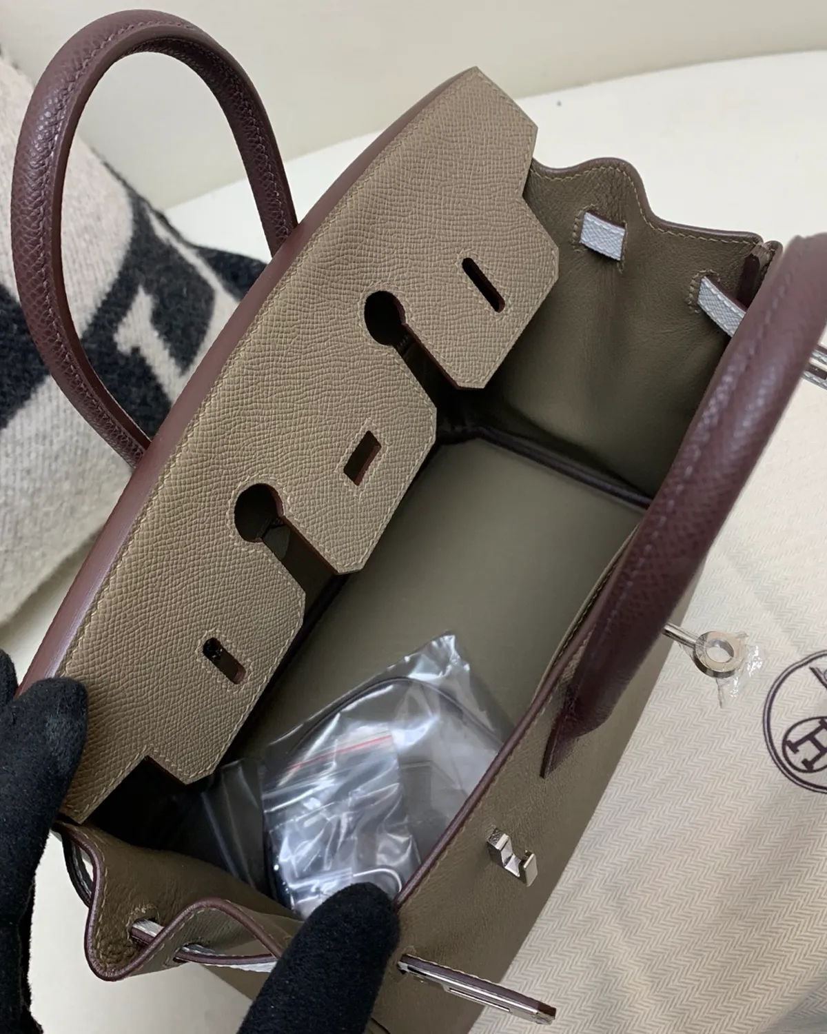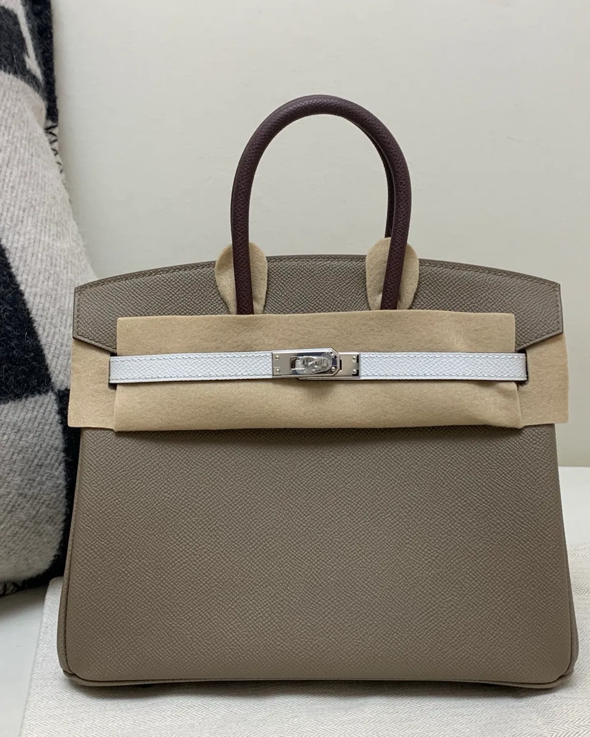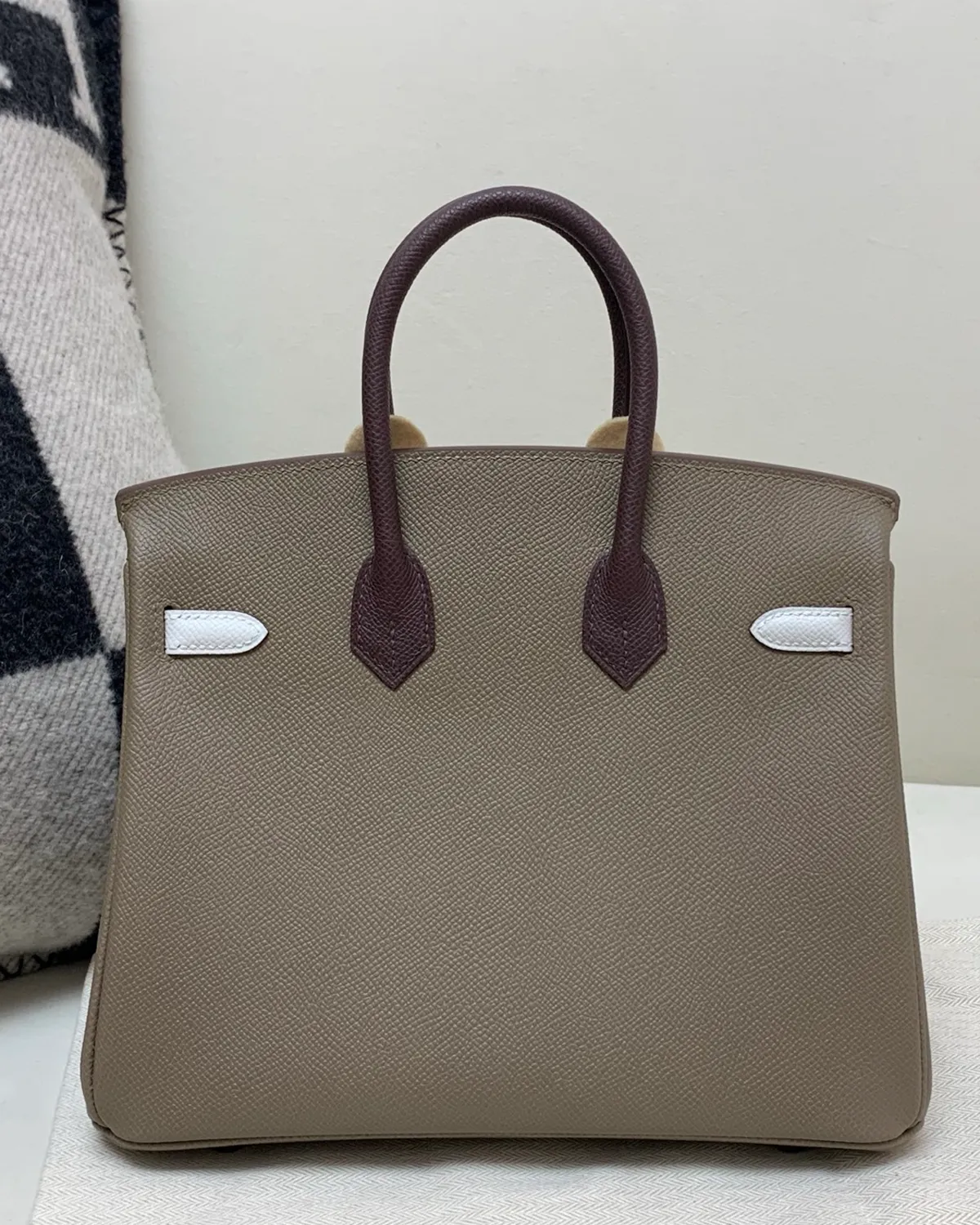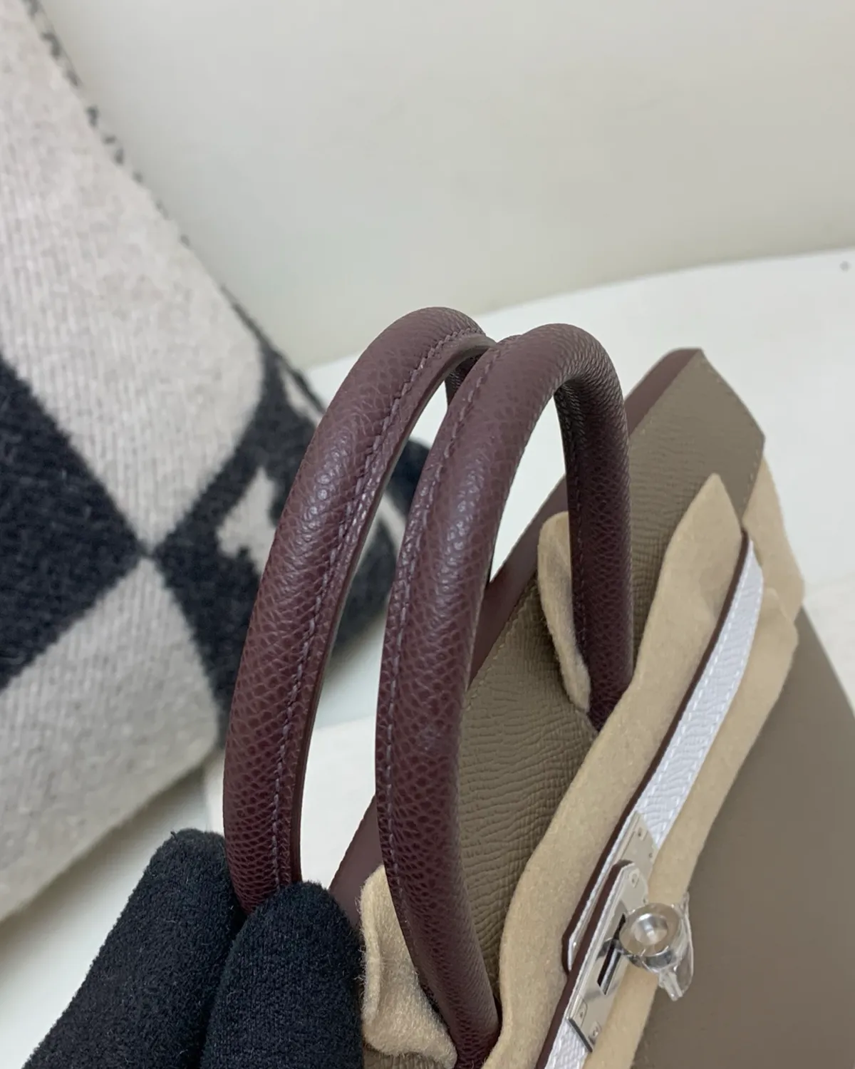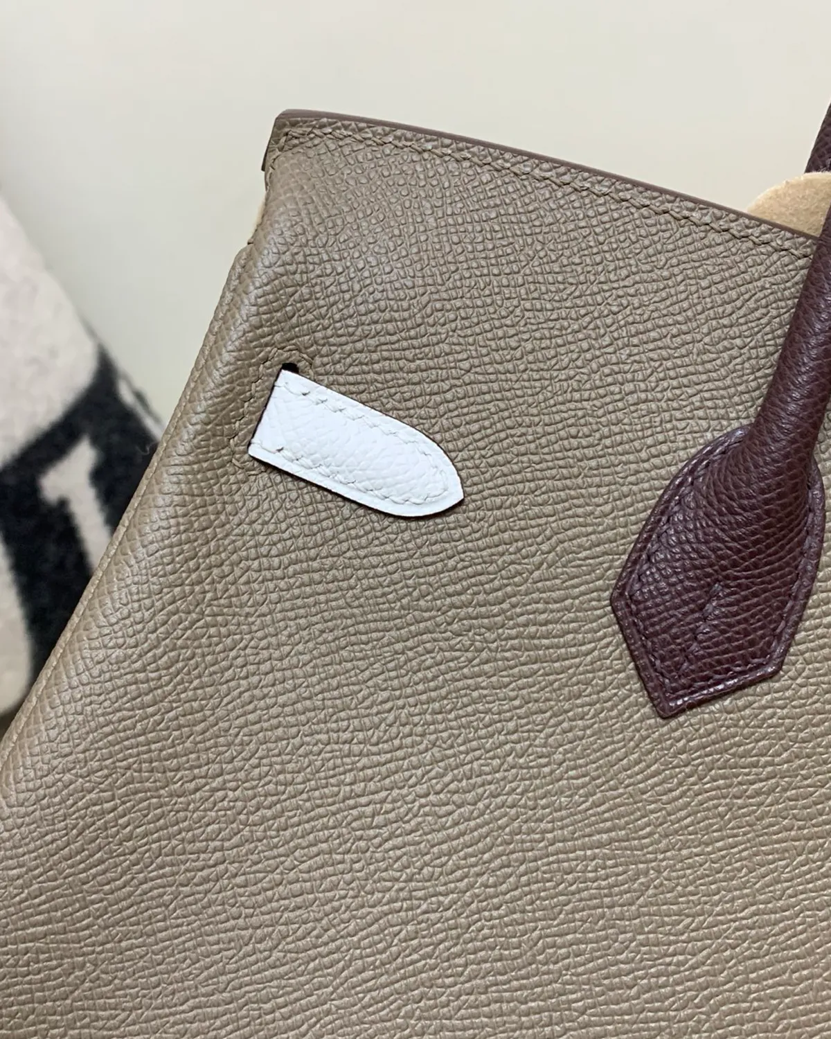 What sets Etoupe apart is the use of white thread for the saddle stitching. This high-contrast detail outlines the architectural geometry of the bag, highlighting the precision of the hand-stitched seams. It adds a sporty, equestrian edge to the refined Togo leather, showcasing the artistry that goes into every piece.