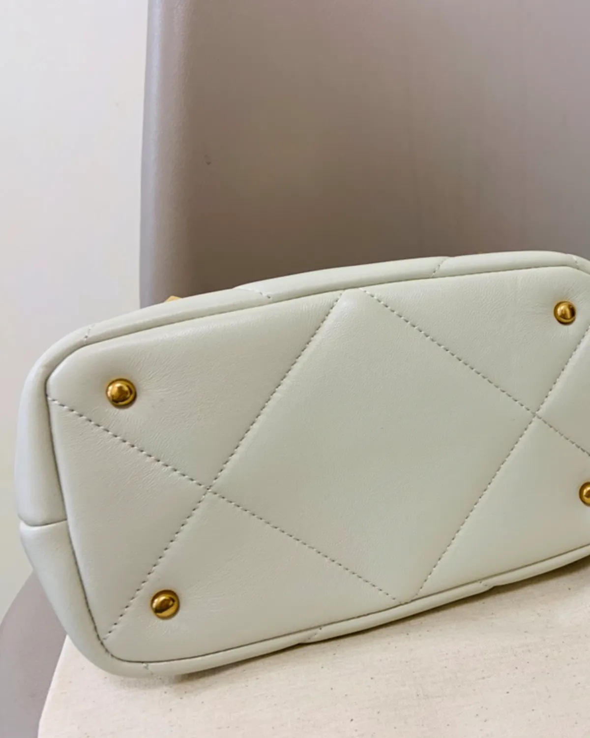 The oversized pyramid studs are finished in “Antique Brass.” This warm, burnished gold tone feels vintage and sophisticated, avoiding the harshness of shiny hardware. The studs are strategically placed to accentuate the intersection of the quilts, serving as bold jewelry points that catch the light.