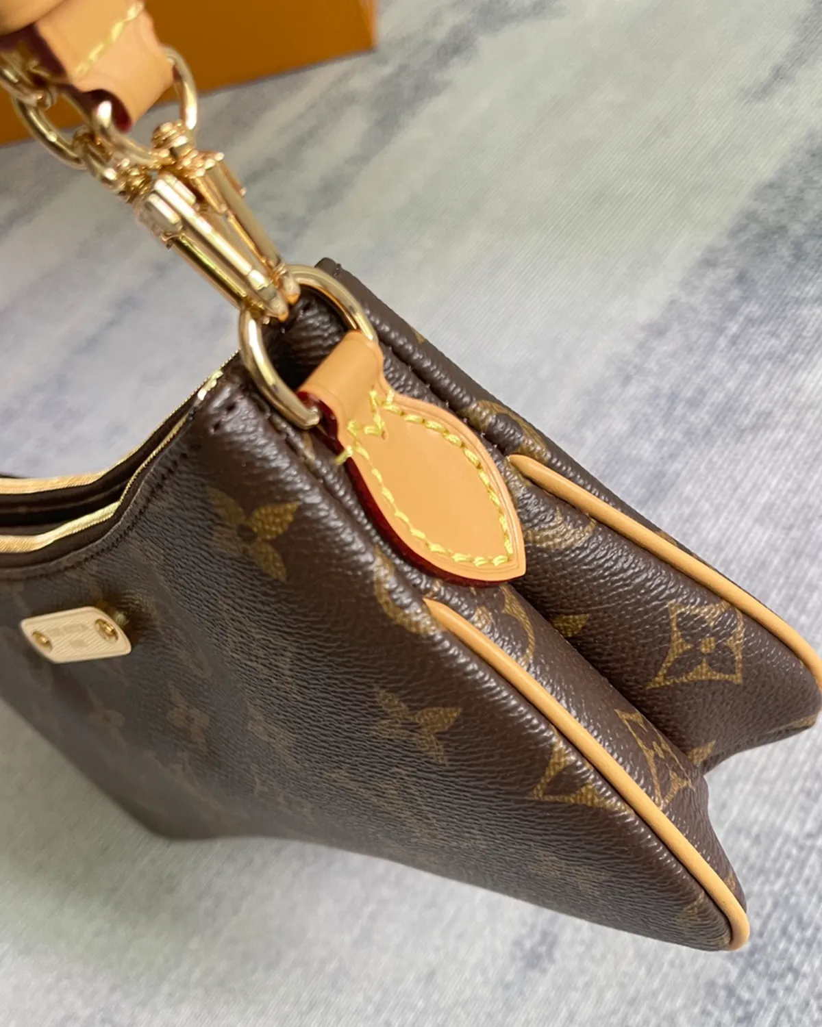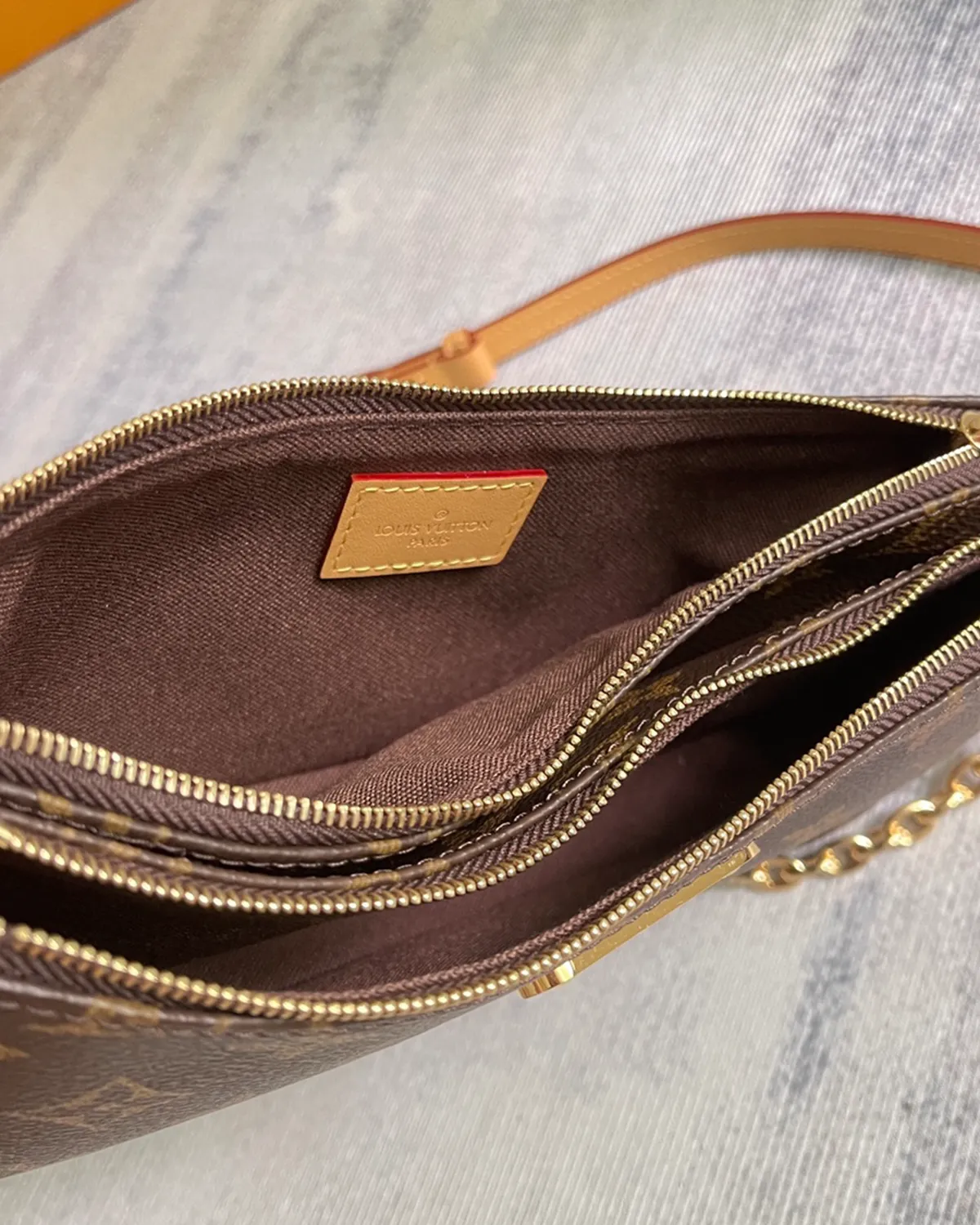 The front flap is secured by a hidden magnetic closure, allowing for effortless one-handed access to your essentials. The flap is accented by a discreet gold-tone metal plate engraved with the brand’s signature, adding a touch of jewelry-like shine to the classic monogram canvas face.