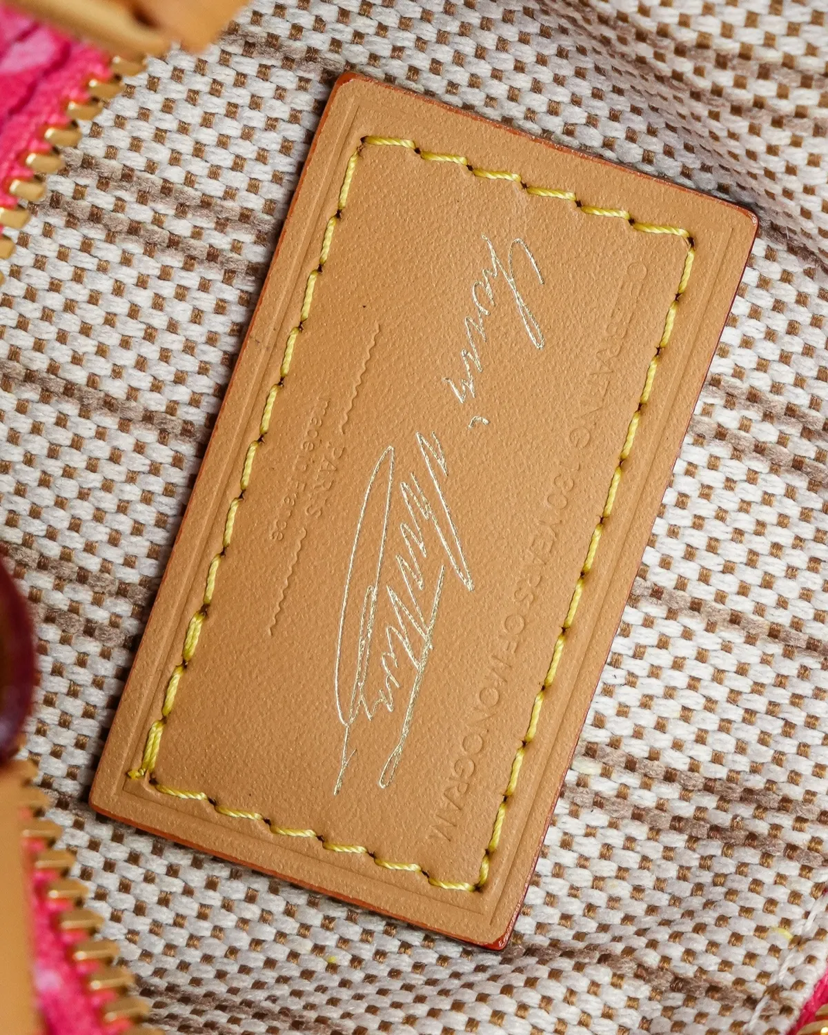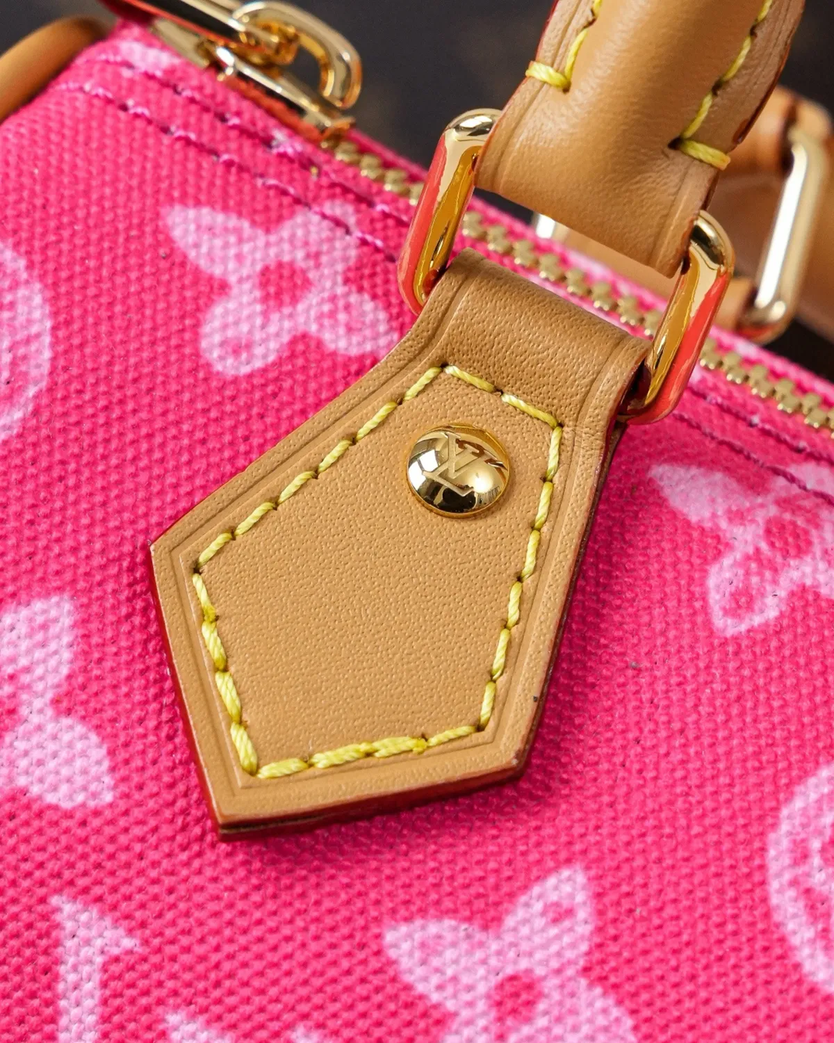 The body features a unique variation of the iconic coated canvas. The background is a warm, sandy beige, while the motifs are rendered in a soft white or light brown. This “dune-inspired” colorway feels fresh and modern, pairing beautifully with the natural cowhide leather (Vachetta) trim that frames the petite silhouette.