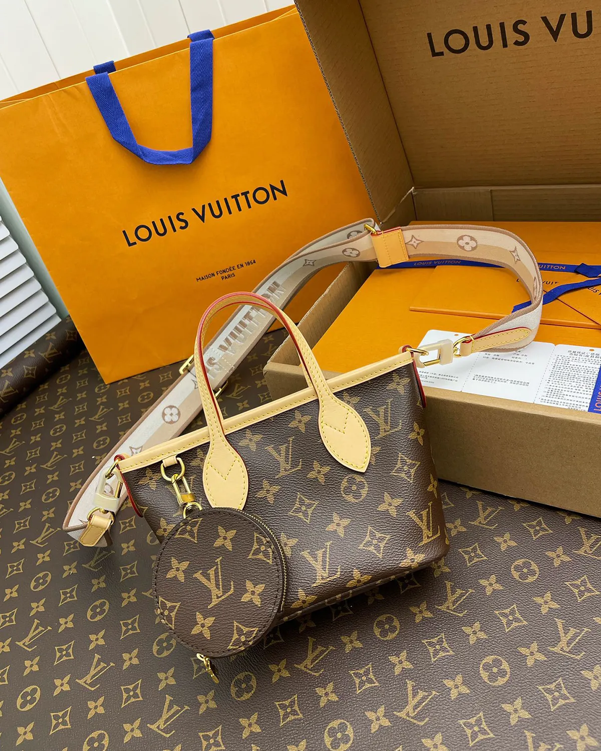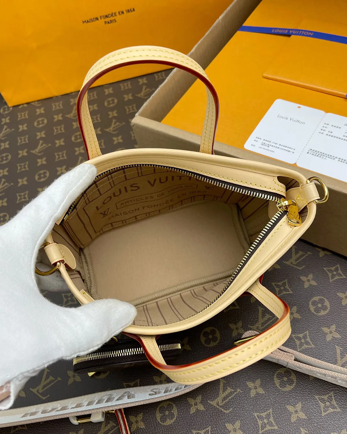 Despite its “Mini” categorization, the open-top design allows for surprising capacity. It easily fits a large smartphone, wallet, and sunglasses. The interior is lined in a soft beige textile that matches the strap, keeping the aesthetic light and airy.