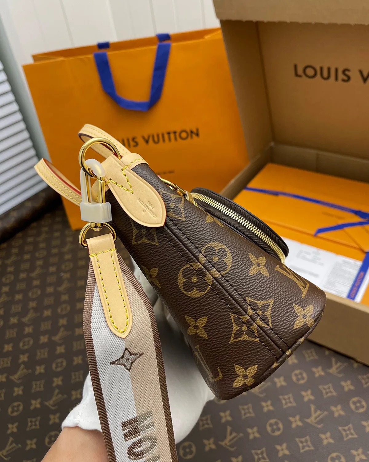 What defines this modern edition is the strap. It features a wide, removable textile shoulder strap woven with the brand’s signature motifs in beige. Attached to the strap is a playful, removable round coin purse—perfect for storing keys, coins, or earbuds. This addition gives the classic bag a sporty, streetwear edge.
